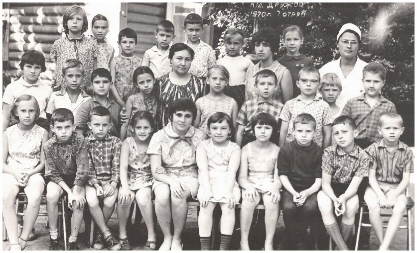 RESTORATION MAP: Focus heavily on the upper right corner to eliminate the large chemical burn/light leak over the nurse's head and the handwriting ("п/л Дружба 1970г."). Remove the vertical scratches on the left edge near the log cabin wall. Repair all micro-tears and surface grain throughout the bottom foreground and chair legs.