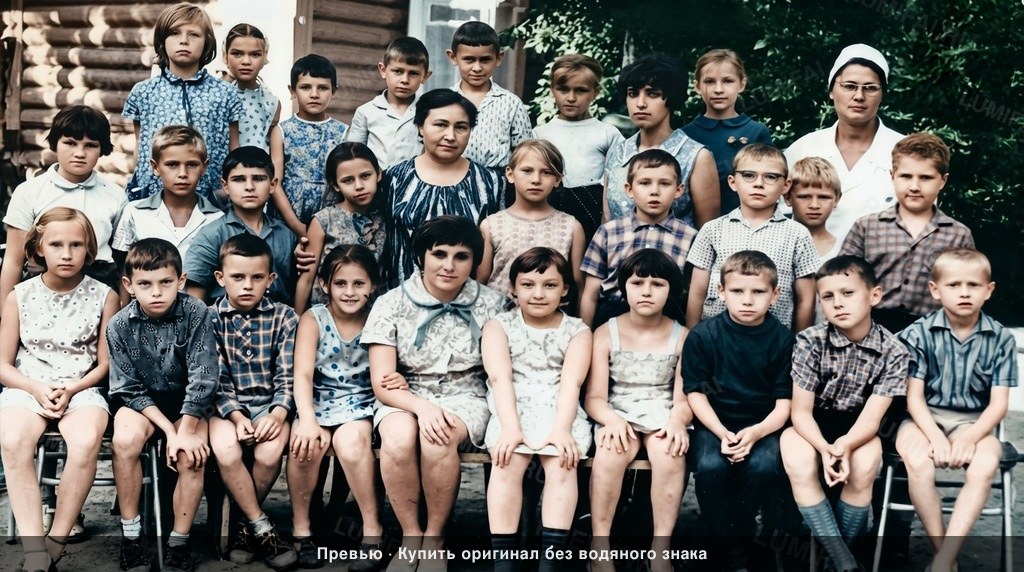 CLOTHING: Restore damage and colorize clothing with high-level detail, showing fabric weave and stitching. Use historically accurate 1970s Soviet textiles: muted cotton prints, checked/plaid button-downs in faded blues, browns, and reds, and the starched white of the nurse's cap and uniform. The heavy patterning on the dresses must remain sharp and distinct, not blurred.