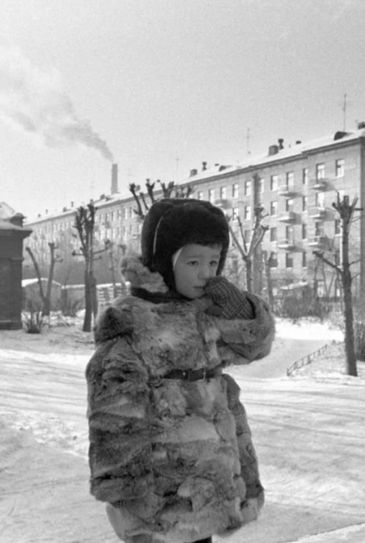 Colorize and enhance this photograph as follows: - The photo depicts one child, approximately 5-7 years old, standing on a snowy street. - The child is wearing a thick fur coat with dark accents, likely dark brown or grey, and a fur hat in dark colors—potentially black or dark brown. - The child's skin tone should be a natural, warm beige. - The gloves appear knitted and should be a muted color, such as grey or soft beige. - The setting is a snowy, urban street in the Soviet Union, likely during the 1960s. - Residential buildings in the background should be colored in muted tones—light grey or sepia-tinted, typical of buildings from that era. - The sky should be overcast with light desaturated greys, reflecting a cold winter day. - The snow should remain white with hints of light blue-grey shadows. - The chimneys in the background should produce subdued grey smoke. - The photo appears grainy and slightly out of focus; enhance it for clarity and sharpness, while retaining the natural film-era tonal quality. - Ensure all colors are desaturated to mimic the look of the period while avoiding over-brightness and excessive contrast. ABSOLUTE RULES — NEVER VIOLATE: - DO NOT add, invent, or hallucinate any part of the image that is not in the original (do not extend cropped areas, do not fill missing parts with invented content) - DO NOT change the framing or composition — if the photo is cropped, keep it cropped exactly the same way - DO NOT add any new damage, folds, creases, tears, dark borders, vignettes, or artifacts - DO NOT colorize — if the photo is black and white, the output must be black and white - DO NOT change, replace, or alter any person's face, body, or identity - DO NOT add or remove any person or object - DO NOT modernize clothing, hairstyles, or any visual elements - ONLY fix what is already damaged — remove existing scratches, tears, stains, fading - Keep the exact same framing, crop, and aspect ratio as the original