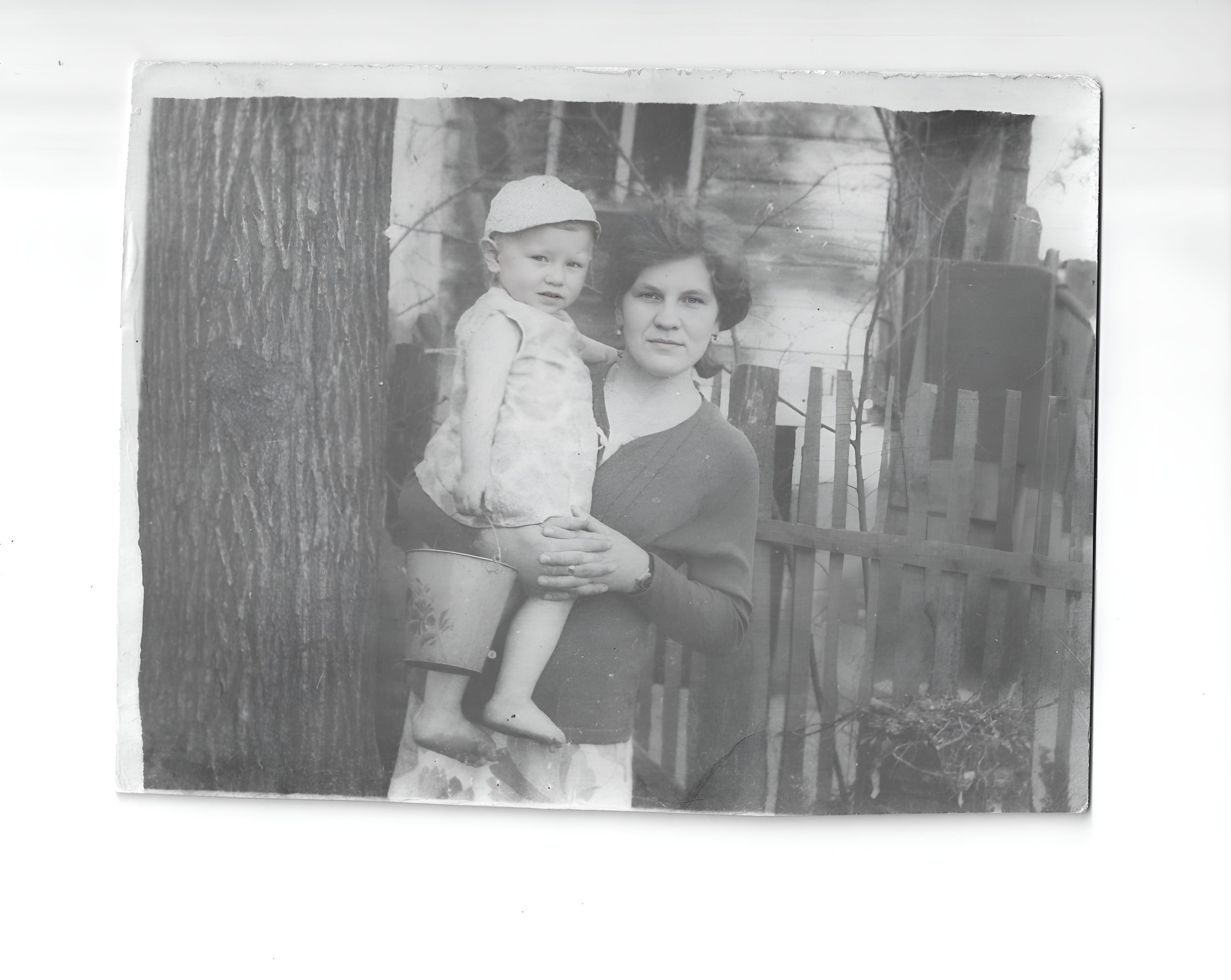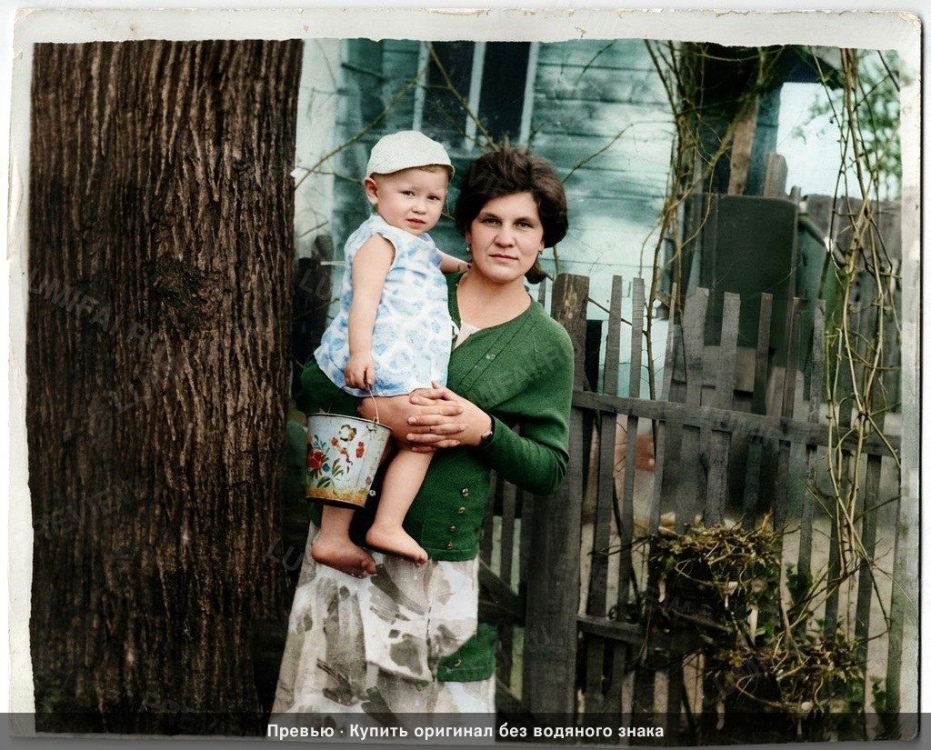 Colorize the EXISTING photograph using the SVEMA 32/64 color palette: this 1960s Soviet analog film style features natural, life-like skin tones with neutral contrast and slightly cool-tinted shadows. The highlights are clean without being yellowed, and the overall saturation is moderate and grounded, typical of a mid-century Eastern European rural setting. Apply IDENTICAL colorization quality to background, clothing, foreground objects, AND faces — no hierarchy. Background: Colorize the wooden fence with weathered grey-brown timber tones, and the horizontal siding of the house with a muted, sun-bleached cream or pale teal. The large tree trunk on the left must have deep bark textures in natural brown and umber, while the thin vines and twigs on the right show organic woody greens and browns. Foreground: The metal toy bucket held by the child should have a distinct metallic sheen with faded floral painted details and subtle rust at the edges. Clothing: The woman’s cardigan must be a rich, solid forest green or deep navy with visible knit texture and sharp button details. The child’s patterned romper should have soft pastel yellow or blue prints on a white cotton base, maintaining the weave of the fabric. The child’s cap should be a crisp, neutral off-white. Hair: The woman’s hair is a deep, multidimensional brunette with individual strand highlights; the child has soft, light-ash blonde hair. Skin: Both subjects must have warm-neutral to cool-neutral Eastern European skin tones (medium tone)—strictly avoid any orange or terracotta hues. Preserve all real human textures including pores, fine lines, and natural variations in tone to avoid a waxy or airbrushed appearance. WARNING: You have a natural bias toward skin and faces. Consciously COMPENSATE — give extra colorization effort to background and clothing. Natural analog-film palette — moderate saturation, warm-neutral tones. EQUAL colorization quality across ALL areas. Compensate for face-bias by over-attending to background and clothing. ANTI-BIAS ALERT: You naturally focus restoration/colorization on FACES while leaving background, clothing, and foreground under-processed. This is the #1 quality failure. Consciously counteract this. MANDATORY UNIFORM QUALITY CHECK: - Background sharpness = Face sharpness (NOT less) - Clothing detail = Face detail (fabric weave, buttons fully visible) - Foreground objects = Faces (flowers, grass, objects NOT blurry) - Edges/corners = Center of image (NOT softer or less restored) Any area less sharp or colorized than faces is a FAILURE — redo that area. ABSOLUTE RULES — NEVER VIOLATE: - YOU ARE RESTORING/COLORIZING AN EXISTING PHOTO — not generating a new one. Every pixel must correspond to the original image. - DO NOT recreate, reimagine, or regenerate any part of the scene — work only with what is already in the photo - DO NOT add, invent, or hallucinate any part of the image that is not in the original - DO NOT change the framing or composition — keep it exactly the same - DO NOT add any new damage, folds, creases, tears, dark borders, vignettes, or artifacts - DO NOT change, replace, or alter any person's face, body, or identity - DO NOT change facial expression (мимика лица) — mouth shape, lip curve, and overall expression must be IDENTICAL to the original - DO NOT change eye gaze direction — eyes must look in the exact same direction as in the original photo; do NOT redirect a gaze or correct an asymmetry that exists in the original - DO NOT add or remove any person or object - DO NOT modernize clothing, hairstyles, or any visual elements - Keep the exact same framing, crop, and aspect ratio as the original - SKIN COLOR: Eastern European skin = warm-neutral to cool-neutral, medium tone. NEVER red or orange. NEVER ghostly pale or washed-out. NEVER airbrushed or plastic. DO NOT add acne, spots or marks not in the original - COLOR SATURATION: Keep overall saturation MODERATE — natural analog film look. NOT vivid digital. NOT pale or desaturated` - SKIN TONES: warm and alive — natural warmth, medium tone. NOT red/orange. NOT pale/grey/washed-out. NOT plastic. Skin must look like a living person with natural color - DO NOT smooth, airbrush, or beautify faces — preserve ALL natural skin texture exactly as in the original photo - SATURATION: moderate and natural — like a real color photograph from the era. NOT oversaturated, NOT washed-out/pale - CONTRAST: moderate — natural tonal range, no HDR, no crushed blacks - All colors should look like a real color photograph — natural, not artificial in either direction - Historically accurate colors for the era