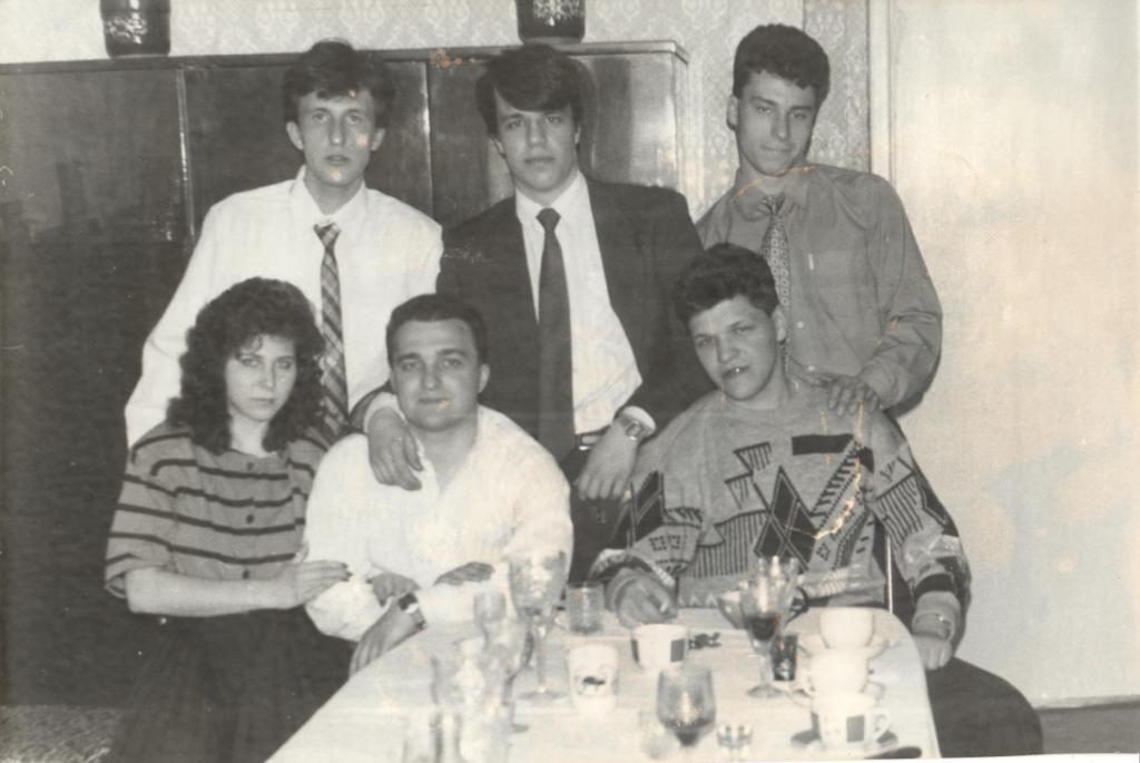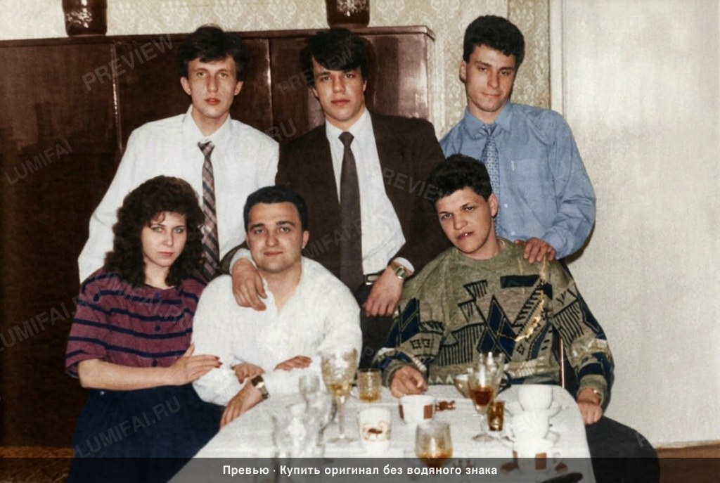 Colorize the EXISTING photograph using the SVEMA 130 / ORWO Color NC color palette: this film features moderate saturation with natural warm-neutral skin tones and slightly cool midtones, creating a grounded, realistic look typical of Soviet-era photography. IDENTIFY REGION/ERA: This is a late 1980s Soviet (CIS) interior. The furniture is a classic dark wood-veneer "Stenka" cabinet; the clothing includes a patterned Coogi-style knit sweater and 1980s haircuts. DAMAGE MAP: Chemical yellowing and staining are concentrated on the right side and upper-right corner. Vertical scratches run through the center and right-most male subjects. Small white dust marks and "snow" are peppered across the dark background cabinet. Faint creasing is visible near the table's edge. BACKGROUND: Apply maximum restoration to the dark wooden wall unit; remove all white dust spots and chemical stains. Colorize the wood with deep, semi-glossy brown tones. Restore the floral wallpaper on the right, applying a muted beige or off-white with fine-pattern detail. Background must be as sharp and detailed as the faces. FOREGROUND/TABLE: Restore the glassware and ceramic cups on the table, removing all haze. Colorize the liquids in the glasses (amber for spirits, clear for water). The white tablecloth must show crisp fabric texture without being overexposed. Restore the specific details of the patterned mugs and the objects on the table with high sharpness. CLOTHING: Apply aggressive restoration to the knit sweater on the bottom-right; restore the geometric texture and colorize with muted 1980s tones (earthy greens, browns, or blues). Restore the fabric weave on the white shirts and the dark blazer in the center. The striped blouse on the left should show distinct contrast between colors (e.g., navy and burgundy) with visible stitching. Colorize the ties with subtle patterns. EDGES/CORNERS: Fix the heavy chemical orange-vignette staining in the upper-right and right-edge. Clean the border area for absolute clarity. Ensure corner sharpness matches the center. FACES: Restore skin by removing scratches and grain while preserving ALL real pores, lines, and textures. Skin must be warm-neutral (NOT orange, NOT ghostly white), reflecting a healthy Soviet-era person. Maintain the natural iris depth and sharp hair strands for all six individuals. WARNING: COMPENSATE for the natural AI bias toward faces by applying extra restoration and colorization effort to the background cabinet, foreground glassware, and intricate sweater patterns. Natural analog-film palette — moderate saturation, warm-neutral tones. ALL areas processed with EQUAL quality. ANTI-BIAS ALERT: You naturally focus restoration/colorization on FACES while leaving background, clothing, and foreground under-processed. This is the #1 quality failure. Consciously counteract this. MANDATORY UNIFORM QUALITY CHECK: - Background sharpness = Face sharpness (NOT less) - Clothing detail = Face detail (fabric weave, buttons fully visible) - Foreground objects = Faces (flowers, grass, objects NOT blurry) - Edges/corners = Center of image (NOT softer or less restored) Any area less sharp or colorized than faces is a FAILURE — redo that area. ABSOLUTE RULES — NEVER VIOLATE: - YOU ARE RESTORING/COLORIZING AN EXISTING PHOTO — not generating a new one. Every pixel must correspond to the original image. - DO NOT recreate, reimagine, or regenerate any part of the scene — work only with what is already in the photo - DO NOT add, invent, or hallucinate any part of the image that is not in the original - DO NOT change the framing or composition — keep it exactly the same - DO NOT add any new damage, folds, creases, tears, dark borders, vignettes, or artifacts - DO NOT change, replace, or alter any person's face, body, or identity - DO NOT add or remove any person or object - DO NOT modernize clothing, hairstyles, or any visual elements - Keep the exact same framing, crop, and aspect ratio as the original - SKIN COLOR: Eastern European skin = warm-neutral to cool-neutral, medium tone. NEVER red or orange. NEVER ghostly pale or washed-out. NEVER airbrushed or plastic. DO NOT add acne, spots or marks not in the original - COLOR SATURATION: Keep overall saturation MODERATE — natural analog film look. NOT vivid digital. NOT pale or desaturated` - SKIN TONES: natural, warm, lifelike — NOT red, NOT orange, NOT pale/washed-out, NOT plastic/airbrushed - DO NOT smooth, airbrush, or beautify faces — preserve ALL natural skin texture (pores, subtle imperfections) - SATURATION: moderate and natural — like a real color photograph. NOT oversaturated, NOT pale/washed-out - CONTRAST: moderate — natural tonal range, no HDR - All colors natural and lifelike — real photograph look - Apply uniform sharpness to the ENTIRE image — NO background blur