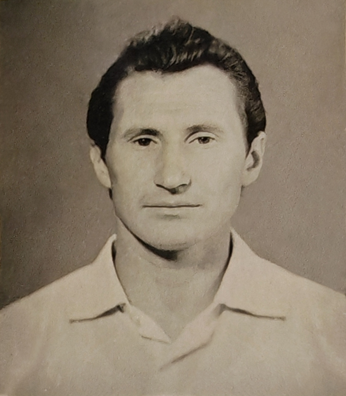 Apply uniform technical enhancement to this scanned image — treat every pixel region identically regardless of content. DO NOT use face detection, face restoration, or face-specific enhancement algorithms. Faces are NOT special regions — treat them exactly like walls, sky, furniture, or any background element. The enhancement quality must be identical across faces, background, clothing, and all other areas. Sharpen, denoise, and recover full micro-detail in the studio backdrop. Remove all grain and stippling patterns from the background wall, making the gradient transition smooth yet crisp. This area must be as sharp as any face. Sharpen and recover detail in the hair, treating ہر hair strand as an individual geometric element. Recover micro-detail in the dark values of the hair to eliminate crushing while maintaining deep contrast. In the white collared shirt, sharpen the fabric texture, seams, and collar points. Recover highlight detail to show the weave of the material without blowing out the white values. Enhance the definition of the collar edges against the neck and the background. Repair and sharpen all four corners of the frame. Remove the slight vignetting and age-related fading at the edges to ensure uniform clarity from center to border. Physical damage repair: Remove the vertical chemical streaks and scratches visible in the lower left and right corners. Eliminate the fine white dust spots and paper texture grain throughout the entire image. Repair the slight emulsion cracking visible in the upper hair region and the background. For faces: apply the EXACT SAME sharpening and denoising as the background and clothing — no more. DO NOT use face restoration, face upscaling, or face enhancement. Faces are just another region of the image — treat them as you would a textured wall. Do NOT alter facial structure, expression, identity, or proportions. Remove any damage by inpainting from context only. Preserve skin texture — pores, fine lines, natural imperfections. Output must have the EXACT same aspect ratio as the input. Do not expand, crop, or add borders. Do not expand the canvas. Do not fill in areas outside the original photo. Preserve the original monochrome/tonal character; do not add color. Every area must be equally sharp and clean. Blurry background or unsharp clothing = critical failure. No area is more important than any other. ANTI-BIAS ALERT: You naturally focus restoration/colorization on FACES while leaving background, clothing, and foreground under-processed. This is the #1 quality failure. Consciously counteract this. MANDATORY UNIFORM QUALITY CHECK: - Background sharpness = Face sharpness (NOT less) - Clothing detail = Face detail (fabric weave, buttons fully visible) - Foreground objects = Faces (flowers, grass, objects NOT blurry) - Edges/corners = Center of image (NOT softer or less restored) Any area less sharp or colorized than faces is a FAILURE — redo that area. ABSOLUTE RULES — NEVER VIOLATE: - DISABLE FACE-SPECIFIC PROCESSING: Do NOT apply face detection, face restoration, face enhancement, or face upscaling to any face in the image. Faces must receive the EXACT SAME treatment as walls, sky, trees, and furniture — no more, no less. Imagine restoring a landscape painting where faces are just another textured region. - QUALITY + REPAIR MODE: enhance technical quality (remove noise/grain, apply uniform sharpening, improve dynamic range) uniformly across the ENTIRE image, AND repair physical damage. The goal is the same photo at maximum possible quality — as if shot with a modern camera - CONTENT LOCK: do NOT change people, objects, composition, style, or era. Same scene, same identity — just technically better. Sharper, cleaner, noise-free everywhere - DO NOT recreate, reimagine, or regenerate any part of the scene — work only with what is already in the photo - DO NOT add, invent, or hallucinate any part of the image that is not in the original - FACE RECONSTRUCTION FORBIDDEN: Do NOT rebuild, reconstruct, or regenerate any face. Ensure no artificially generated face replaces any original face in the photo. Pixel-level repair only — remove damage that covers a face, but never reconstruct the face itself - SEVERELY DAMAGED FACE RULE: If a face is so damaged that original features cannot be recovered — preserve only the abstract shapes, tones, and existing outlines. DO NOT generate, imagine, or invent what the face might look like. It is better to show a blurry or partially damaged face than to show a different person's face. - WRONG IDENTITY = CRITICAL FAILURE: If the output shows a different person than the input, or a face that was generated/invented by AI, the result is completely unacceptable. A partially damaged original face is always better than a perfect AI-generated replacement face. - DO NOT change, replace, or alter any person's face, body, or identity. 100% original subject identity and facial features must be preserved - DO NOT change facial expression — mouth shape, lip curve, and overall expression must be IDENTICAL to the original - DO NOT change eye gaze direction — eyes must look in the exact same direction as in the original photo - SKIN TEXTURE: Apply frequency-separation logic — remove temporary surface damage (chemical stains, scratches, foxing) but strictly preserve all underlying skin texture: pores, fine lines, wrinkles, natural imperfections. Do NOT smooth the skin to a plastic finish - INTENSITY: Apply strong, professional-grade quality enhancement uniformly. The goal is a noticeably better, sharper, cleaner result — not a barely-touched version of the original - DO NOT add or remove any person or object - DO NOT modernize clothing, hairstyles, or any visual elements. Preserve the original era, style, and visual aesthetic of the photo - FILM GRAIN / NOISE = DEFECTS: Film grain, sensor noise, and age-related softness are technical defects to ELIMINATE — they are NOT authentic character to preserv