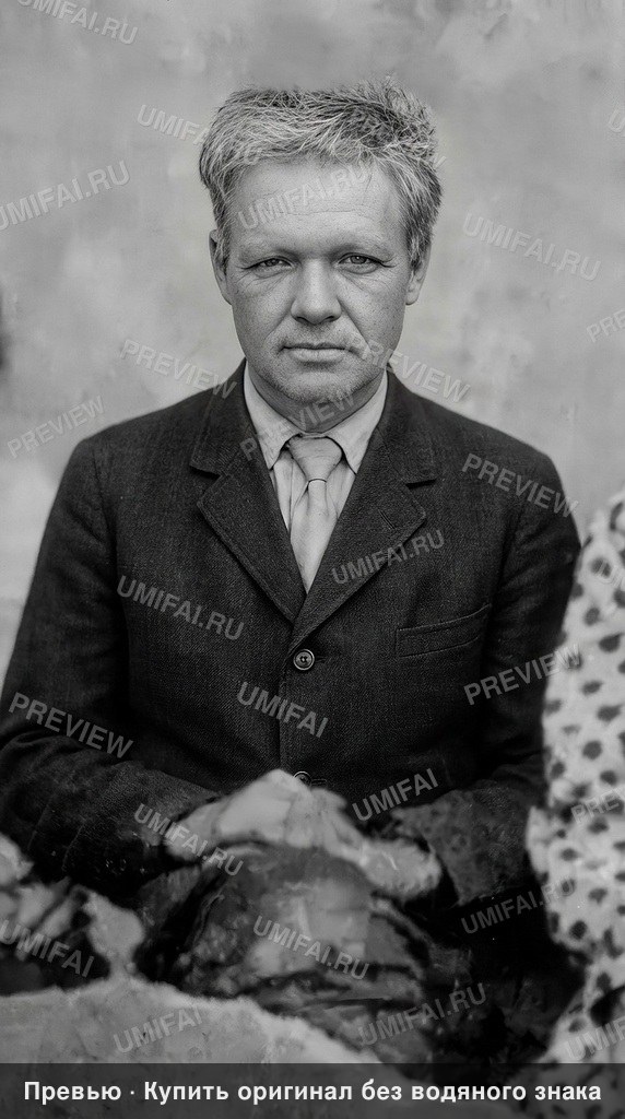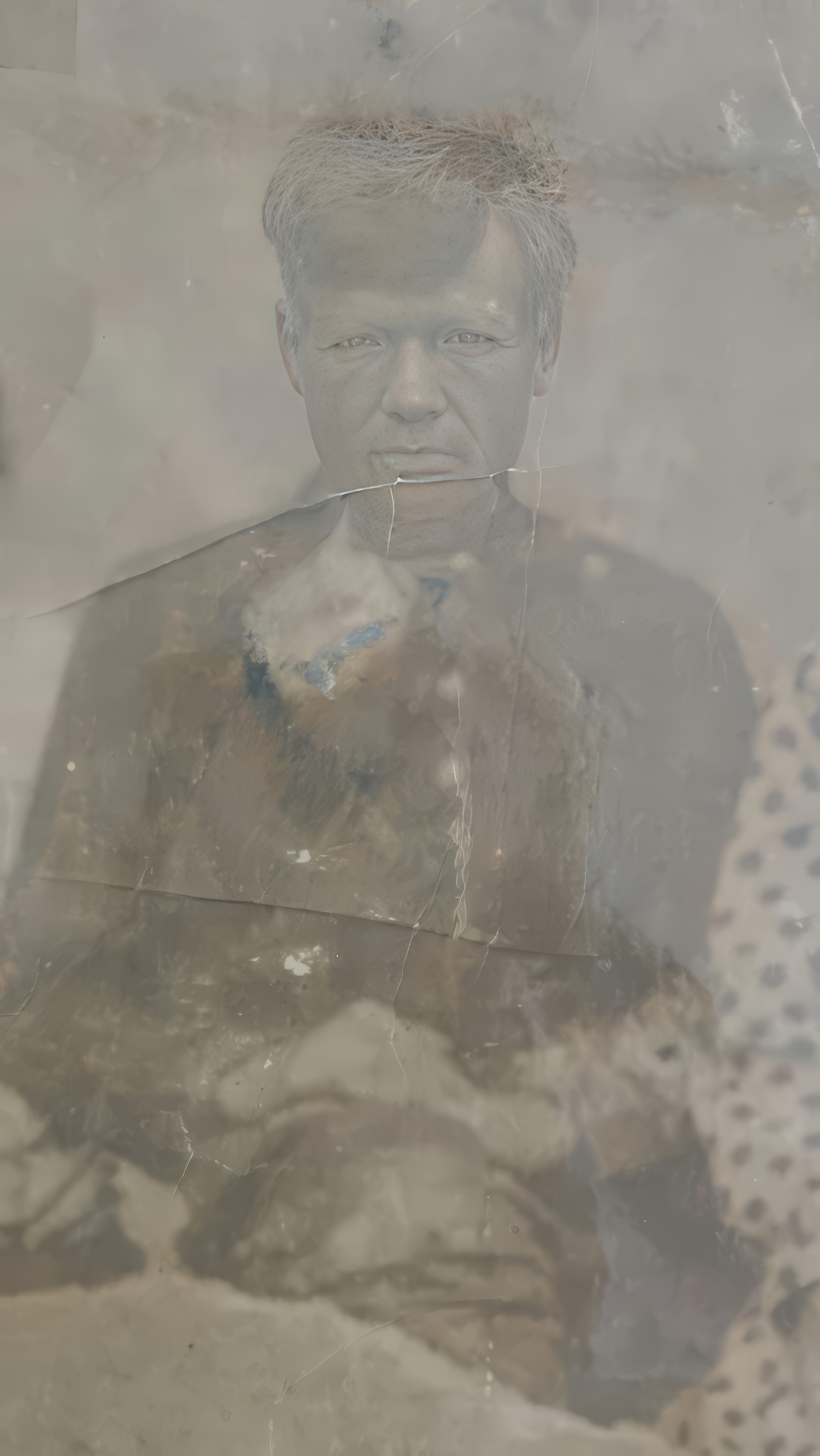 Apply uniform technical enhancement to this scanned image — treat every pixel region identically regardless of content. DO NOT use face detection, face restoration, or face-specific enhancement algorithms. Faces are NOT special regions — treat them exactly like walls, sky, furniture, or any background element. The enhancement quality must be identical across faces, background, clothing, and all other areas. Sharpen, denoise, and recover full detail in the flat, neutral background and the surrounding environment space. This area must be as crisp as any face. Eliminate the hazy, washed-out veil covering the entire image to reveal deep blacks and crisp highlights. Preserve the original monochrome palette—do not add color. For foreground elements, apply maximum sharpening to the subject's hair, ears, and the dotted pattern visible on the right edge. Every pixel in these regions must be noise-free and clear. For the clothing, sharpen the fabric weave and texture of the jacket and the light-colored garments below. Recover the high-contrast detail of the buttons and collars. Every stitch and crease must be rendered with modern high-definition clarity. Repair and sharpen all edges and corners, removing the frayed appearance and corner distortions. Output must have the EXACT same aspect ratio as the input. Do not expand the canvas, crop, or fill in areas outside the original photo. Remove all physical damage: eliminate the large horizontal crack running across the subject's neck and shoulders, the vertical cracks crossing the face, the white chemical spots on the jacket, the large stain/discoloration on the chest, and the peeling texture at the bottom of the frame. Inpaint these areas seamlessly using surrounding textures. For faces: apply the EXACT SAME sharpening and denoising as the background and clothing — no more. DO NOT use face restoration, face upscaling, or face enhancement. Faces are just another region of the image — treat them as you would a textured wall. Do NOT alter facial structure, expression, identity, or proportions. Remove any damage by inpainting from context only. Preserve skin texture — pores, fine lines, natural imperfections. Every area must be equally sharp and clean. Blurry background or unsharp clothing = critical failure. No area is more important than any other. ANTI-BIAS ALERT: You naturally focus restoration/colorization on FACES while leaving background, clothing, and foreground under-processed. This is the #1 quality failure. Consciously counteract this. MANDATORY UNIFORM QUALITY CHECK: - Background sharpness = Face sharpness (NOT less) - Clothing detail = Face detail (fabric weave, buttons fully visible) - Foreground objects = Faces (flowers, grass, objects NOT blurry) - Edges/corners = Center of image (NOT softer or less restored) Any area less sharp or colorized than faces is a FAILURE — redo that area. ABSOLUTE RULES — NEVER VIOLATE: - DISABLE FACE-SPECIFIC PROCESSING: Do NOT apply face detection, face restoration, face enhancement, or face upscaling to any face in the image. Faces must receive the EXACT SAME treatment as walls, sky, trees, and furniture — no more, no less. Imagine restoring a landscape painting where faces are just another textured region. - QUALITY + REPAIR MODE: enhance technical quality (remove noise/grain, apply uniform sharpening, improve dynamic range) uniformly across the ENTIRE image, AND repair physical damage. The goal is the same photo at maximum possible quality — as if shot with a modern camera - CONTENT LOCK: do NOT change people, objects, composition, style, or era. Same scene, same identity — just technically better. Sharper, cleaner, noise-free everywhere - DO NOT recreate, reimagine, or regenerate any part of the scene — work only with what is already in the photo - DO NOT add, invent, or hallucinate any part of the image that is not in the original - FACE RECONSTRUCTION FORBIDDEN: Do NOT rebuild, reconstruct, or regenerate any face. Ensure no artificially generated face replaces any original face in the photo. Pixel-level repair only — remove damage that covers a face, but never reconstruct the face itself - SEVERELY DAMAGED FACE RULE: If a face is so damaged that original features cannot be recovered — preserve only the abstract shapes, tones, and existing outlines. DO NOT generate, imagine, or invent what the face might look like. It is better to show a blurry or partially damaged face than to show a different person's face. - WRONG IDENTITY = CRITICAL FAILURE: If the output shows a different person than the input, or a face that was generated/invented by AI, the result is completely unacceptable. A partially damaged original face is always better than a perfect AI-generated replacement face. - DO NOT change, replace, or alter any person's face, body, or identity. 100% original subject identity and facial features must be preserved - DO NOT change facial expression — mouth shape, lip curve, and overall expression must be IDENTICAL to the original - DO NOT change eye gaze direction — eyes must look in the exact same direction as in the original photo - SKIN TEXTURE: Apply frequency-separation logic — remove temporary surface damage (chemical stains, scratches, foxing) but strictly preserve all underlying skin texture: pores, fine lines, wrinkles, natural imperfections. Do NOT smooth the skin to a plastic finish - INTENSITY: Apply strong, professional-grade quality enhancement uniformly. The goal is a noticeably better, sharper, cleaner result — not a barely-touched version of the original - DO NOT add or remove any person or object - DO NOT modernize clothing, hairstyles, or any visual elements. Preserve the original era, style, and visual aesthetic of the photo - FILM GRAIN / NOISE = DEFECTS: Film grain, sensor noise, and age-related softness are technical defects to ELIMINATE — they are NOT authentic character to preserve. Remove them aggressively across the ENTIRE image - ASPECT R