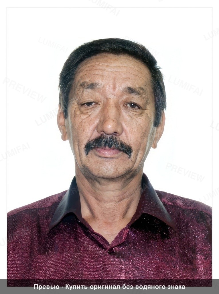 Restore this ID photograph with uniform clarity. 1. **Background & Environment:** Completely remove the blue ink stamps and Cyrillic text in the top left corner. Eliminate the diagonal fold line and white triangular tear on the left side. Restore the flat white background to a clean, consistent texture without gradient or shadows. 2. **Foreground Objects:** Ensure the dark, textured collar and shoulder areas are rendered with high-frequency detail. Remove the vertical white scratch/crease running through the center of the image. 3. **Clothing Textures:** Sharpen the maroon, textured fabric of the shirt. Render every thread and weave pattern with extreme clarity, ensuring it is as sharp as the subject's eyes. Recover lost shadow detail in the shirt folds. 4. **Edges & Corners:** Repair the frayed white border. Remove all dust spots, yellowing stains, and microscopic cracks near the perimeter. Maintain a flat film aesthetic with zero depth-of-field. 5. **Faces:** Restore the subject's features by removing the central vertical crease that passes through the nose and lip. Sharpen the mustache, hair, and eyes while maintaining original skin tones and color balance. **CRITICAL:** Apply IDENTICAL sharpness and restoration quality to background, foreground, clothing, AND faces—no hierarchy. Background walls must be as sharp and detailed as any face in the image. Clothing textures must be restored with FULL micro-detail. Process all areas with equal quality. WARNING: You have a natural bias toward faces. Consciously COMPENSATE—over-process background and clothing to balance the final output across the entire frame. ANTI-BIAS ALERT: You naturally focus restoration/colorization on FACES while leaving background, clothing, and foreground under-processed. This is the #1 quality failure. Consciously counteract this. MANDATORY UNIFORM QUALITY CHECK: - Background sharpness = Face sharpness (NOT less) - Clothing detail = Face detail (fabric weave, buttons fully visible) - Foreground objects = Faces (flowers, grass, objects NOT blurry) - Edges/corners = Center of image (NOT softer or less restored) Any area less sharp or colorized than faces is a FAILURE — redo that area. ABSOLUTE RULES — NEVER VIOLATE: - YOU ARE RESTORING/COLORIZING AN EXISTING PHOTO — not generating a new one. Every pixel must correspond to the original image. - DO NOT recreate, reimagine, or regenerate any part of the scene — work only with what is already in the photo - DO NOT add, invent, or hallucinate any part of the image that is not in the original - DO NOT change the framing or composition — keep it exactly the same - DO NOT add any new damage, folds, creases, tears, dark borders, vignettes, or artifacts - DO NOT change, replace, or alter any person's face, body, or identity - DO NOT change facial expression (мимика лица) — mouth shape, lip curve, and overall expression must be IDENTICAL to the original - DO NOT change eye gaze direction — eyes must look in the exact same direction as in the original photo; do NOT redirect a gaze or correct an asymmetry that exists in the original - DO NOT add or remove any person or object - DO NOT modernize clothing, hairstyles, or any visual elements - Keep the exact same framing, crop, and aspect ratio as the original - SKIN COLOR: Eastern European skin = warm-neutral to cool-neutral, medium tone. NEVER red or orange. NEVER ghostly pale or washed-out. NEVER airbrushed or plastic. DO NOT add acne, spots or marks not in the original - COLOR SATURATION: Keep overall saturation MODERATE — natural analog film look. NOT vivid digital. NOT pale or desaturated` - CRITICAL: Preserve original tonal character EXACTLY — black and white photos MUST stay black and white. Sepia photos MUST stay sepia. DO NOT add ANY color whatsoever. - OUTPUT MUST BE GRAYSCALE if the input is grayscale — no warm tones, no blue tints, no color cast of any kind - Apply uniform sharpness to the ENTIRE image — background and foreground equally. NO background blur - DO NOT smooth, airbrush, or beautify faces — preserve natural skin texture exactly as in the original