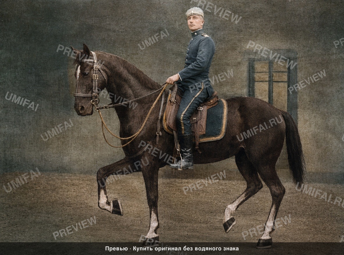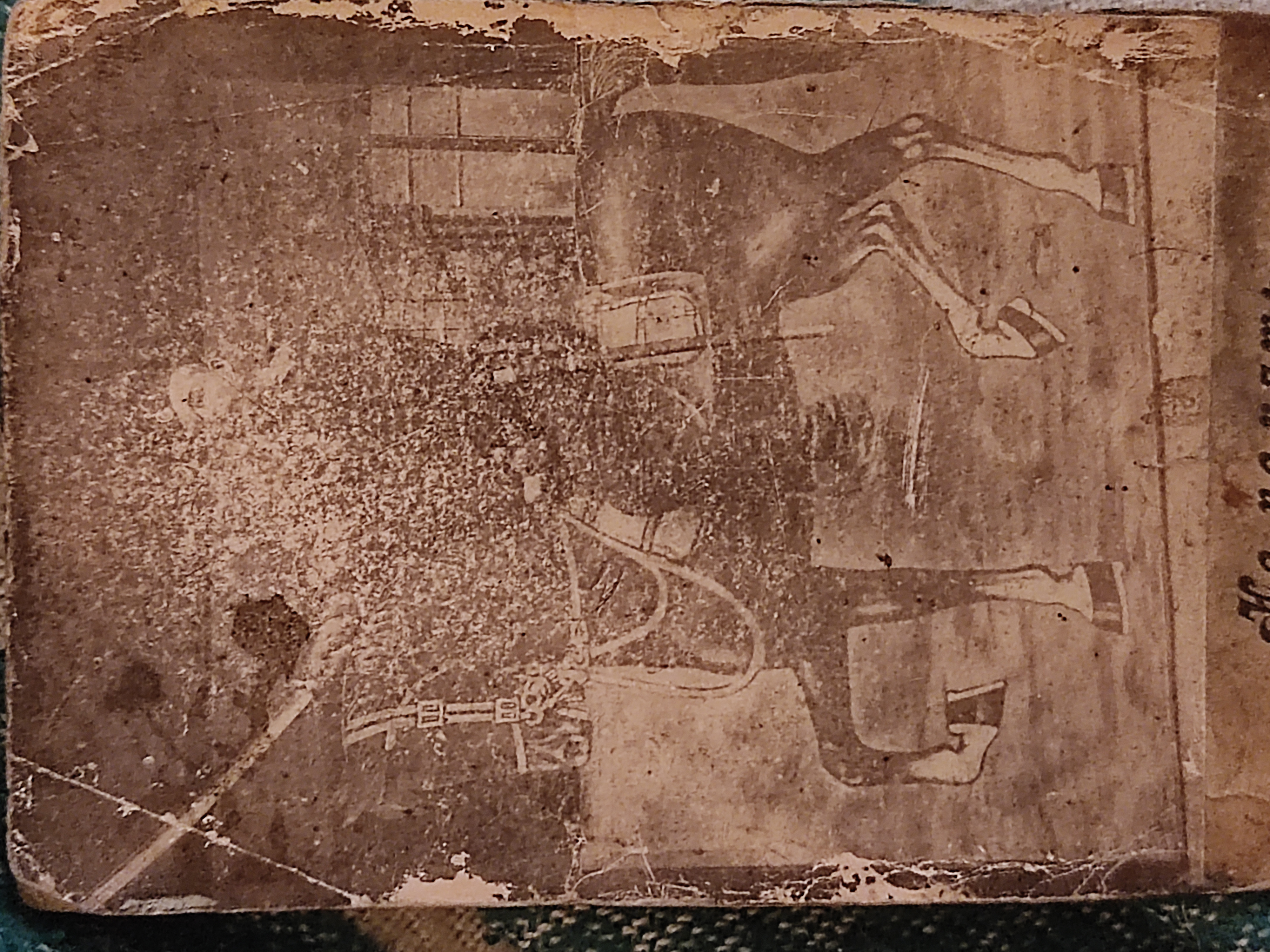 ARCHIVAL PHOTO RESTORATION WITH CONTROLLED RECONSTRUCTION Task: Restore and colorize the photograph by repairing physical damage while preserving identity and original content. HARD CONSTRAINTS: - IDENTITY LOCK: Faces, proportions, expression, and pose must remain identical. - NO IDENTITY CHANGE. CONTROLLED RESTORATION: - Reconstruct ONLY damaged areas (cracks, stains, tears). - Keep reconstruction minimal and consistent with nearby pixels. - Do NOT invent new objects or anatomy. FACE RULES: - Improve clarity and sharpness slightly. - No beautification or structural changes. - Preserve natural skin texture. RESTORATION: - Remove cracks, dust, stains, scratches, mold. - Repair damage realistically. - Restore contrast and tonal balance. - Avoid overprocessing. COLORIZATION: - Natural, historically plausible colors. - Soft, muted vintage palette. - Natural skin tones. LIMITS: - Do not add/remove subjects. - Do not change composition or framing. TEXTURE: - Preserve grain and micro-texture. - Avoid strong smoothing. SECONDARY SUBJECTS: - Apply same restoration quality to all visible faces. OUTPUT: High-resolution, clean, naturally restored archival photo. IMAGE DESCRIPTION: 1. One human figure, one horse. 2. Indiscernible due to damage and stylized nature. 3. No discernible facial features or expression. 4. No discernible hair. 5. Appears to be riding attire, including a jacket, trousers, and boots. 6. Indistinct, possibly an indoor or stable-like setting with rectangular wall features. 7. Severe fading, extensive fine cracks and scratches, large dark stains, a prominent dark brown