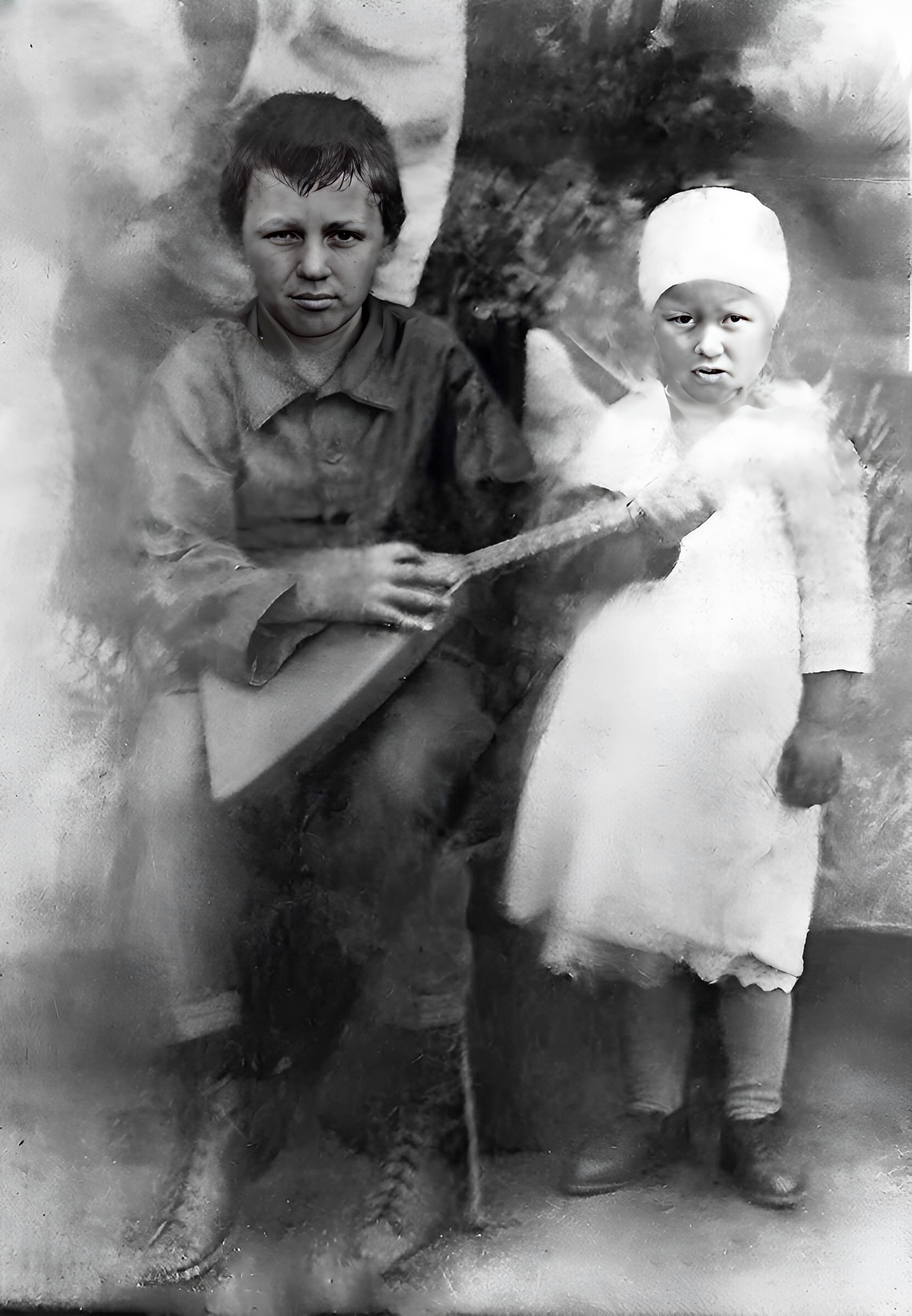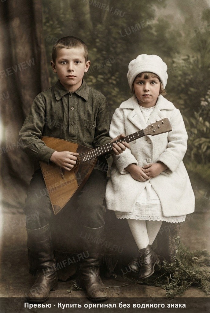 Colorize the EXISTING photograph using the SVEMA early-palette: near-monochromatic and muted tones with a subtle warm-sepia tint, very low saturation, and soft contrast characteristic of early 20th-century Soviet photography. Damage is concentrated in heavy chemical fogging across the bottom half, significant light leaks on the left, and fading on the girl’s white dress. Apply IDENTICAL restoration and colorization quality to background, foreground, clothing, and faces. Background and Environment: Fully restore the hazy foliage and the fabric backdrop behind the boy. Colorize the background with muted, desaturated earthy greens and deep browns that are as sharp and detailed as the faces. Foreground: Restore the balalaika, sharpening the wooden grain and strings; colorize with a deep, natural wood ochre. Fully repair the bottom edge—restoring the boy’s leather boots and the girl’s shoes and socks from the heavy chemical haze, adding realistic leather textures and muted dark brown tones. Clothing: Restore the boy’s collared shirt, adding sharp fabric weave and stitching detail in a muted navy or dark olive. Restore the girl’s white winter coat, hat, and dress, recovering the soft wool texture and lace-trimmed hem from the overexposed areas, using a natural creamy white with neutral shadows. Edges and Corners: Repair the vertical light leak on the left and the chemical staining on all corners to match the center's clarity and color depth. Faces: Restore skin tones to a natural warm-neutral to cool-neutral Soviet ethnicity, avoiding all orange or pink tints. Preserve original skin textures, eyes, and hair strands without over-smoothing or airbrushing. Natural analog-film palette — moderate saturation, warm-neutral tones. ALL areas processed with EQUAL quality. Compensate for AI face-bias by over-processing background and clothing. ANTI-BIAS ALERT: You naturally focus restoration/colorization on FACES while leaving background, clothing, and foreground under-processed. This is the #1 quality failure. Consciously counteract this. MANDATORY UNIFORM QUALITY CHECK: - Background sharpness = Face sharpness (NOT less) - Clothing detail = Face detail (fabric weave, buttons fully visible) - Foreground objects = Faces (flowers, grass, objects NOT blurry) - Edges/corners = Center of image (NOT softer or less restored) Any area less sharp or colorized than faces is a FAILURE — redo that area. ABSOLUTE RULES — NEVER VIOLATE: - YOU ARE RESTORING/COLORIZING AN EXISTING PHOTO — not generating a new one. Every pixel must correspond to the original image. - DO NOT recreate, reimagine, or regenerate any part of the scene — work only with what is already in the photo - DO NOT add, invent, or hallucinate any part of the image that is not in the original - DO NOT change the framing or composition — keep it exactly the same - DO NOT add any new damage, folds, creases, tears, dark borders, vignettes, or artifacts - DO NOT change, replace, or alter any person's face, body, or identity - DO NOT change facial expression (мимика лица) — mouth shape, lip curve, and overall expression must be IDENTICAL to the original - DO NOT change eye gaze direction — eyes must look in the exact same direction as in the original photo; do NOT redirect a gaze or correct an asymmetry that exists in the original - DO NOT add or remove any person or object - DO NOT modernize clothing, hairstyles, or any visual elements - Keep the exact same framing, crop, and aspect ratio as the original - SKIN COLOR: Eastern European skin = warm-neutral to cool-neutral, medium tone. NEVER red or orange. NEVER ghostly pale or washed-out. NEVER airbrushed or plastic. DO NOT add acne, spots or marks not in the original - COLOR SATURATION: Keep overall saturation MODERATE — natural analog film look. NOT vivid digital. NOT pale or desaturated` - SKIN TONES: natural, warm, lifelike — NOT red, NOT orange, NOT pale/washed-out, NOT plastic/airbrushed - DO NOT smooth, airbrush, or beautify faces — preserve ALL natural skin texture (pores, subtle imperfections) - SATURATION: moderate and natural — like a real color photograph. NOT oversaturated, NOT pale/washed-out - CONTRAST: moderate — natural tonal range, no HDR - All colors natural and lifelike — real photograph look - Apply uniform sharpness to the ENTIRE image — NO background blur