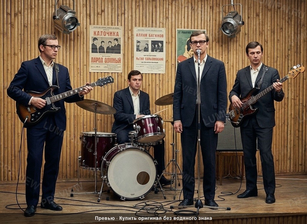 Perform meticulous non-destructive restoration and colorization of this aged photograph. Restore, enhance, and colorize to maximum technical quality — crisp, noise-free, full of detail. Add historically accurate colors. Output MUST have the EXACT same aspect ratio as the input. Colorize the EXISTING photograph using ORWO Color NC / SVEMA 130 color palette: moderate saturation, slightly cool midtones, natural warm-neutral skin, and muted but grounded primary colors typical of late 1970s and early 1980s Soviet film. Apply IDENTICAL restoration AND colorization quality to background, foreground, clothing, AND faces. Damage is concentrated in the corners (tears and missing data), the upper white space (chemical staining and fading), and vertical white scratches throughout the center and lower stage area. Background: Restore the bamboo or slat-wood wall texture, removing all spots and scratches. Colorize with natural wood tones. Enhance the two stage lights, identifying metallic textures and glass lenses. Restore the vintage posters/photographs on the wall with clear definition and accurate paper-tint colors. Foreground: Restore the drum kit, guitar, and bass with high-fidelity detail. Colorize the drum shells with a deep, period-accurate color (like burgundy or blue) and ensure the metallic hardware (cymbals, stands, bridges) has a sharp, clean chrome or brass finish. Restore the tangled cables on the floor, ensuring they are distinct from the wooden stage slats. Clothing: Restore the suits and shirts of all four band members. Colorize with dark, professional tones (navy, charcoal, or dark brown) while preserving the heavy fabric weave, lapel stitching, and shirt patterns. The shirts should show natural white or cream cotton textures without blowing out. Edges and Corners: Repair the missing physical material in the upper right and bottom right corners. Heal all spider-web-like scratches on the far left and right edges. Faces: Restore with neutral skin tones—warm-brown to cool-neutral, natural for Eastern European people. Avoid orange or waxy textures. Preserve glasses frames, natural hair sheen, and eye iris details without artificial smoothing. Preserve individual hair strands for the era-specific hairstyles. WARNING: You have a natural bias toward faces. COMPENSATE — apply extra restoration and colorization effort to background, instruments, and clothing. Natural analog-film palette — moderate saturation, warm-neutral tones. ALL areas processed with EQUAL quality. Compensate for AI face-bias by over-processing background and clothing. ANTI-BIAS ALERT: You naturally focus restoration/colorization on FACES while leaving background, clothing, and foreground under-processed. This is the #1 quality failure. Consciously counteract this. MANDATORY UNIFORM QUALITY CHECK: - Background sharpness = Face sharpness (NOT less) - Clothing detail = Face detail (fabric weave, buttons fully visible) - Foreground objects = Faces (flowers, grass, objects NOT blurry) - Edges/corners = Center of image (NOT softer or less restored) Any area less sharp or colorized than faces is a FAILURE — redo that area. ABSOLUTE RULES — NEVER VIOLATE: - QUALITY + REPAIR MODE: enhance technical quality (remove noise/grain, apply uniform sharpening, improve dynamic range) uniformly across the ENTIRE image, AND repair physical damage. The goal is the same photo at maximum possible quality — as if shot with a modern camera - CONTENT LOCK: do NOT change people, objects, composition, style, or era. Same scene, same identity — just technically better. Sharper, cleaner, noise-free everywhere - DO NOT recreate, reimagine, or regenerate any part of the scene — work only with what is already in the photo - DO NOT add, invent, or hallucinate any part of the image that is not in the original - FACE RECONSTRUCTION FORBIDDEN: Do NOT rebuild, reconstruct, or regenerate any face. Ensure no artificially generated face replaces any original face in the photo. Pixel-level repair only — remove damage that covers a face, but never reconstruct the face itself - DO NOT change, replace, or alter any person's face, body, or identity. 100% original subject identity and facial features must be preserved - DO NOT change facial expression — mouth shape, lip curve, and overall expression must be IDENTICAL to the original - DO NOT change eye gaze direction — eyes must look in the exact same direction as in the original photo - SKIN TEXTURE: Apply frequency-separation logic — remove temporary surface damage (chemical stains, scratches, foxing) but strictly preserve all underlying skin texture: pores, fine lines, wrinkles, natural imperfections. Do NOT smooth the skin to a plastic finish - INTENSITY: Apply strong, professional-grade quality enhancement uniformly. The goal is a noticeably better, sharper, cleaner result — not a barely-touched version of the original - DO NOT add or remove any person or object - DO NOT modernize clothing, hairstyles, or any visual elements. Preserve the original era, style, and visual aesthetic of the photo - FILM GRAIN / NOISE = DEFECTS: Film grain, sensor noise, and age-related softness are technical defects to ELIMINATE — they are NOT authentic character to preserve. Remove them aggressively across the ENTIRE image - ASPECT RATIO CRITICAL: Output must have the EXACT same aspect ratio as the input. DO NOT crop, add borders, expand canvas, or shift composition. Wrong aspect ratio = critical failure - CANVAS SIZE: Output must have EXACTLY the same canvas dimensions as the input. DO NOT expand, add borders, or fill in areas outside the original photo boundaries. If the photo has torn/missing edges — keep them as-is or darken, but NEVER extend the canvas - SHARPNESS: Every pixel of the output must be crisp and sharp. NO softness, NO blur, NO smoothing anywhere. Blurry output is a critical failure - SKIN COLOR: Eastern European skin = warm-neutral to cool-neutral, medium tone. NEVER red or orange. N