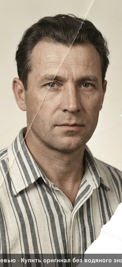 Perform meticulous non-destructive restoration and colorization of this aged photograph. Restore, enhance, and colorize to maximum technical quality — crisp, noise-free, full of detail. Add historically accurate colors. Output MUST have the EXACT same aspect ratio as the input. Colorize the EXISTING photograph using SVEMA early (1930s-1940s) color palette: a near-monochromatic, extremely muted foundation with a very subtle warm-sepia tint and minimal, grounded saturation levels that reflect the early Soviet photographic era. Damage Map: Heavily concentrated diagonal crease and tear running from the top left corner through the subject's face and shoulder. Significant missing section on the right edge with a textured overlay. Faded contrast and chemical spotting throughout. Background/Environment: Restore the neutral, interior wall background by removing all yellowing, stains, and the prominent diagonal tear. Colorize with a muted, desaturated cream or pale grey-beige, ensuring the texture remains smooth and noise-free with no digital artifacts. Foreground/Clothing: Restore the striped linen shirt by meticulously repairing the tear across the left shoulder and chest. Colorize the garment using dull, historically accurate Soviet-era tones such as charcoal grey or muted navy stripes over an off-white base. Ensure the fabric weave and stitching are sharp and detailed. Apply EQUAL restoration quality to the clothing as to the face. Edges/Corners: Completely remove the dark, textured overlay pattern on the right side. Rebound the image edges, repairing the jagged, missing paper sections on the right and bottom right to create a clean, continuous frame. Remove all corner vignette and age-related darkening. Faces: Restore the facial features by seamlessly removing the deep crease running across the subject's forehead, eye, and cheek. Preserve all natural skin texture, including fine lines and pores, without any airbrushing or smoothing. Apply a natural Eastern European skin tone—warm-neutral to cool-neutral—avoiding any orange, red, or ghostly white tints. Maintain the intense, natural expression by preserving the original iris detail and shadows. Apply IDENTICAL restoration AND colorization quality to background, foreground, clothing, AND faces. Background must be as sharp, detailed, and richly colorized as the face. WARNING: You have a natural bias toward faces. COMPENSATE—apply extra restoration and colorization effort to the background and shirt fabric. Natural analog-film palette—moderate saturation, warm-neutral tones. ALL areas processed with EQUAL quality. Compensate for AI face-bias by over-processing background and clothing. ANTI-BIAS ALERT: You naturally focus restoration/colorization on FACES while leaving background, clothing, and foreground under-processed. This is the #1 quality failure. Consciously counteract this. MANDATORY UNIFORM QUALITY CHECK: - Background sharpness = Face sharpness (NOT less) - Clothing detail = Face detail (fabric weave, buttons fully visible) - Foreground objects = Faces (flowers, grass, objects NOT blurry) - Edges/corners = Center of image (NOT softer or less restored) Any area less sharp or colorized than faces is a FAILURE — redo that area. ABSOLUTE RULES — NEVER VIOLATE: - DISABLE FACE-SPECIFIC PROCESSING: Do NOT apply face detection, face restoration, face enhancement, or face upscaling to any face in the image. Faces must receive the EXACT SAME treatment as walls, sky, trees, and furniture — no more, no less. Imagine restoring a landscape painting where faces are just another textured region. - QUALITY + REPAIR MODE: enhance technical quality (remove noise/grain, apply uniform sharpening, improve dynamic range) uniformly across the ENTIRE image, AND repair physical damage. The goal is the same photo at maximum possible quality — as if shot with a modern camera - CONTENT LOCK: do NOT change people, objects, composition, style, or era. Same scene, same identity — just technically better. Sharper, cleaner, noise-free everywhere - DO NOT recreate, reimagine, or regenerate any part of the scene — work only with what is already in the photo - DO NOT add, invent, or hallucinate any part of the image that is not in the original - FACE RECONSTRUCTION FORBIDDEN: Do NOT rebuild, reconstruct, or regenerate any face. Ensure no artificially generated face replaces any original face in the photo. Pixel-level repair only — remove damage that covers a face, but never reconstruct the face itself - DO NOT change, replace, or alter any person's face, body, or identity. 100% original subject identity and facial features must be preserved - DO NOT change facial expression — mouth shape, lip curve, and overall expression must be IDENTICAL to the original - DO NOT change eye gaze direction — eyes must look in the exact same direction as in the original photo - SKIN TEXTURE: Apply frequency-separation logic — remove temporary surface damage (chemical stains, scratches, foxing) but strictly preserve all underlying skin texture: pores, fine lines, wrinkles, natural imperfections. Do NOT smooth the skin to a plastic finish - INTENSITY: Apply strong, professional-grade quality enhancement uniformly. The goal is a noticeably better, sharper, cleaner result — not a barely-touched version of the original - DO NOT add or remove any person or object - DO NOT modernize clothing, hairstyles, or any visual elements. Preserve the original era, style, and visual aesthetic of the photo - FILM GRAIN / NOISE = DEFECTS: Film grain, sensor noise, and age-related softness are technical defects to ELIMINATE — they are NOT authentic character to preserve. Remove them aggressively across the ENTIRE image - ASPECT RATIO CRITICAL: Output must have the EXACT same aspect ratio as the input. DO NOT crop, add borders, expand canvas, or shift composition. Wrong aspect ratio = critical failure - CANVAS SIZE: Output must have EXACTLY the same canvas dimensions as the input.