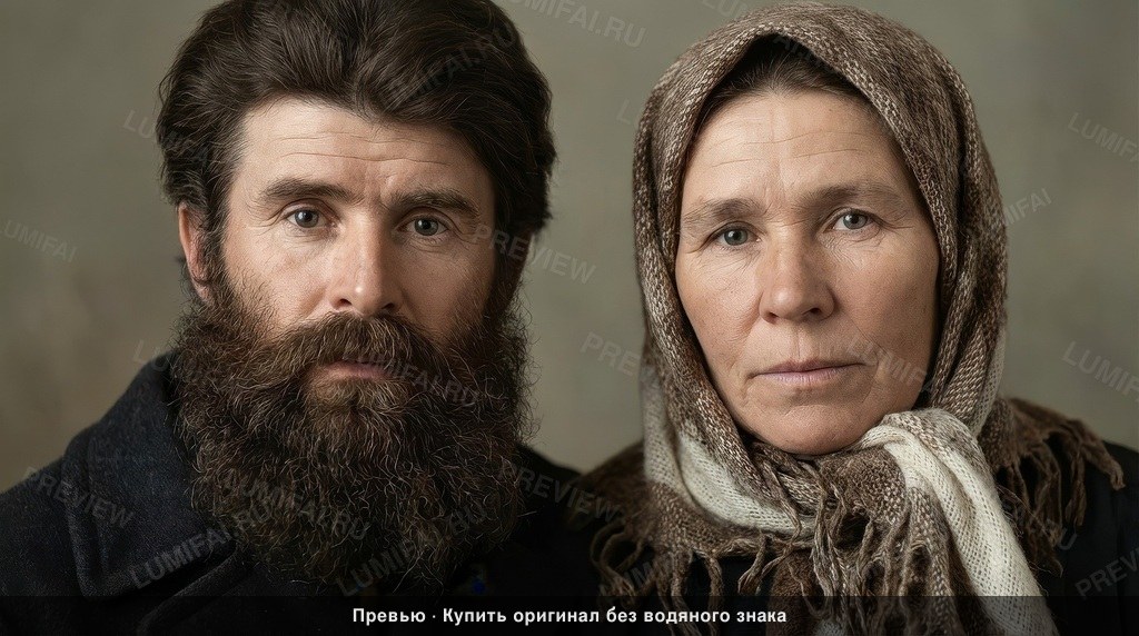 Perform a high-fidelity restoration and colorization of this photograph using natural, lifelike tones that reflect reality rather than a stylized film palette. Apply realistic, healthy Eastern European skin tones—warm-neutral beige with subtle natural variations, avoiding any monochromatic, sepia, orange, or greyish tints. Every element of the image must be restored with equal priority. Enhance the man's dense beard and the texture of the woman's headscarf to be sharp and detailed, matching the clarity of the facial features. The background must be clean and rendered in muted, earthy, natural colors without any blur or color bleeding. Colorize the clothing in realistic, subdued historical tones: the man’s coat in deep charcoal or dark brown wool, and the woman’s shawl in natural fiber tones. Ensure that all textures—from the skin pores to the fabric weave—are visible and sharp. ABSOLUTE RULES: - Eliminate all grain, noise, and fading while preserving original identities and expressions. - Maintain the EXACT aspect ratio and composition of the original input. - Use a natural, modern-realistic color balance: avoid the "early film" look or artificial filters. - Do NOT reconstruct faces; perform pixel-level repair only to preserve the authentic structure and emotion of the subjects. - Apply uniform sharpness across the entire frame, including the edges and background. - Skin must look like living tissue: maintain fine lines and natural texture without waxy or plastic smoothing. ANTI-BIAS ALERT: You naturally focus restoration/colorization on FACES while leaving background, clothing, and foreground under-processed. This is the #1 quality failure. Consciously counteract this. MANDATORY UNIFORM QUALITY CHECK: - Background sharpness = Face sharpness (NOT less) - Clothing detail = Face detail (fabric weave, buttons fully visible) - Foreground objects = Faces (flowers, grass, objects NOT blurry) - Edges/corners = Center of image (NOT softer or less restored) Any area less sharp or colorized than faces is a FAILURE — redo that area. ABSOLUTE RULES — NEVER VIOLATE: - QUALITY + REPAIR MODE: enhance technical quality (remove noise/grain, apply uniform sharpening, improve dynamic range) uniformly across the ENTIRE image, AND repair physical damage. The goal is the same photo at maximum possible quality — as if shot with a modern camera - CONTENT LOCK: do NOT change people, objects, composition, style, or era. Same scene, same identity — just technically better. Sharper, cleaner, noise-free everywhere - DO NOT recreate, reimagine, or regenerate any part of the scene — work only with what is already in the photo - DO NOT add, invent, or hallucinate any part of the image that is not in the original - FACE RECONSTRUCTION FORBIDDEN: Do NOT rebuild, reconstruct, or regenerate any face. Ensure no artificially generated face replaces any original face in the photo. Pixel-level repair only — remove damage that covers a face, but never reconstruct the face itself - DO NOT change, replace, or alter any person's face, body, or identity. 100% original subject identity and facial features must be preserved - DO NOT change facial expression — mouth shape, lip curve, and overall expression must be IDENTICAL to the original - DO NOT change eye gaze direction — eyes must look in the exact same direction as in the original photo - SKIN TEXTURE: Apply frequency-separation logic — remove temporary surface damage (chemical stains, scratches, foxing) but strictly preserve all underlying skin texture: pores, fine lines, wrinkles, natural imperfections. Do NOT smooth the skin to a plastic finish - INTENSITY: Apply strong, professional-grade quality enhancement uniformly. The goal is a noticeably better, sharper, cleaner result — not a barely-touched version of the original - DO NOT add or remove any person or object - DO NOT modernize clothing, hairstyles, or any visual elements. Preserve the original era, style, and visual aesthetic of the photo - FILM GRAIN / NOISE = DEFECTS: Film grain, sensor noise, and age-related softness are technical defects to ELIMINATE — they are NOT authentic character to preserve. Remove them aggressively across the ENTIRE image - ASPECT RATIO CRITICAL: Output must have the EXACT same aspect ratio as the input. DO NOT crop, add borders, expand canvas, or shift composition. Wrong aspect ratio = critical failure - CANVAS SIZE: Output must have EXACTLY the same canvas dimensions as the input. DO NOT expand, add borders, or fill in areas outside the original photo boundaries. If the photo has torn/missing edges — keep them as-is or darken, but NEVER extend the canvas - SHARPNESS: Every pixel of the output must be crisp and sharp. NO softness, NO blur, NO smoothing anywhere. Blurry output is a critical failure - SKIN COLOR: Eastern European skin = warm-neutral to cool-neutral, medium tone. NEVER red or orange. NEVER ghostly pale or washed-out. NEVER airbrushed or plastic. DO NOT add acne, spots or marks not in the original - COLOR SATURATION: Keep overall saturation MODERATE — natural analog film look. NOT vivid digital. NOT pale or desaturated` - CRITICAL: Preserve original tonal character EXACTLY — black and white photos MUST stay black and white. Sepia photos MUST stay sepia. DO NOT add ANY color whatsoever. - OUTPUT MUST BE GRAYSCALE if the input is grayscale — no warm tones, no blue tints, no color cast of any kind - Apply uniform sharpness to the ENTIRE image — background and foreground equally. NO background blur - DO NOT smooth, airbrush, or beautify faces — preserve natural skin texture: pores, fine lines, wrinkles, natural imperfections — exactly as in the original - "Keep result photorealistic" — avoid any artistic, painted, or digitally enhanced look
