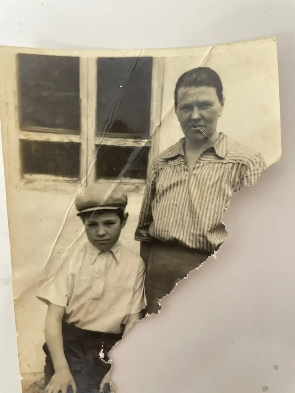 Perform meticulous non-destructive restoration and colorization of this aged photograph. Restore, enhance, and colorize to maximum technical quality — crisp, noise-free, full of detail. Add historically accurate colors. Output MUST have the EXACT same aspect ratio as the input. Colorize the EXISTING photograph using the SVEMA 32/64 color palette: a naturalistic early Soviet aesthetic with slightly cool shadows, natural neutral skin tones, and moderate contrast that avoids digital over-saturation. DAMAGE MAP AND RESTORATION: Aggressively target and remove the massive diagonal creases and tears running through the center, the woman's face, and the boy's shoulder. Repair the large missing section on the right edge and bottom corner by seamlessly extending the woman’s arm, the background wall, and the boy's trousers. Eliminate all surface scratches, white chemical spots, and cracks in the emulsion. BACKGROUND AND ENVIRONMENT: Apply IDENTICAL restoration and colorization quality to the background. Restore the wooden window frame and glass panes to full clarity, removing all foxing and stains. Colorize the exterior wall with a muted, natural lime-wash or concrete tone. The background must be as sharp, detailed, and richly colorized as the subjects. FOREGROUND AND CLOTHING: Restore and colorize the clothing with extreme detail. For the woman’s striped blouse, recover the distinct vertical lines and fabric weave, colorizing with muted blues or greens typical of mid-century Soviet textiles. For the boy’s light shirt and dark trousers, preserve the button details and heavy fabric texture. The boy’s cap must show clear wool-like texture. Foreground areas must be fully restored and colorized with sharp detail, NOT blurry. EDGES AND CORNERS: Restore the torn right perimeter and the crumpled left edge with the same care as the center of the image. Ensure the transition between restored missing sections and original photo is invisible. FACES AND SKIN TONES: Restore the faces by removing the heavy creases passing through the woman’s chin and eyes. Preserve accurate Eastern European skin: warm-neutral to cool-neutral tones, avoiding any orange, pink, or waxy textures. Maintain real skin pores, fine lines, and the natural glint in the eyes. DO NOT smooth or airbrush; the skin must look more detailed, not softer. WARNING: You have a natural bias toward faces. COMPENSATE — apply extra restoration and colorization effort to the background, clothing, and the reconstructed right-hand side. Natural analog-film palette — moderate saturation, warm-neutral tones. ALL areas processed with EQUAL quality. Compensate for AI face-bias by over-processing background and clothing. ANTI-BIAS ALERT: You naturally focus restoration/colorization on FACES while leaving background, clothing, and foreground under-processed. This is the #1 quality failure. Consciously counteract this. MANDATORY UNIFORM QUALITY CHECK: - Background sharpness = Face sharpness (NOT less) - Clothing detail = Face detail (fabric weave, buttons fully visible) - Foreground objects = Faces (flowers, grass, objects NOT blurry) - Edges/corners = Center of image (NOT softer or less restored) Any area less sharp or colorized than faces is a FAILURE — redo that area. ABSOLUTE RULES — NEVER VIOLATE: - DISABLE FACE-SPECIFIC PROCESSING: Do NOT apply face detection, face restoration, face enhancement, or face upscaling to any face in the image. Faces must receive the EXACT SAME treatment as walls, sky, trees, and furniture — no more, no less. Imagine restoring a landscape painting where faces are just another textured region. - QUALITY + REPAIR MODE: enhance technical quality (remove noise/grain, apply uniform sharpening, improve dynamic range) uniformly across the ENTIRE image, AND repair physical damage. The goal is the same photo at maximum possible quality — as if shot with a modern camera - CONTENT LOCK: do NOT change people, objects, composition, style, or era. Same scene, same identity — just technically better. Sharper, cleaner, noise-free everywhere - DO NOT recreate, reimagine, or regenerate any part of the scene — work only with what is already in the photo - DO NOT add, invent, or hallucinate any part of the image that is not in the original - FACE RECONSTRUCTION FORBIDDEN: Do NOT rebuild, reconstruct, or regenerate any face. Ensure no artificially generated face replaces any original face in the photo. Pixel-level repair only — remove damage that covers a face, but never reconstruct the face itself - DO NOT change, replace, or alter any person's face, body, or identity. 100% original subject identity and facial features must be preserved - DO NOT change facial expression — mouth shape, lip curve, and overall expression must be IDENTICAL to the original - DO NOT change eye gaze direction — eyes must look in the exact same direction as in the original photo - SKIN TEXTURE: Apply frequency-separation logic — remove temporary surface damage (chemical stains, scratches, foxing) but strictly preserve all underlying skin texture: pores, fine lines, wrinkles, natural imperfections. Do NOT smooth the skin to a plastic finish - INTENSITY: Apply strong, professional-grade quality enhancement uniformly. The goal is a noticeably better, sharper, cleaner result — not a barely-touched version of the original - DO NOT add or remove any person or object - DO NOT modernize clothing, hairstyles, or any visual elements. Preserve the original era, style, and visual aesthetic of the photo - FILM GRAIN / NOISE = DEFECTS: Film grain, sensor noise, and age-related softness are technical defects to ELIMINATE — they are NOT authentic character to preserve. Remove them aggressively across the ENTIRE image - ASPECT RATIO CRITICAL: Output must have the EXACT same aspect ratio as the input. DO NOT crop, add borders, expand canvas, or shift composition. Wrong aspect ratio = critical failure - CANVAS SIZE: Output must have EXACTLY the same canv