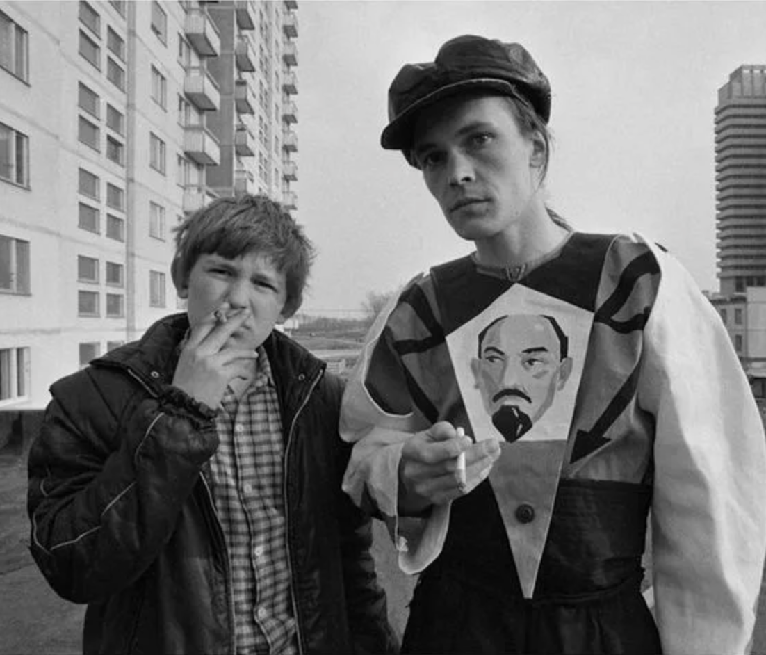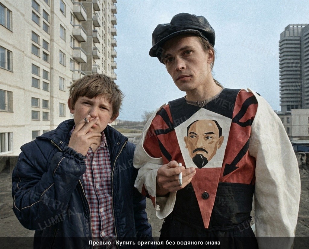 Colorize this existing photo using the late 1980s SVEMA color palette: moderate saturation with a neutral-to-warm bias, natural skin tones, and slightly muted midtones that reflect late Soviet-era film stock. 1. DAMAGE MAP: Focus restoration on the upper-left sky area where grain is heavy, the vertical grain lines throughout the concrete apartment blocks in the background, and the micro-scratches on the darker clothing of both subjects. 2. BACKGROUND/ENVIRONMENT: Apply identical restoration and colorization quality to the massive Soviet "Panelka" apartment buildings. Colorize the concrete walls with realistic aged-grey and weathered beige tones. Each window frame, balcony railing, and structural seam must be sharp and detailed. The sky should be a desaturated, hazy light blue typical of industrial Eastern Europe. Restore the distant skyscrapers on the right with the same sharpness as the foreground. 3. FOREGROUND: Restore the concrete rooftop surface with high-resolution texture, showing the grit and variations in the pavement. The cigarettes and rising smoke must be colorized with natural white and ash-grey tones, maintaining sharp edges against the subjects. 4. CLOTHING: Focus 70% of effort here. For the person on the left, restore the quilted texture and nylon sheen of the dark puffer jacket; colorize it in a deep navy or black with visible stitching and zipper detail. The checkered shirt underneath must show sharp red/blue or green/brown patterns with clear fabric weave. For the person on the right, fully restore the unique constructivist-style tunic. Colorize the portrait of Lenin with tan skin and black hair, the surrounding geometric shapes in bold but matte Soviet reds and blacks, and the sleeves in an off-white cotton texture. The leather cap must have a realistic black hide sheen with visible creasing. 5. EDGES AND CORNERS: Eliminate the vignetting and corner softening. The left-most windows and the right-side horizon must be as sharp and realistically colorized as the center. 6. FACES: Restore skin with a warm-neutral to cool-neutral Eastern European tone—STRICTLY FORBIDDEN: orange, terracotta, or ghostly white. Maintain all real skin textures, including the slight squint of the eyes and natural shadows under the cap. Skin must look alive and textured, not waxy or smooth. Hair must show individual strand detail. WARNING: You have a natural bias toward faces. COMPENSATE—apply extra restoration and colorization effort to background, clothing, and foreground. Natural analog-film palette—moderate saturation, warm-neutral tones. ALL areas processed with EQUAL quality. Over-process background and clothing to ensure uniform detail. ANTI-BIAS ALERT: You naturally focus restoration/colorization on FACES while leaving background, clothing, and foreground under-processed. This is the #1 quality failure. Consciously counteract this. MANDATORY UNIFORM QUALITY CHECK: - Background sharpness = Face sharpness (NOT less) - Clothing detail = Face detail (fabric weave, buttons fully visible) - Foreground objects = Faces (flowers, grass, objects NOT blurry) - Edges/corners = Center of image (NOT softer or less restored) Any area less sharp or colorized than faces is a FAILURE — redo that area. ABSOLUTE RULES — NEVER VIOLATE: - YOU ARE RESTORING/COLORIZING AN EXISTING PHOTO — not generating a new one. Every pixel must correspond to the original image. - DO NOT recreate, reimagine, or regenerate any part of the scene — work only with what is already in the photo - DO NOT add, invent, or hallucinate any part of the image that is not in the original - DO NOT change the framing or composition — keep it exactly the same - DO NOT add any new damage, folds, creases, tears, dark borders, vignettes, or artifacts - DO NOT change, replace, or alter any person's face, body, or identity - DO NOT add or remove any person or object - DO NOT modernize clothing, hairstyles, or any visual elements - Keep the exact same framing, crop, and aspect ratio as the original - SKIN COLOR: Eastern European skin = warm-neutral to cool-neutral, medium tone. NEVER red or orange. NEVER ghostly pale or washed-out. NEVER airbrushed or plastic. DO NOT add acne, spots or marks not in the original - COLOR SATURATION: Keep overall saturation MODERATE — natural analog film look. NOT vivid digital. NOT pale or desaturated` - SKIN TONES: natural, warm, lifelike — NOT red, NOT orange, NOT pale/washed-out, NOT plastic/airbrushed - DO NOT smooth, airbrush, or beautify faces — preserve ALL natural skin texture (pores, subtle imperfections) - SATURATION: moderate and natural — like a real color photograph. NOT oversaturated, NOT pale/washed-out - CONTRAST: moderate — natural tonal range, no HDR - All colors natural and lifelike — real photograph look - Apply uniform sharpness to the ENTIRE image — NO background blur