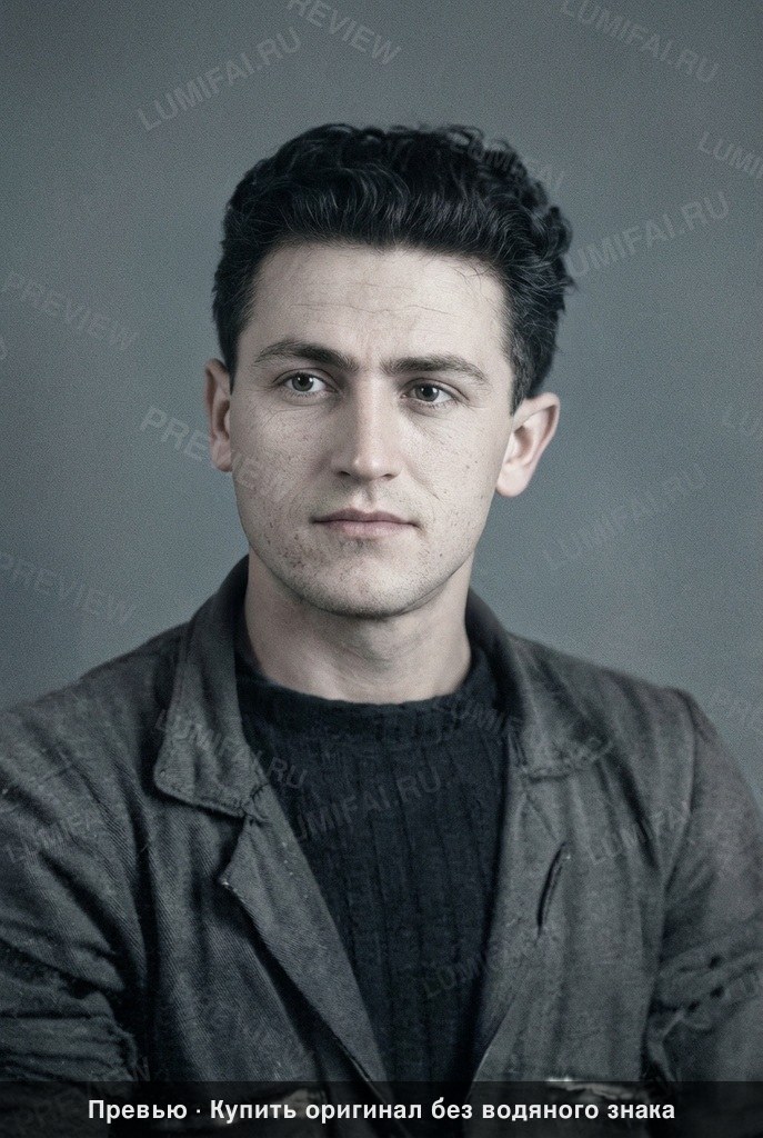 Colorize the EXISTING photograph using SVEMA 32/64 color palette: this palette features cool-neutral tones, slightly greenish shadow depths, and very pale cool skin with low overall contrast. **1. DAMAGE MAP:** This image is severely physically damaged with a radial starburst pattern of deep white cracks, paper tears, and emulsion loss concentrated heavily across the chest, neck, and the center of the face. Severe horizontal folding and silver mirroring are present at the edges. **2. BACKGROUND/ENVIRONMENT:** Restore the studio backdrop by removing the heavy cracks and chemical stains in the top and side margins. Colorize using a muted, desaturated olive-grey or cool-slate tone. The texture must remain atmospheric and slightly grainy like mid-century film, not a flat digital gradient. **3. FOREGROUND:** Not applicable for this portrait. **4. CLOTHING:** Restore the heavy jacket and dark undershirt, removing the dense network of white cracks that obscure the fabric. Colorize the jacket in a muted, desaturated Soviet work-blue or charcoal-grey. Recover the micro-detail of the fabric weave, collar stitching, and pocket seams. Ensure the texture of the fabric is sharp and tactile, avoiding any blurred or "painted" look. **5. EDGES/CORNERS:** Perform full-spectrum restoration on the corners where the paper is fraying and stained. Apply the same level of sharpness and detail recovery to the extreme edges as the center of the frame. **6. FACE AND HAIR:** Restore the facial features by meticulously bridging the gaps created by the large cracks across the nose, mouth, and cheek. Preserve the natural wave and individual strands of the dark hair. Skin tone MUST be pale to medium with cool-neutral undertones typical of Eastern Europe. STRICTLY FORBIDDEN: warm-golden, orange, or airbrushed "plastic" skin. Maintain visible pores, natural skin grain, and subtle facial lines. The iris and whites of the eyes must be restored to natural clarity without artificial brightening. **7. FINAL TECHNICAL REQUIREMENTS:** - Apply IDENTICAL restoration AND colorization quality to background, clothing, AND face. - Clothing and background must be as sharp and detailed as the face. - WARNING: You have a natural bias toward faces. COMPENSATE—apply extra restoration and colorization effort to the jacket, hair, and studio backdrop. - Muted analog-film palette—slightly desaturated, cool-neutral. ALL areas processed with EQUAL quality. Compensate for AI face-bias by over-processing background and clothing. ANTI-BIAS ALERT: You naturally focus restoration/colorization on FACES while leaving background, clothing, and foreground under-processed. This is the #1 quality failure. Consciously counteract this. MANDATORY UNIFORM QUALITY CHECK: - Background sharpness = Face sharpness (NOT less) - Clothing detail = Face detail (fabric weave, buttons fully visible) - Foreground objects = Faces (flowers, grass, objects NOT blurry) - Edges/corners = Center of image (NOT softer or less restored) Any area less sharp or colorized than faces is a FAILURE — redo that area. ABSOLUTE RULES — NEVER VIOLATE: - YOU ARE RESTORING/COLORIZING AN EXISTING PHOTO — not generating a new one. Every pixel must correspond to the original image. - DO NOT recreate, reimagine, or regenerate any part of the scene — work only with what is already in the photo - DO NOT add, invent, or hallucinate any part of the image that is not in the original - DO NOT change the framing or composition — keep it exactly the same - DO NOT add any new damage, folds, creases, tears, dark borders, vignettes, or artifacts - DO NOT change, replace, or alter any person's face, body, or identity - DO NOT add or remove any person or object - DO NOT modernize clothing, hairstyles, or any visual elements - Keep the exact same framing, crop, and aspect ratio as the original - SKIN COLOR: Eastern European skin = pale/medium, cool-neutral tone. NEVER red, orange, or overly warm. NEVER airbrushed or plastic - COLOR SATURATION: Keep overall saturation LOW TO MODERATE — muted analog film look, NOT vivid digital colors` - SKIN TONES: natural, warm, lifelike — NOT red, NOT orange, NOT pale/washed-out, NOT plastic/airbrushed - DO NOT smooth, airbrush, or beautify faces — preserve ALL natural skin texture (pores, subtle imperfections) - SATURATION: moderate and natural — like a real color photograph. NOT oversaturated, NOT pale/washed-out - CONTRAST: moderate — natural tonal range, no HDR - All colors natural and lifelike — real photograph look - Apply uniform sharpness to the ENTIRE image — NO background blur