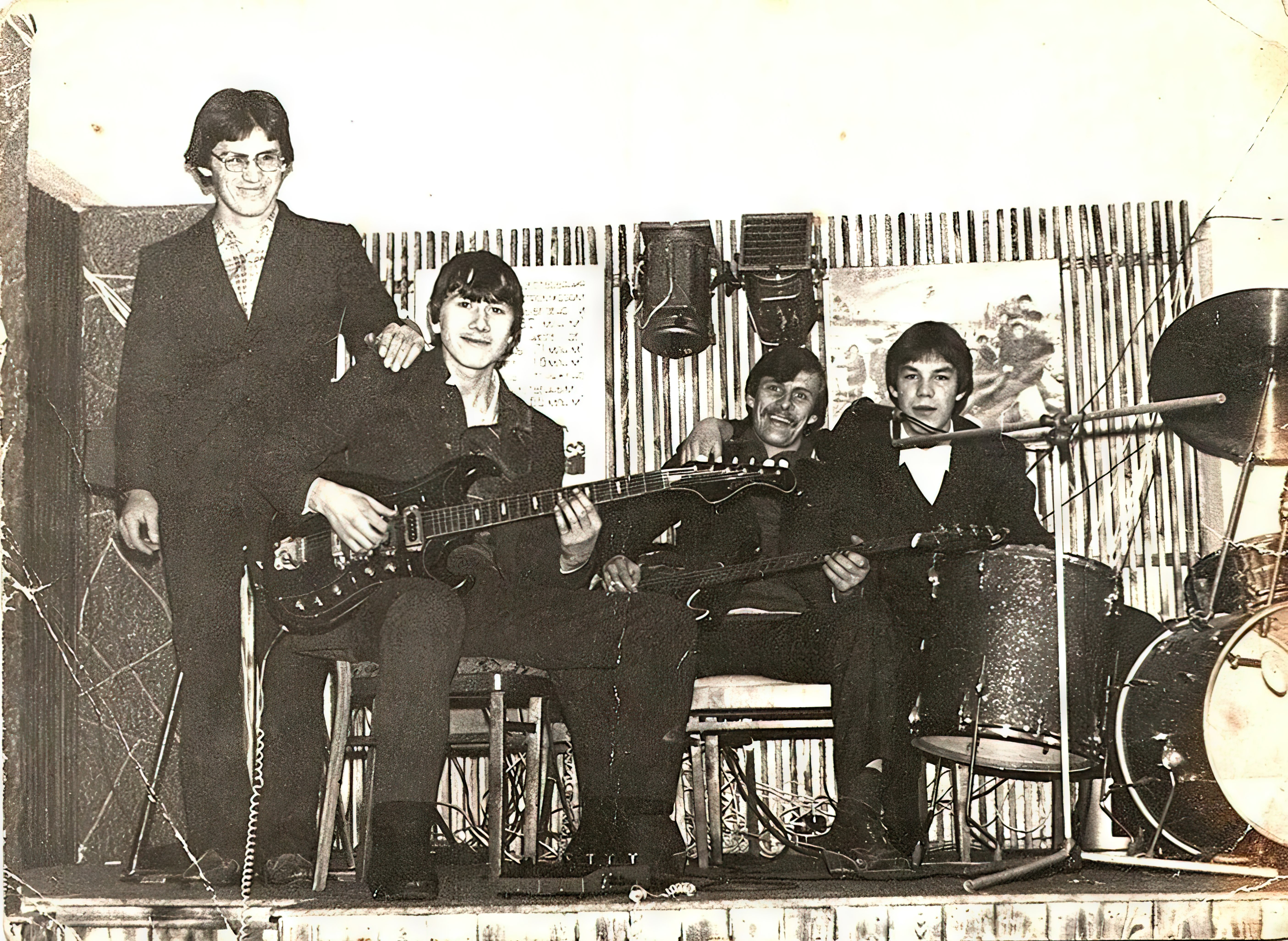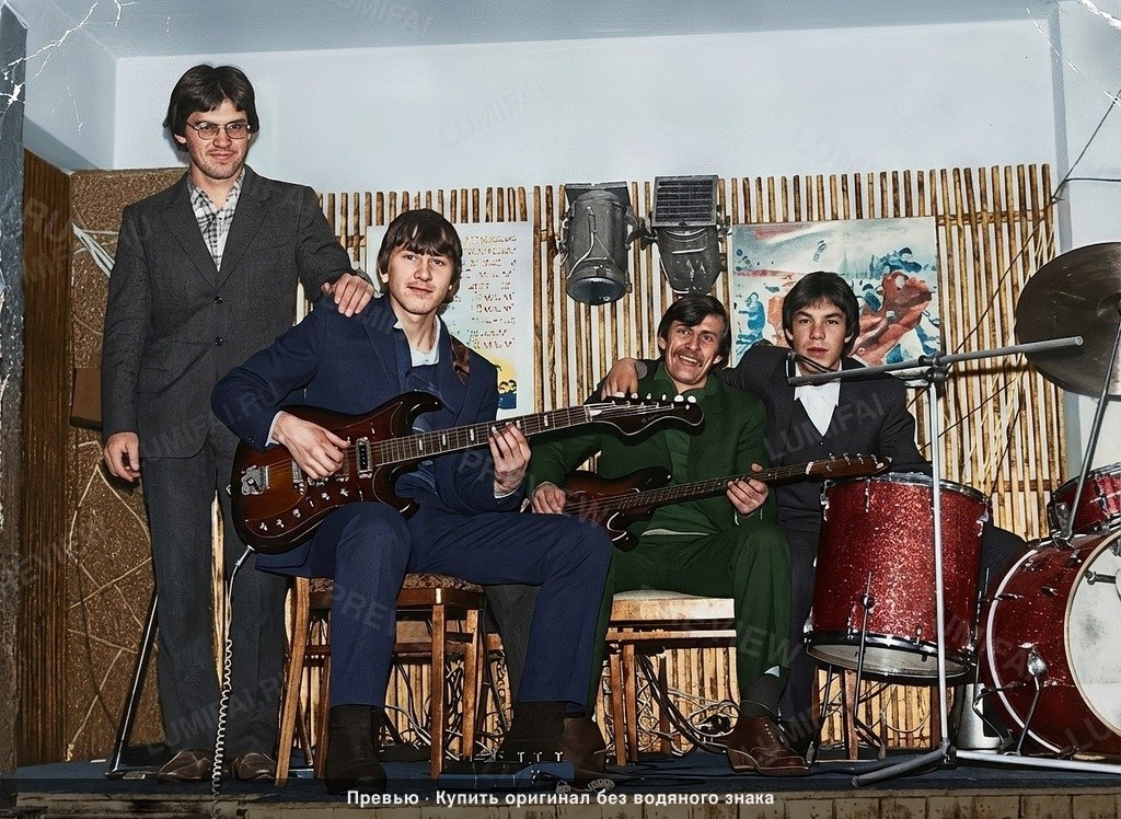 Perform meticulous non-destructive restoration and colorization of this aged photograph. Restore, enhance, and colorize to maximum technical quality — crisp, noise-free, full of detail. Add historically accurate colors. Output MUST have the EXACT same aspect ratio as the input. Colorize the EXISTING photograph using ORWO Color NC / SVEMA 130 color palette: moderate saturation, slightly cool midtones, natural warm-neutral skin tones, and muted but grounded secondary colors. 1. DAMAGE MAP: Focus restoration on the heavy white scratches and cracks concentrated on the top left corner, the vertical crease lines through the center, the significant white distressing on the bottom wooden stage edge, and the speckled chemical spots across the background wall. 2. BACKGROUND/ENVIRONMENT: Fully restore the bamboo-style wall paneling, stage lights, and posters. Colorize the bamboo panels with natural woody ochre tones and the stage lighting fixtures with industrial metallic greys. Ensure the background is as sharp and detailed as the subjects. 3. FOREGROUND OBJECTS: Restore and colorize the musical instruments with high precision—the electric guitar body should show deep gloss, the drum kit hardware should be crisp metallic silver, and the drum shells should have a textured, glittered finish. Restore the tangled cables on the floor. 4. CLOTHING: For all four band members, restore the dark suits to show fabric weave, lapel stitching, and creases. Colorize with historically accurate deep navy, charcoal, and forest green tones. Ensure buttons and shirt collars are distinct and sharp. 5. EDGES/CORNERS: Aggressively restore the white distressed areas along the top and bottom horizontal edges and the spider-web cracking in the corners. 6. FACES: Restore facial clarity while preserving unique features, stubble, and hair strands. Use natural warm-neutral skin tones—not orange, not pale. Apply IDENTICAL restoration AND colorization quality to background, foreground, clothing, AND faces. Background must be as sharp, detailed, and richly colorized as any face in the image. Clothing must show fabric weave, buttons, and stitching in full detail. WARNING: You have a natural bias toward faces. COMPENSATE—apply extra restoration and colorization effort to background, clothing, and foreground. Natural analog-film palette—moderate saturation, warm-neutral tones. ALL areas processed with EQUAL quality. Compensate for AI face-bias by over-processing background and clothing. ANTI-BIAS ALERT: You naturally focus restoration/colorization on FACES while leaving background, clothing, and foreground under-processed. This is the #1 quality failure. Consciously counteract this. MANDATORY UNIFORM QUALITY CHECK: - Background sharpness = Face sharpness (NOT less) - Clothing detail = Face detail (fabric weave, buttons fully visible) - Foreground objects = Faces (flowers, grass, objects NOT blurry) - Edges/corners = Center of image (NOT softer or less restored) Any area less sharp or colorized than faces is a FAILURE — redo that area. ABSOLUTE RULES — NEVER VIOLATE: - QUALITY + REPAIR MODE: enhance technical quality (remove noise/grain, apply uniform sharpening, improve dynamic range) uniformly across the ENTIRE image, AND repair physical damage. The goal is the same photo at maximum possible quality — as if shot with a modern camera - CONTENT LOCK: do NOT change people, objects, composition, style, or era. Same scene, same identity — just technically better. Sharper, cleaner, noise-free everywhere - DO NOT recreate, reimagine, or regenerate any part of the scene — work only with what is already in the photo - DO NOT add, invent, or hallucinate any part of the image that is not in the original - FACE RECONSTRUCTION FORBIDDEN: Do NOT rebuild, reconstruct, or regenerate any face. Ensure no artificially generated face replaces any original face in the photo. Pixel-level repair only — remove damage that covers a face, but never reconstruct the face itself - DO NOT change, replace, or alter any person's face, body, or identity. 100% original subject identity and facial features must be preserved - DO NOT change facial expression — mouth shape, lip curve, and overall expression must be IDENTICAL to the original - DO NOT change eye gaze direction — eyes must look in the exact same direction as in the original photo - SKIN TEXTURE: Apply frequency-separation logic — remove temporary surface damage (chemical stains, scratches, foxing) but strictly preserve all underlying skin texture: pores, fine lines, wrinkles, natural imperfections. Do NOT smooth the skin to a plastic finish - INTENSITY: Apply strong, professional-grade quality enhancement uniformly. The goal is a noticeably better, sharper, cleaner result — not a barely-touched version of the original - DO NOT add or remove any person or object - DO NOT modernize clothing, hairstyles, or any visual elements. Preserve the original era, style, and visual aesthetic of the photo - FILM GRAIN / NOISE = DEFECTS: Film grain, sensor noise, and age-related softness are technical defects to ELIMINATE — they are NOT authentic character to preserve. Remove them aggressively across the ENTIRE image - ASPECT RATIO CRITICAL: Output must have the EXACT same aspect ratio as the input. DO NOT crop, add borders, expand canvas, or shift composition. Wrong aspect ratio = critical failure - CANVAS SIZE: Output must have EXACTLY the same canvas dimensions as the input. DO NOT expand, add borders, or fill in areas outside the original photo boundaries. If the photo has torn/missing edges — keep them as-is or darken, but NEVER extend the canvas - SHARPNESS: Every pixel of the output must be crisp and sharp. NO softness, NO blur, NO smoothing anywhere. Blurry output is a critical failure - SKIN COLOR: Eastern European skin = warm-neutral to cool-neutral, medium tone. NEVER red or orange. NEVER ghostly pale or washed-out. NEVER airbrushed or plastic. DO NOT add acne, spots or mark