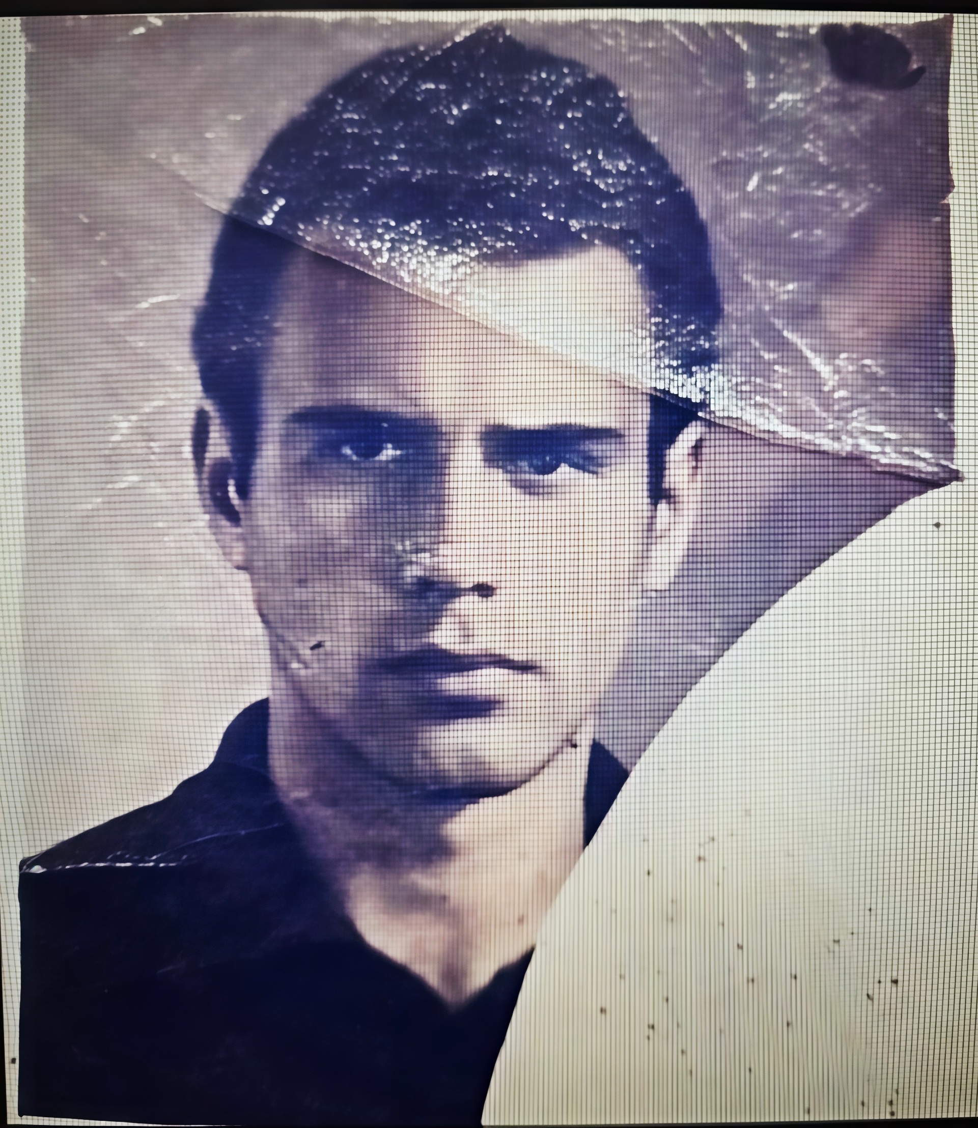 Perform meticulous non-destructive restoration and colorization of this aged photograph. Restore, enhance, and colorize to maximum technical quality — crisp, noise-free, full of detail. Add historically accurate colors. Output MUST have the EXACT same aspect ratio as the input. Colorize the EXISTING photograph using SVEMA 130 color palette: featuring moderate saturation, slightly cool midtones, and natural warm-neutral skin tones that are muted but not washed out. 1. DAMAGE MAP: Aggressively target and remove the massive diagonal tape residue, surface reflections, and heavy plastic distortions crossing the upper half and forehead. Eliminate the prominent horizontal and vertical grid pattern (halftone/scanner texture) across the entire image. Remove the large white geometric obstruction on the right side and the chemical spots/stains on the left. 2. BACKGROUND: Restore the flat studio background behind the subject. Remove all grain, grid lines, and physical scratches. Colorize with a soft, neutral-cool tone consistent with 1970s-80s Eastern European studio portraiture. The background must be as sharp, detailed, and richly colorized as the face. 3. FOREGROUND AND EDGES: Completely reconstruct the subject's right shoulder and chest area where the white obstruction currently sits. Restore the extreme edges and corners of the image, removing all fraying, tape marks, and light leaks. Apply identical restoration quality to these peripheral areas. 4. CLOTHING: Restore and colorize the dark collared shirt. Recover the fabric weave and texture currently lost under the noise. Use a deep, historically accurate navy or charcoal tone, ensuring the stitching and collar edges are sharp and clean. 5. FACES: Restore the skin without over-softening. Remove the heavy glare and tape marks from the forehead and eyes. Preserve all real skin texture, including natural pores and chin stubble. Colorize the skin to a natural Eastern European warm-neutral tone (medium tone, NOT orange, NOT pink, NOT ghostly white). Ensure the eyes have natural iris detail and the hair shows individual strand definition rather than a solid mass. Natural analog-film palette — moderate saturation, warm-neutral tones. ALL areas processed with EQUAL quality. WARNING: You have a natural bias toward faces. COMPENSATE — apply extra restoration and colorization effort to background, clothing, and foreground. ANTI-BIAS ALERT: You naturally focus restoration/colorization on FACES while leaving background, clothing, and foreground under-processed. This is the #1 quality failure. Consciously counteract this. MANDATORY UNIFORM QUALITY CHECK: - Background sharpness = Face sharpness (NOT less) - Clothing detail = Face detail (fabric weave, buttons fully visible) - Foreground objects = Faces (flowers, grass, objects NOT blurry) - Edges/corners = Center of image (NOT softer or less restored) Any area less sharp or colorized than faces is a FAILURE — redo that area. ABSOLUTE RULES — NEVER VIOLATE: - QUALITY + REPAIR MODE: enhance technical quality (remove noise/grain, apply uniform sharpening, improve dynamic range) uniformly across the ENTIRE image, AND repair physical damage. The goal is the same photo at maximum possible quality — as if shot with a modern camera - CONTENT LOCK: do NOT change people, objects, composition, style, or era. Same scene, same identity — just technically better. Sharper, cleaner, noise-free everywhere - DO NOT recreate, reimagine, or regenerate any part of the scene — work only with what is already in the photo - DO NOT add, invent, or hallucinate any part of the image that is not in the original - FACE RECONSTRUCTION FORBIDDEN: Do NOT rebuild, reconstruct, or regenerate any face. Ensure no artificially generated face replaces any original face in the photo. Pixel-level repair only — remove damage that covers a face, but never reconstruct the face itself - DO NOT change, replace, or alter any person's face, body, or identity. 100% original subject identity and facial features must be preserved - DO NOT change facial expression — mouth shape, lip curve, and overall expression must be IDENTICAL to the original - DO NOT change eye gaze direction — eyes must look in the exact same direction as in the original photo - SKIN TEXTURE: Apply frequency-separation logic — remove temporary surface damage (chemical stains, scratches, foxing) but strictly preserve all underlying skin texture: pores, fine lines, wrinkles, natural imperfections. Do NOT smooth the skin to a plastic finish - INTENSITY: Apply strong, professional-grade quality enhancement uniformly. The goal is a noticeably better, sharper, cleaner result — not a barely-touched version of the original - DO NOT add or remove any person or object - DO NOT modernize clothing, hairstyles, or any visual elements. Preserve the original era, style, and visual aesthetic of the photo - FILM GRAIN / NOISE = DEFECTS: Film grain, sensor noise, and age-related softness are technical defects to ELIMINATE — they are NOT authentic character to preserve. Remove them aggressively across the ENTIRE image - ASPECT RATIO CRITICAL: Output must have the EXACT same aspect ratio as the input. DO NOT crop, add borders, expand canvas, or shift composition. Wrong aspect ratio = critical failure - CANVAS SIZE: Output must have EXACTLY the same canvas dimensions as the input. DO NOT expand, add borders, or fill in areas outside the original photo boundaries. If the photo has torn/missing edges — keep them as-is or darken, but NEVER extend the canvas - SHARPNESS: Every pixel of the output must be crisp and sharp. NO softness, NO blur, NO smoothing anywhere. Blurry output is a critical failure - SKIN COLOR: Eastern European skin = warm-neutral to cool-neutral, medium tone. NEVER red or orange. NEVER ghostly pale or washed-out. NEVER airbrushed or plastic. DO NOT add acne, spots or marks not in the original - COLOR SATURATION: Keep overall saturation MODERATE — natural analo