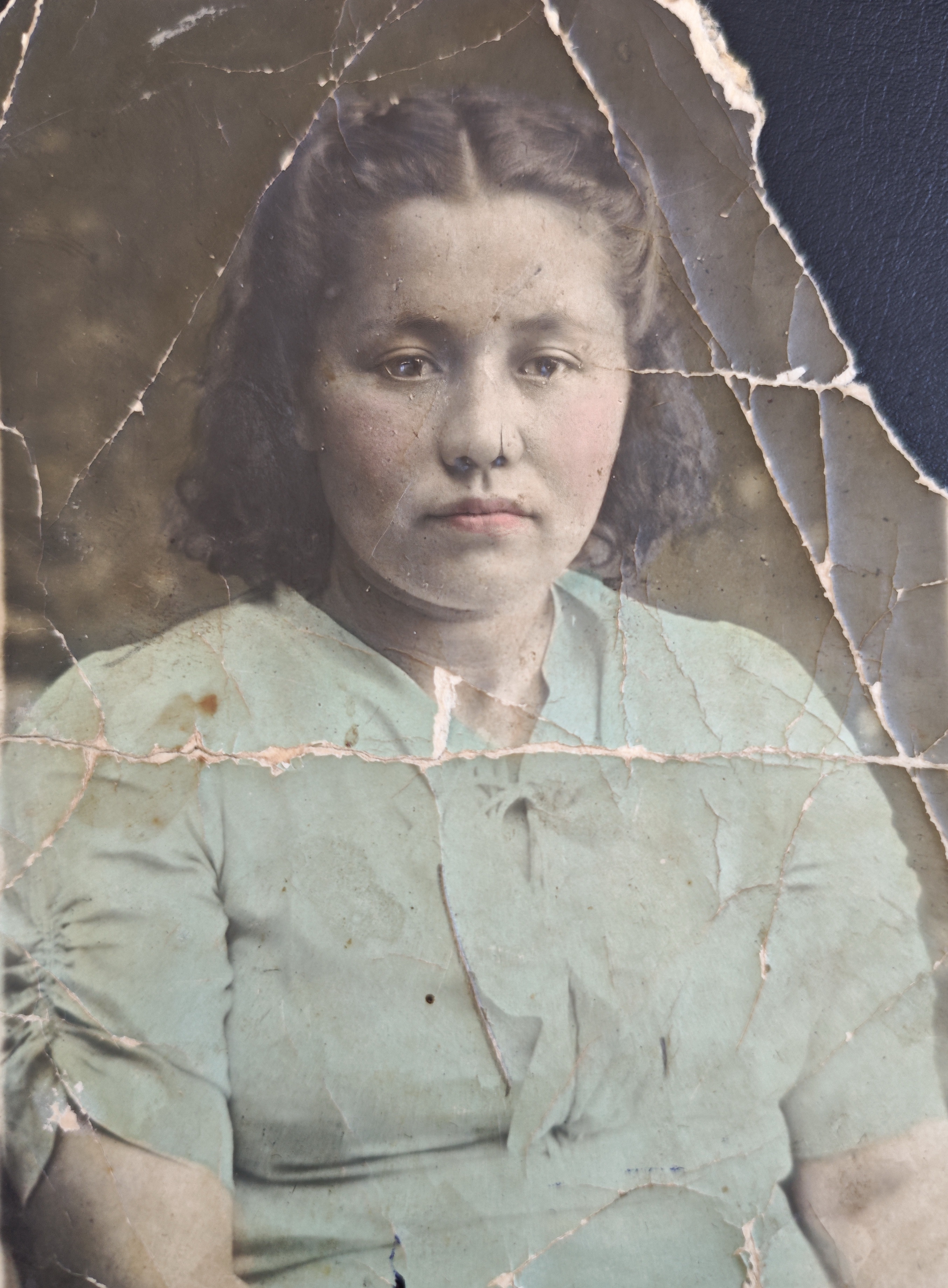 Sure, here is the prompt text: --- Gemini, please restore, enhance, and colorize this photograph based on the following instructions: 1. **RESTORE** - Remove all scratches, tears, and folds visible across the entire image. - Eliminate stains and mold, particularly noticeable on the background and upper parts of the photograph. - Restore areas of fading, bringing back original detail and clarity. 2. **ENHANCE QUALITY** - Increase the sharpness and micro-detail in the subject’s hair, fabric of clothing, skin, and eyes. - Improve tonal contrast and dynamic range to bring out depth and dimension. - Recover lost detail in shadows on the face and highlights on the clothing. - Reduce film grain while maintaining a natural texture. 3. **COLORIZE** - Skin tones should be a natural warm beige with a warm ivory/light tan appearance. - Muted and desaturated colors are necessary across the entire image, ensuring the photograph looks like a genuine color analog from that era, not a vivid painting. - The woman in the photograph is the sole subject, seated centrally. - Her hair is dark and styled in loose waves around her face. - Her clothing is a vintage blouse from the early to mid-20th century, likely a muted pastel color, imagined as a pale, desaturated blue or green. - Background elements should have historically accurate subdued colors, with muted tones that reflect the vintage setting. Preserve the position and integrity of all elements in the photo while adhering strictly to the coloration rules for a historically accurate restoration. ABSOLUTE RULES — NEVER VIOLATE: - DO NOT add, invent, or hallucinate any part of the image that is not in the original - DO NOT change the framing or composition — keep it exactly the same - DO NOT add any new damage, folds, creases, tears, dark borders, vignettes, or artifacts - DO NOT change, replace, or alter any person's face, body, or identity - DO NOT add or remove any person or object - DO NOT modernize clothing, hairstyles, or any visual elements - Keep the exact same framing, crop, and aspect ratio as the original - SKIN TONES: warm ivory/light tan — NEVER red, NEVER orange, NEVER pink - All colors MUTED and DESATURATED — real analog film, NOT vivid digital - Apply uniform sharpness to the ENTIRE image — NO background blur