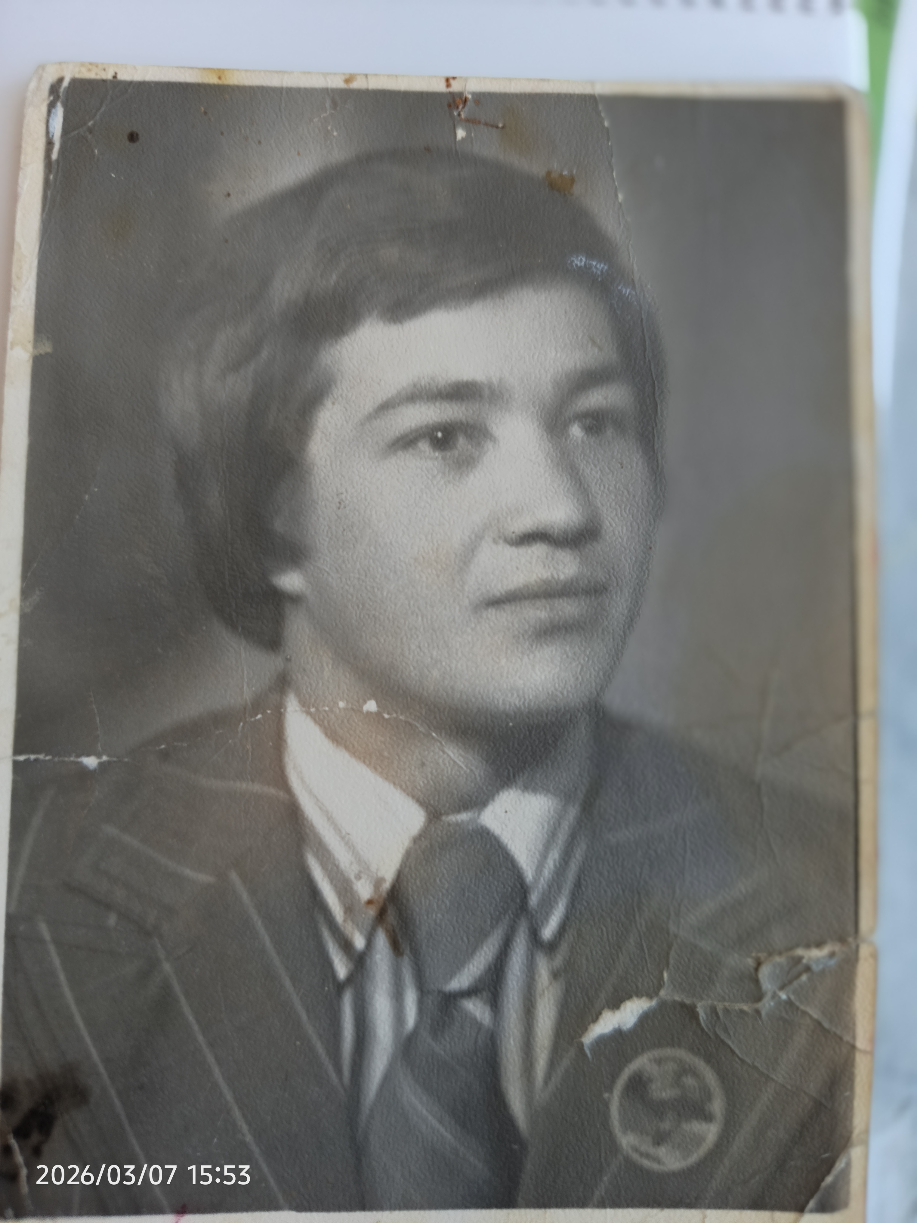 RESTORE: - Remove physical damage including visible scratches, folds at the bottom, and stains on the left side of the photograph. - Eliminate any mold or fading present on the image surface. ENHANCE QUALITY: - Increase sharpness and micro-detail in the hair, fabric texture of the suit, and facial features such as skin and eyes. - Improve overall tonal contrast and dynamic range. - Recover lost shadow detail in hair and highlight detail in the shirt. - Reduce film grain while keeping a natural texture. COLORIZE: - Photo is from the mid-20th century, possibly 1970s, settings should reflect this era. - Person facing forward, slightly tilted head. - Natural warm beige skin tone, keeping it as realistic as possible — NOT red, NOT orange, NOT pink. - Hair is likely a natural dark or medium brown matching typical styles of the era. - Suit is a dark, muted color, likely a shade of brown or gray with subtle pinstripes. - Shirt is a light, muted color, could be an off-white or pale color typical of dress shirts. - Tie should complement the suit and shirt, possibly a muted and subdued pattern or color. - Ensure all colors are muted and desaturated, reflective of a real analog photo, maintaining historical accuracy. ABSOLUTE RULES — NEVER VIOLATE: - DO NOT add, invent, or hallucinate any part of the image that is not in the original (do not extend cropped areas, do not fill missing parts with invented content) - DO NOT change the framing or composition — if the photo is cropped, keep it cropped exactly the same way - DO NOT add any new damage, folds, creases, tears, dark borders, vignettes, or artifacts - DO NOT colorize — if the photo is black and white, the output must be black and white - DO NOT change, replace, or alter any person's face, body, or identity - DO NOT add or remove any person or object - DO NOT modernize clothing, hairstyles, or any visual elements - ONLY fix what is already damaged — remove existing scratches, tears, stains, fading - Keep the exact same framing, crop, and aspect ratio as the original