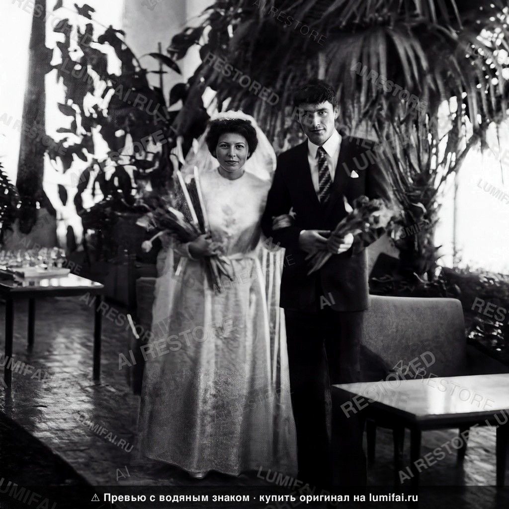 Restore and enhance the following photograph: 1. **RESTORE**: Remove all physical damage, including scratches, tears, folds, stains, fading, mold, and dust spots. 2. **ENHANCE QUALITY**: - Sharpen and improve the entire image uniformly; ensure that the background, trees, ground, clothing, and faces are all equally sharp—no background blur or depth-of-field effects. - Improve tonal contrast and dynamic range across the entire frame. - Reduce film grain while preserving the natural film texture. - Recover lost shadow and highlight detail. **Photo Details**: There are two people in the photo: a woman wearing a white wedding gown holding a bouquet and a man in a dark suit with a patterned tie standing beside her. They are positioned centrally in a lush indoor setting with large plants in the background, indicative of a mid-20th century wedding reception. **Specific Damage**: The photo displays noticeable scratches across the woman's gown, a tear near the bottom right corner, and fading particularly affecting the outlines of the faces. **Quality Enhancements Needed**: The most critical enhancements are sharpness across the entire image, contrast improvements, and recovering details in the shadowy areas and in the highlights on both subjects' faces while preserving the original black and white tonal character. ABSOLUTE RULES — NEVER VIOLATE: - DO NOT add, invent, or hallucinate any part of the image that is not in the original - DO NOT change the framing or composition — keep it exactly the same - DO NOT add any new damage, folds, creases, tears, dark borders, vignettes, or artifacts - DO NOT change, replace, or alter any person's face, body, or identity - DO NOT add or remove any person or object - DO NOT modernize clothing, hairstyles, or any visual elements - Keep the exact same framing, crop, and aspect ratio as the original - Preserve original tonal character: sepia stays sepia, black and white stays black and white - Apply uniform sharpness to the ENTIRE image — background and foreground equally. NO background blur