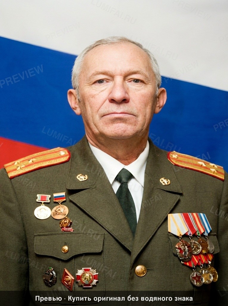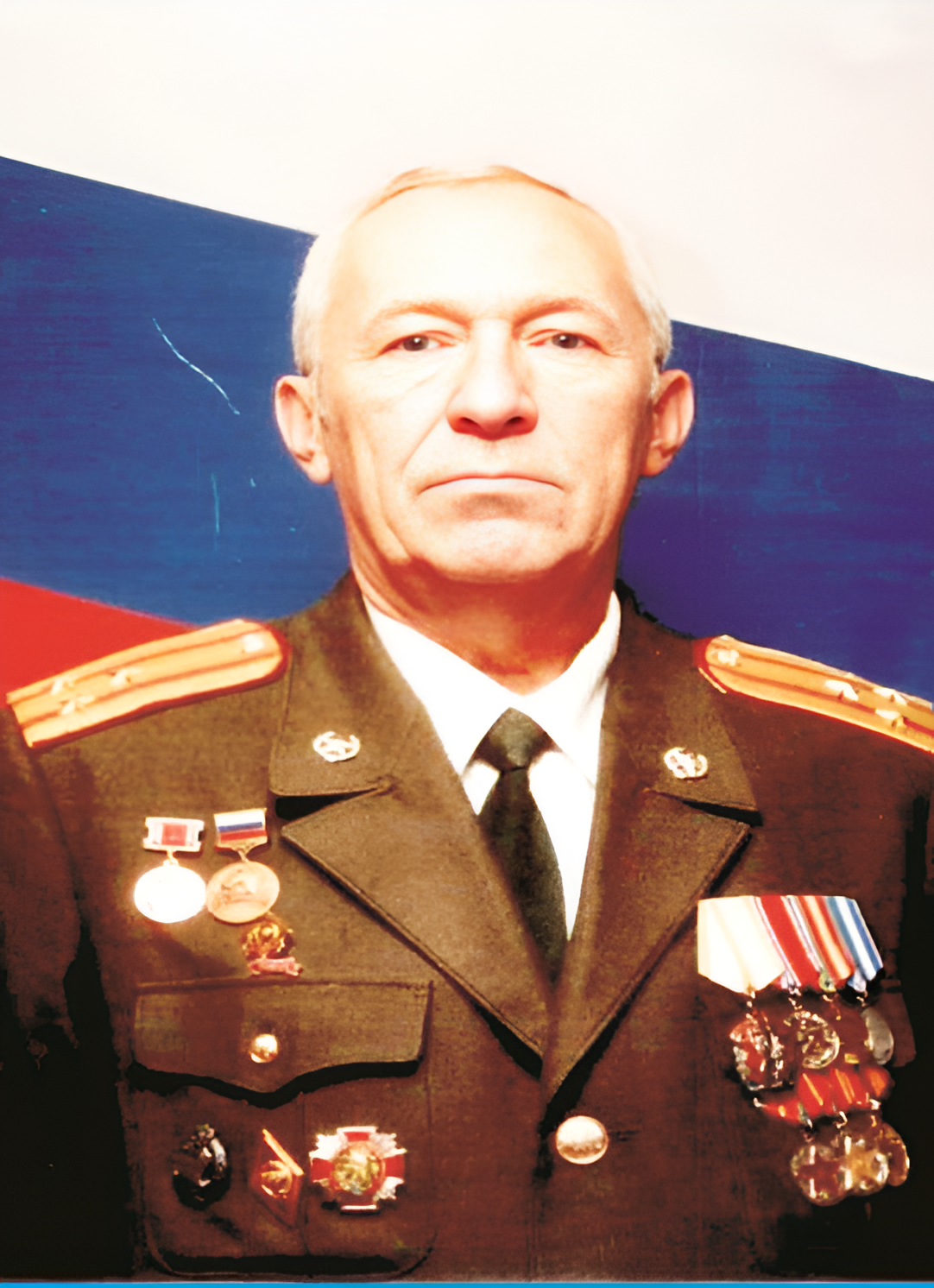 Comprehensive restoration and high-fidelity enhancement of this portrait featuring one senior military officer in a Russian uniform. **Restoration Details:** - Remove all surface damage, specifically the white vertical scratches and dust spots on the blue section of the background flag. - Eliminate color bleeding and chromatic aberration along the edges of the white, blue, and red background stripes. - Repair high-frequency noise and scanning artifacts throughout the frame. **Uniform Quality Requirements:** - Apply identical sharpening and detail recovery to the ENTIRE image. Every region must be in sharp focus with zero background blur or depth-of-field. - **Clothing & Insignia:** Restore the olive-drab uniform fabric weave with crisp texture. Sharpen all gold shoulder boards, buttons, and individual medals. Reconstruct the precise details of the ribbons, metal engravings, and color enamel on all chest decorations with equal clarity to the face. - **Background:** The tricolor flag must be rendered with smooth, solid blocks of color and sharp, clean dividing lines, free of marring or fading. - **Subject:** Sharpen the facial features, grey hair, and skin texture. Maintain the natural skin tone and lighting. **Technical Enhancements:** - Recover details in the blown-out highlights of the white shirt collar and top white background stripe. - Deepen shadow detail in the tie and uniform pockets. - Enhance tonal contrast to make the medals pop while preserving the warm, saturated color palette of the original film. - Final output must look like a pristine, high-resolution original photograph with edge-to-edge sharpness and no digital smoothing. ABSOLUTE RULES — NEVER VIOLATE: - DO NOT add, invent, or hallucinate any part of the image that is not in the original - DO NOT change the framing or composition — keep it exactly the same - DO NOT add any new damage, folds, creases, tears, dark borders, vignettes, or artifacts - DO NOT change, replace, or alter any person's face, body, or identity - DO NOT add or remove any person or object - DO NOT modernize clothing, hairstyles, or any visual elements - Keep the exact same framing, crop, and aspect ratio as the original - UNIFORM QUALITY: Process the ENTIRE image with equal attention — foreground flowers/textures, background elements, and edges must have the SAME sharpness and detail as faces. Do NOT leave any area blurry, simplified, or less detailed than another - SKIN COLOR: Eastern European skin = pale/medium, cool-neutral tone. NEVER red, orange, or overly warm. NEVER airbrushed or plastic - COLOR SATURATION: Keep overall saturation LOW TO MODERATE — muted analog film look, NOT vivid digital colors` - Preserve original tonal character: sepia stays sepia, black and white stays black and white - Apply uniform sharpness to the ENTIRE image — background and foreground equally. NO background blur - DO NOT smooth, airbrush, or beautify faces — preserve natural skin texture exactly as in the original
