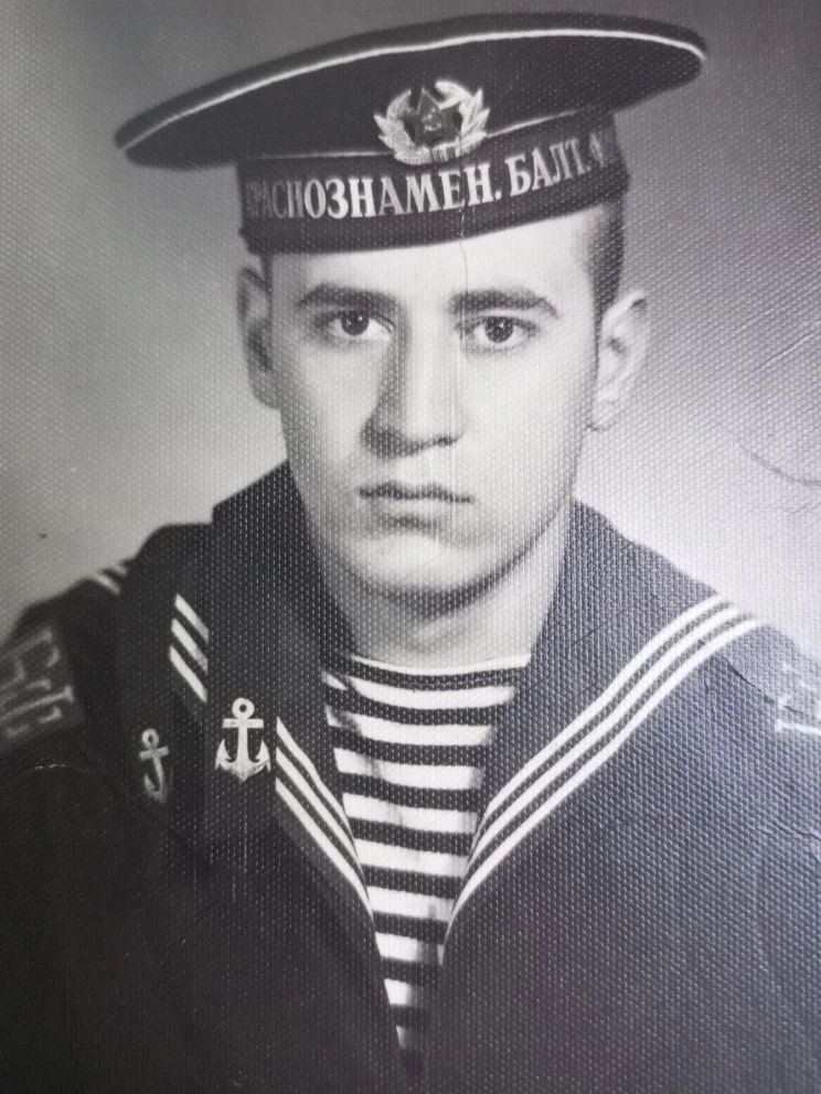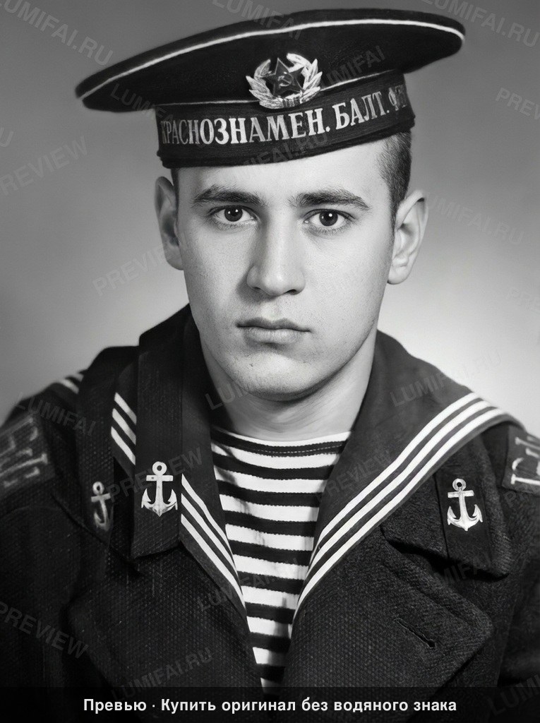 Professionally restore and high-definition enhance this mid-20th-century Soviet naval portrait of a single young sailor. RESTORATION OF DAMAGE: - Completely remove the heavy honeycomb/canvas texture overlaying the entire image. - Eliminate the prominent vertical crack/scratch running through the center of the sailor's hat band and forehead. - Fix the large scratch and light leak on the right edge of the frame. - Remove all dust spots, chemical stains, and micro-scratches across the background and clothing. UNIFORM QUALITY ENHANCEMENT: - Apply UNIFORM SHARPNESS to the entire frame. The sailor's face, the intricate Cyrillic lettering "КРАСНОЗНАМЕН. БАЛТ." on the tally, the Soviet emblem on the peak cap, the anchors on the lapels, and the striped telnyashka shirt must all be rendered with equal, crisp detail. - RECONSTRUCT NON-FACIAL TEXTURES: High-fidelity restoration must be applied to the heavy wool texture of the dark pea coat and the fine stitching of the uniform. Do not simplify or blur the clothing; every stripe and button must be as sharp as the eyes. - BACKGROUND: Restore the studio backdrop to a clean, smooth gradient without grain or artifacts, ensuring it is as high-quality as the subject. - NO DEPTH OF FIELD: Keep the entire image in a deep, flat photographic focus. No area should be softer than another. TONAL CHARACTER AND DETAIL: - Preserve the original monochromatic black and white tonal range; do not colorize. - Improve dynamic range: Recover highlight details in the white stripes of the shirt and the white bands of the cap, while deepening the blacks of the wool coat without losing texture in the shadows. - Sharpen the facial features—specifically the eyes, eyebrows, and lips—while maintaining a natural skin texture, ensuring it matches the sharpness of the uniform accessories. ABSOLUTE RULES — NEVER VIOLATE: - DO NOT add, invent, or hallucinate any part of the image that is not in the original - DO NOT change the framing or composition — keep it exactly the same - DO NOT add any new damage, folds, creases, tears, dark borders, vignettes, or artifacts - DO NOT change, replace, or alter any person's face, body, or identity - DO NOT add or remove any person or object - DO NOT modernize clothing, hairstyles, or any visual elements - Keep the exact same framing, crop, and aspect ratio as the original - UNIFORM QUALITY: Process the ENTIRE image with equal attention — foreground flowers/textures, background elements, and edges must have the SAME sharpness and detail as faces. Do NOT leave any area blurry, simplified, or less detailed than another - SKIN COLOR: Eastern European skin = pale/medium, cool-neutral tone. NEVER red, orange, or overly warm. NEVER airbrushed or plastic - COLOR SATURATION: Keep overall saturation LOW TO MODERATE — muted analog film look, NOT vivid digital colors` - Preserve original tonal character: sepia stays sepia, black and white stays black and white - Apply uniform sharpness to the ENTIRE image — background and foreground equally. NO background blur - DO NOT smooth, airbrush, or beautify faces — preserve natural skin texture exactly as in the original