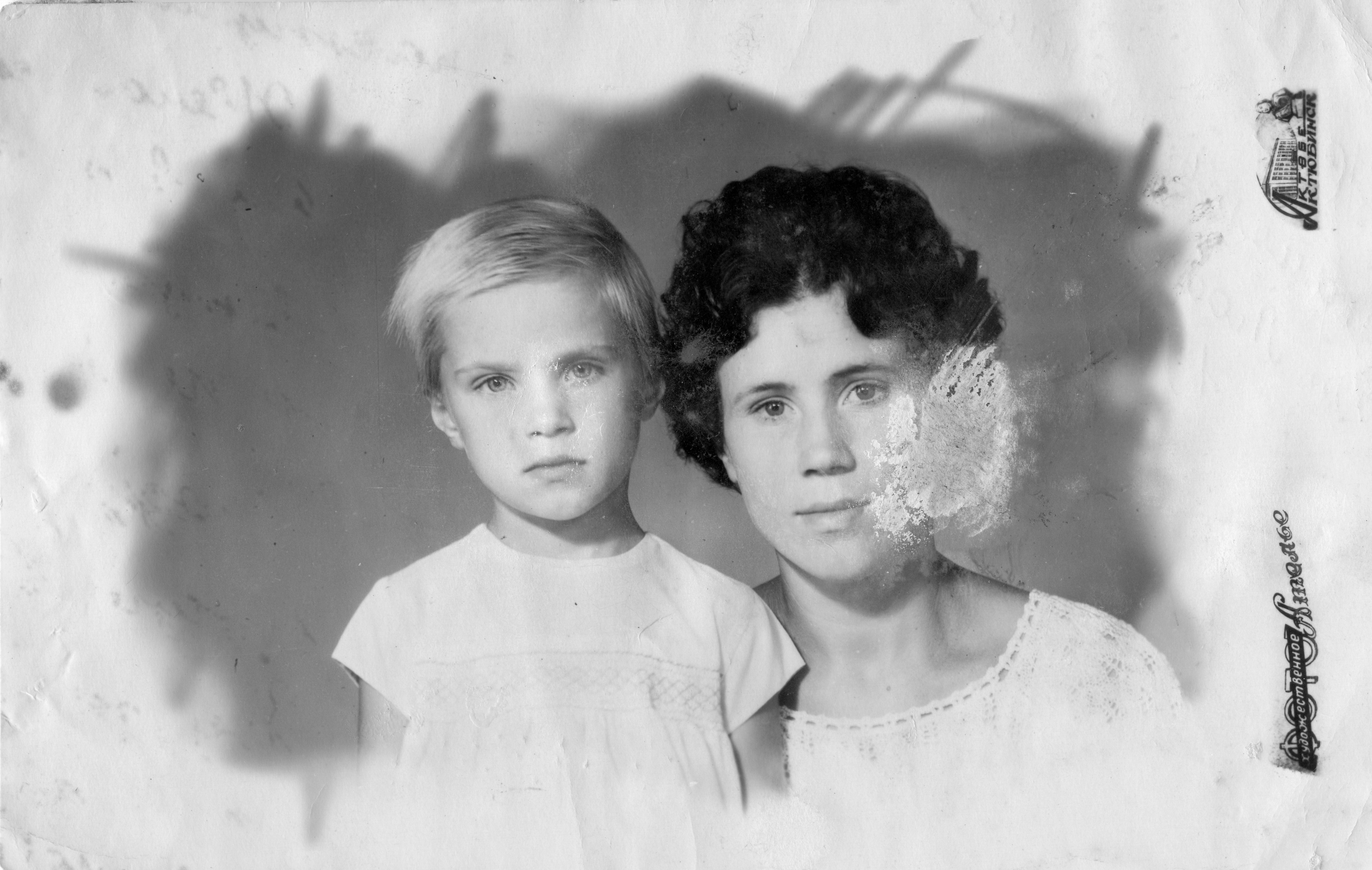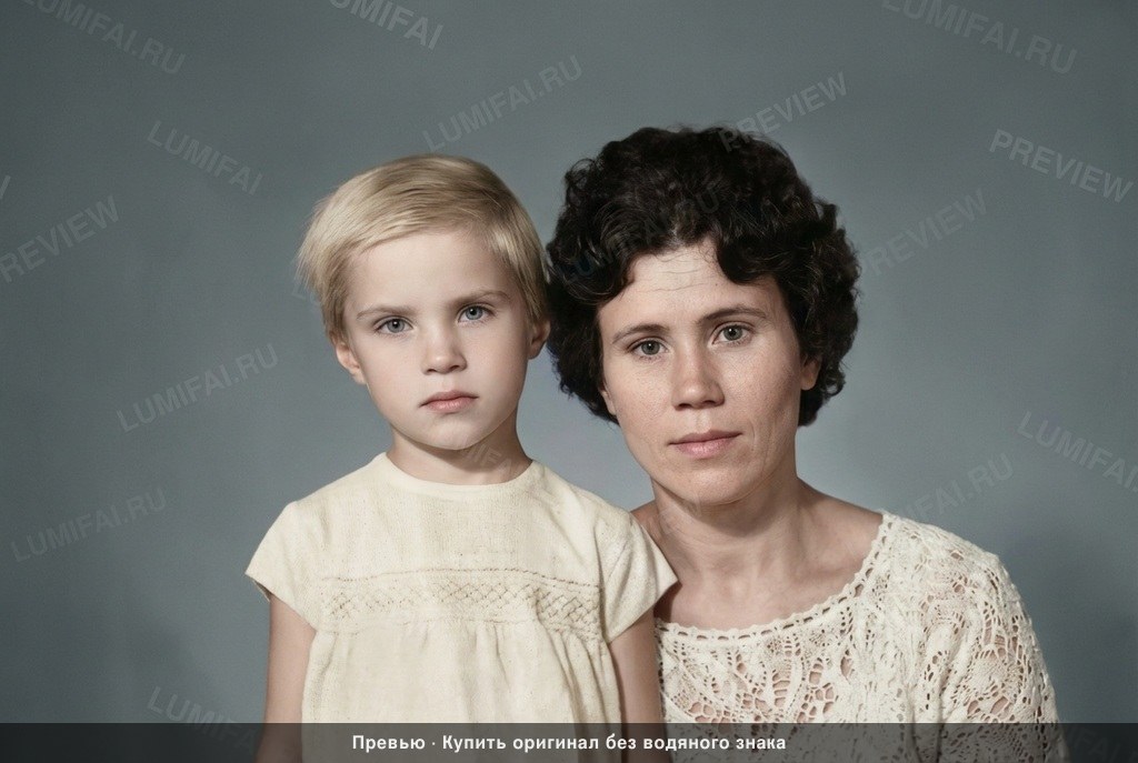 Restore and colorize this Soviet-era studio portrait of a young boy and a woman. **Restoration and Detail:** Remove the heavy white chemical corrosion/mold on the woman’s left cheek and the scribbled dark ink/stains in the background. Fix all surface scratches, edge wear, and paper texture grain. Sharpen the image to reveal high-resolution micro-details: individual hair strands for the boy’s light hair and the woman’s dark curls, iris patterns, and the intricate lace/knit textures of their white clothing. **Skin Tones:** Apply a pale to fair Eastern European complexion with cool-neutral undertones. Strictly avoid orange, red, or warm-golden hues. Preserve authentic skin texture, including visible pores and subtle lines; do not airbrush or smooth the faces. **Colorization:** Use a muted, realistic palette. The clothing should be a natural off-white or cream with subtle shadows. The background should be a desaturated, neutral studio grey or muted blue. **Style:** Muted analog-film color palette — slightly desaturated, cool-neutral, realistic 1980s Soviet color photo look. ABSOLUTE RULES — NEVER VIOLATE: - DO NOT add, invent, or hallucinate any part of the image that is not in the original - DO NOT change the framing or composition — keep it exactly the same - DO NOT add any new damage, folds, creases, tears, dark borders, vignettes, or artifacts - DO NOT change, replace, or alter any person's face, body, or identity - DO NOT add or remove any person or object - DO NOT modernize clothing, hairstyles, or any visual elements - Keep the exact same framing, crop, and aspect ratio as the original - UNIFORM QUALITY: Process the ENTIRE image with equal attention — foreground flowers/textures, background elements, and edges must have the SAME sharpness and detail as faces. Do NOT leave any area blurry, simplified, or less detailed than another - SKIN COLOR: Eastern European skin = pale/medium, cool-neutral tone. NEVER red, orange, or overly warm. NEVER airbrushed or plastic - COLOR SATURATION: Keep overall saturation LOW TO MODERATE — muted analog film look, NOT vivid digital colors` - SKIN TONES: natural, warm, lifelike — NOT red, NOT orange, NOT pale/washed-out, NOT plastic/airbrushed - DO NOT smooth, airbrush, or beautify faces — preserve ALL natural skin texture (pores, subtle imperfections) - SATURATION: moderate and natural — like a real color photograph. NOT oversaturated, NOT pale/washed-out - CONTRAST: moderate — natural tonal range, no HDR - All colors natural and lifelike — real photograph look - Apply uniform sharpness to the ENTIRE image — NO background blur