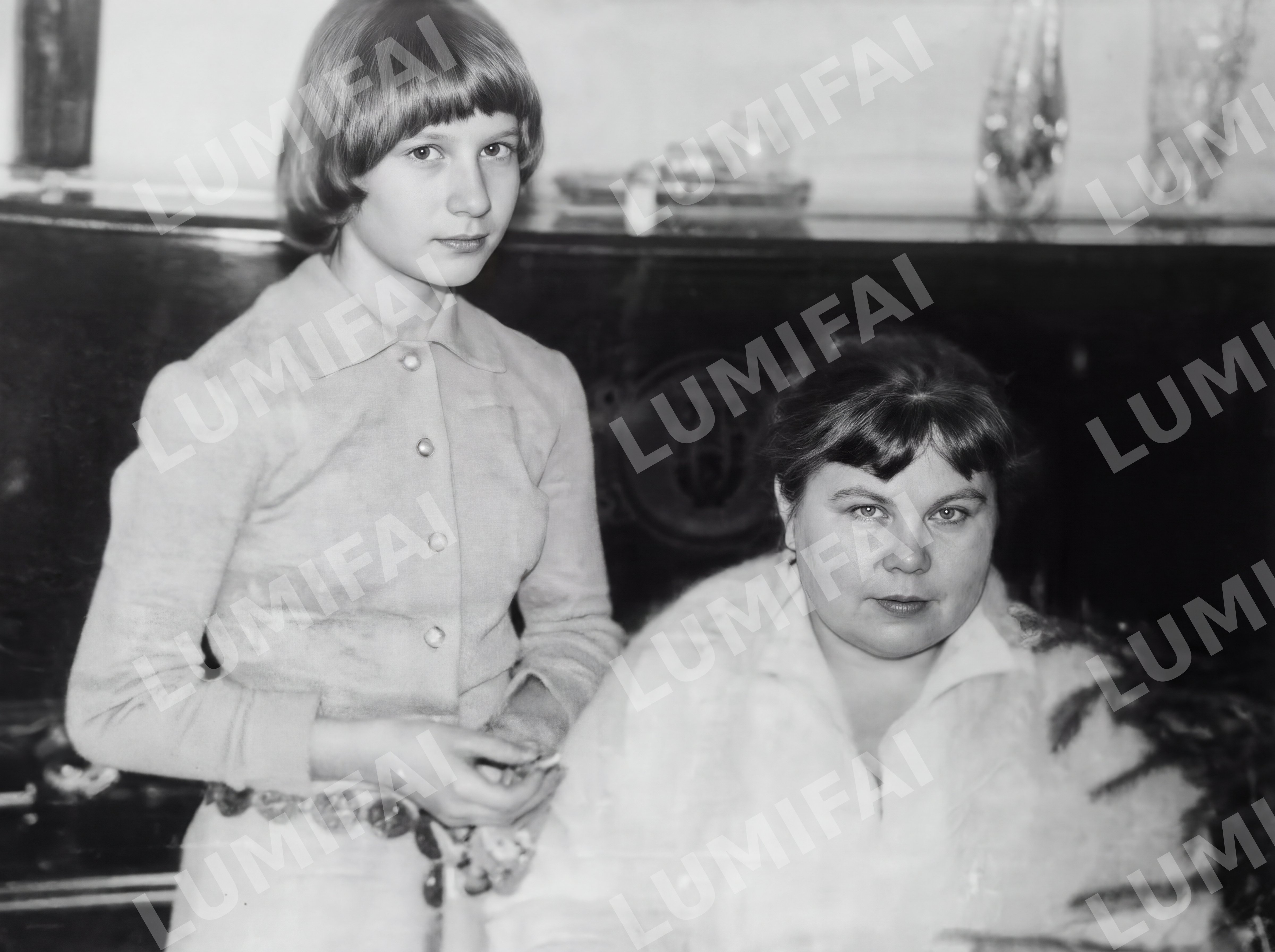 ``` Restore and enhance the image. It features two people: a young girl on the left standing, wearing a light-colored dress with buttons, and an older woman on the right sitting, in a light-colored blouse. Behind them is a dark piano with decorative vases on top, suggesting a mid-20th century setting. The photo shows scratches and small tears on the surface, especially noticeable at the top and bottom. There are visible folds and dust spots across the image. This is a black and white photo; maintain its tonal character. Instructions: 1. Remove all physical damage, including scratches, tears, folds, stains, and dust spots. 2. Improve sharpness uniformly across the whole image—background, objects, clothing, and faces should all be equally sharp. 3. Enhance the tonal contrast and dynamic range uniformly, recovering shadow and highlight detail. 4. Reduce film grain while preserving natural texture. 5. Maintain the original black and white tonal character, do not alter it to sepia or color. ``` ABSOLUTE RULES — NEVER VIOLATE: - DO NOT add, invent, or hallucinate any part of the image that is not in the original - DO NOT change the framing or composition — keep it exactly the same - DO NOT add any new damage, folds, creases, tears, dark borders, vignettes, or artifacts - DO NOT change, replace, or alter any person's face, body, or identity - DO NOT add or remove any person or object - DO NOT modernize clothing, hairstyles, or any visual elements - Keep the exact same framing, crop, and aspect ratio as the original - Preserve original tonal character: sepia stays sepia, black and white stays black and white - Apply uniform sharpness to the ENTIRE image — background and foreground equally. NO background blur