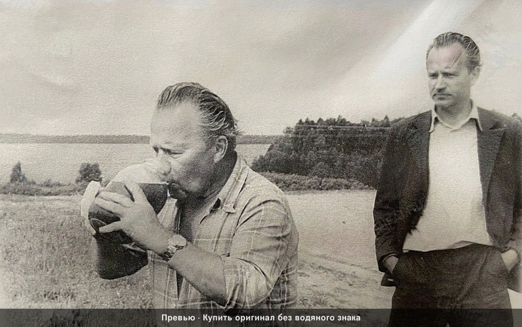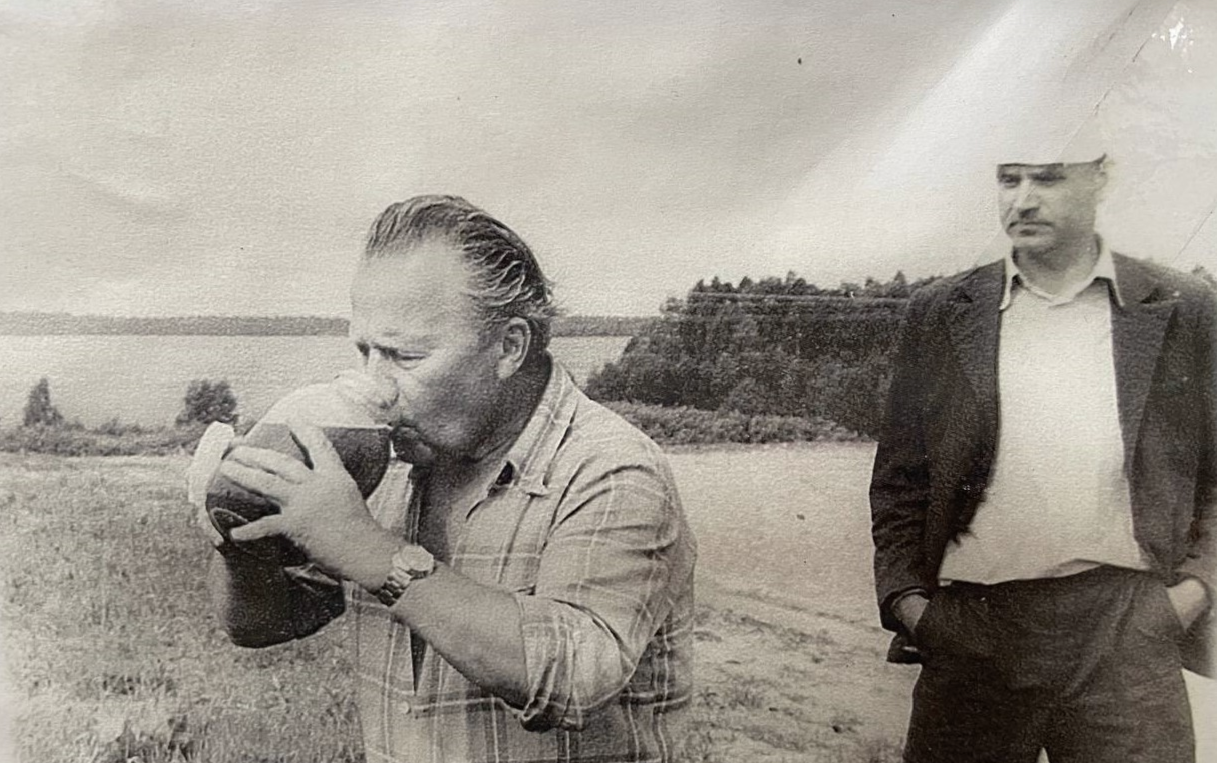 Perform a meticulous non-destructive restoration of this aged photograph. Preserve its authentic archival character. Only fix pixels that are visibly damaged — leave all intact areas exactly as-is. Damage inventory: 1. Large diagonal white crease/tear in the upper right corner cutting through the forehead and hair of the man in the suit. 2. Vertical white scratch/chemical streak on the far right edge of the frame. 3. Pronounced horizontal paper fold/crease line running across the top third of the image through the sky and the background trees. 4. Scattered white dust spots and circular chemical stains in the upper left sky area. 5. Surface scuffing and micro-scratches on the dark suit jacket of the man on the right. 6. Faded emulsion/white flare in the very top left corner. Fix instructions: 1. Fix the large crease in the upper right by inpainting the hair and forehead of the man from neighboring undamaged skin and hair pixels. 2. Fix the vertical scratch on the right edge by inpainting from the adjacent background textures. 3. Fix the horizontal fold line across the sky and trees by inpainting from the surrounding cloud and foliage textures. 4. Fix the dust spots and chemical stains in the upper left by inpainting from the clean sky pixels nearby. 5. Fix the scuffing on the suit jacket by inpainting with the surrounding dark fabric texture. 6. Fix the fading in the top left corner by blending it with the adjacent sky tones. For faces: pixel-level damage removal ONLY. Do NOT rebuild, reconstruct, or regenerate any face. Remove scratches and stains that cover the face, but preserve the exact underlying facial structure, expression, skin texture, and identity. Ensure no artificially generated face replaces any original. Preserve pores, fine lines, and natural skin imperfections — do NOT smooth to a plastic finish. Change ONLY the damaged areas listed above. Keep everything else — background, clothing, objects, faces, textures — pixel-perfect identical to the original photo. Do not enhance, sharpen, or reprocess any undamaged area. Preserve the original black and white tonal range and film grain exactly. ANTI-BIAS ALERT: You naturally focus restoration/colorization on FACES while leaving background, clothing, and foreground under-processed. This is the #1 quality failure. Consciously counteract this. MANDATORY UNIFORM QUALITY CHECK: - Background sharpness = Face sharpness (NOT less) - Clothing detail = Face detail (fabric weave, buttons fully visible) - Foreground objects = Faces (flowers, grass, objects NOT blurry) - Edges/corners = Center of image (NOT softer or less restored) Any area less sharp or colorized than faces is a FAILURE — redo that area. ABSOLUTE RULES — NEVER VIOLATE: - YOU ARE PERFORMING TARGETED INPAINTING — change ONLY pixels with clearly visible physical damage (scratches, tears, stains, chemical marks, fading). Every undamaged pixel must remain pixel-perfect identical to the original — same color, same sharpness, same texture, same tonal value. This is surgical repair, NOT a quality enhancement pass. - UNDAMAGED AREAS: background, clothing, furniture, walls — if not physically damaged, do NOT touch them. Do not "improve", "enhance", or "sharpen" areas that are already intact - DO NOT recreate, reimagine, or regenerate any part of the scene — work only with what is already in the photo - DO NOT add, invent, or hallucinate any part of the image that is not in the original - FACE RECONSTRUCTION FORBIDDEN: Do NOT rebuild, reconstruct, or regenerate any face. Ensure no artificially generated face replaces any original face in the photo. Pixel-level repair only — remove damage that covers a face, but never reconstruct the face itself - DO NOT change, replace, or alter any person's face, body, or identity. 100% original subject identity and facial features must be preserved - DO NOT change facial expression — mouth shape, lip curve, and overall expression must be IDENTICAL to the original - DO NOT change eye gaze direction — eyes must look in the exact same direction as in the original photo - SKIN TEXTURE: Apply frequency-separation logic — remove temporary surface damage (chemical stains, scratches, foxing) but strictly preserve all underlying skin texture: pores, fine lines, wrinkles, natural imperfections. Do NOT smooth the skin to a plastic finish - INTENSITY: Apply subtle, targeted corrections. Do NOT apply maximum processing to any area — natural and authentic result is the goal, not a "perfect" artificial image - DO NOT add or remove any person or object - DO NOT modernize clothing, hairstyles, or any visual elements. Preserve the authentic archival character of the photo - Keep the exact same framing, crop, and aspect ratio as the original - CANVAS SIZE: Output must have EXACTLY the same canvas dimensions as the input. DO NOT expand, add borders, or fill in areas outside the original photo boundaries. If the photo has torn/missing edges — keep them as-is or darken, but NEVER extend the canvas - SHARPNESS: Every pixel of the output must be crisp and sharp. NO softness, NO blur, NO smoothing anywhere. Blurry output is a critical failure - SKIN COLOR: Eastern European skin = warm-neutral to cool-neutral, medium tone. NEVER red or orange. NEVER ghostly pale or washed-out. NEVER airbrushed or plastic. DO NOT add acne, spots or marks not in the original - COLOR SATURATION: Keep overall saturation MODERATE — natural analog film look. NOT vivid digital. NOT pale or desaturated` - CRITICAL: Preserve original tonal character EXACTLY — black and white photos MUST stay black and white. Sepia photos MUST stay sepia. DO NOT add ANY color whatsoever. - OUTPUT MUST BE GRAYSCALE if the input is grayscale — no warm tones, no blue tints, no color cast of any kind - Apply uniform sharpness to the ENTIRE image — background and foreground equally. NO background blur - DO NOT smooth, airbrush, or beautify faces — preserve natural skin texture: pores
