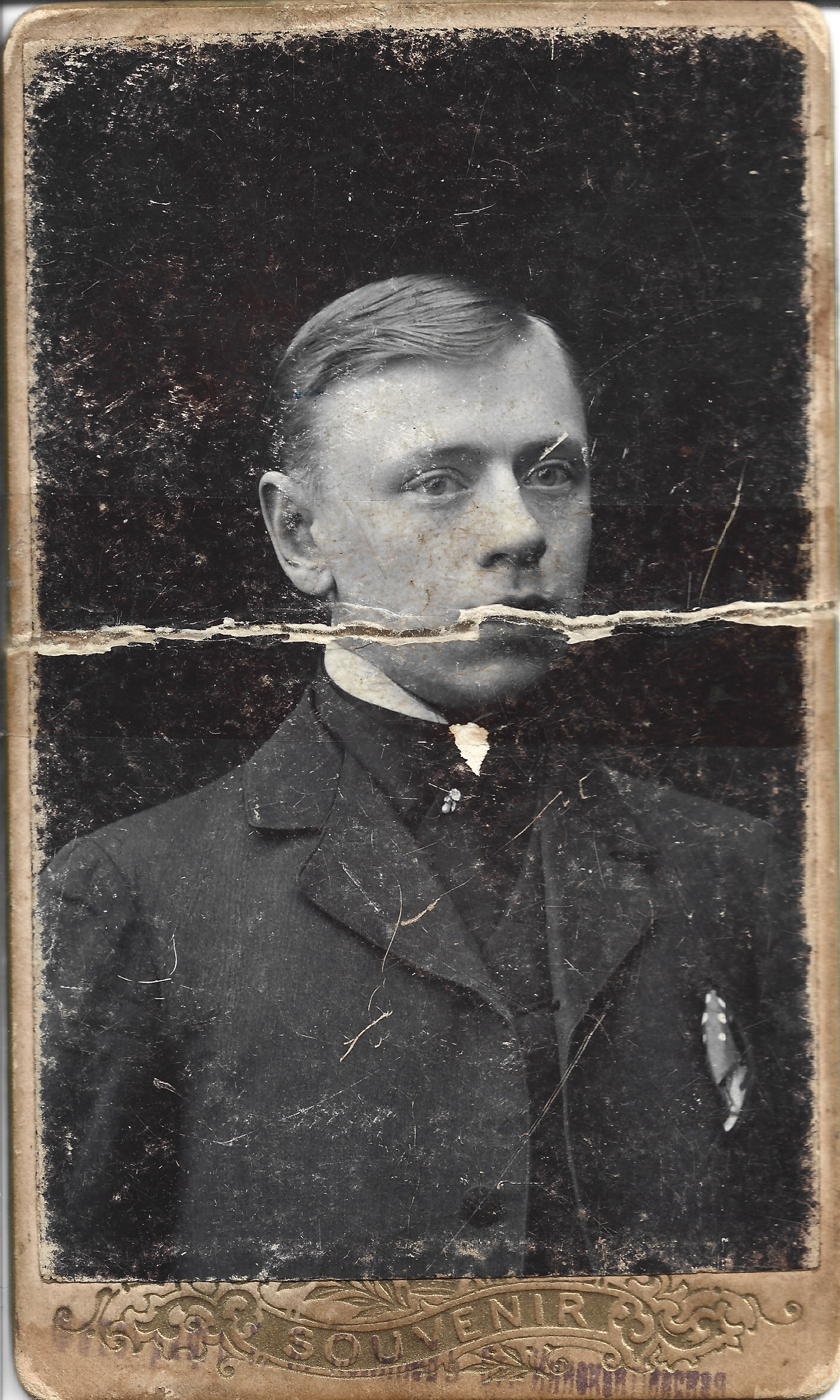 Professionally restore and high-resolution enhance this early 20th-century studio portrait of a single young man. RESTORATION OF DAMAGE: - Seamlessly repair the severe horizontal tear and crease running through the center of the image, specifically across the man's jawline, mouth, and ears. - Remove all surface abrasions, white scratches, and "snow-like" dust spots covering the dark background and the man’s suit jacket. - Fix the heavy edge wear and corner chipping, particularly at the top and left margins. - Remove the mold-like speckling and staining on the man's face and forehead while preserving natural skin pores and hair texture. UNIFORM QUALITY ENHANCEMENT: - Apply UNIFORM SHARPNESS and detail across the entire frame. Every pixel must receive equal enhancement. - Do NOT focus only on the face; the texture of the wool suit jacket, the visible lapels, the shirt collar, and the patterned pocket square must be as sharp and detailed as the eyes and skin. - Reconstruct the "SOUVENIR" embossed scrollwork at the bottom edge with perfect clarity and metallic-cardstock texture, ensuring the text and filigree are sharp and legible. - Stabilize the dark background to a clean, solid, deep tone while retaining the authentic grain of a vintage photograph. - Deepen the tonal contrast to recover lost details in the shadows of the jacket and the highlights of the white collar. AUTHENTICITY PRESERVATION: - Maintain the original monochromatic sepia-toned warmth and silver-gelatin character. - Do NOT convert to black and white or artificially colorize; keep the aged paper warmth. - Ensure the man's features—side-parted light hair, light-colored eyes, and youthful expression—are reconstructed realistically without an "AI-smoothed" or plastic look. - The final result must appear like a perfectly preserved original physical photograph with zero depth-of-field blur: every element from the bottom card scroll to the top background must be in crisp, uniform focus. ABSOLUTE RULES — NEVER VIOLATE: - DO NOT add, invent, or hallucinate any part of the image that is not in the original - DO NOT change the framing or composition — keep it exactly the same - DO NOT add any new damage, folds, creases, tears, dark borders, vignettes, or artifacts - DO NOT change, replace, or alter any person's face, body, or identity - DO NOT add or remove any person or object - DO NOT modernize clothing, hairstyles, or any visual elements - Keep the exact same framing, crop, and aspect ratio as the original - UNIFORM QUALITY: Process the ENTIRE image with equal attention — foreground flowers/textures, background elements, and edges must have the SAME sharpness and detail as faces. Do NOT leave any area blurry, simplified, or less detailed than another - SKIN COLOR: Eastern European skin = pale/medium, cool-neutral tone. NEVER red, orange, or overly warm. NEVER airbrushed or plastic - COLOR SATURATION: Keep overall saturation LOW TO MODERATE — muted analog film look, NOT vivid digital colors` - Preserve original tonal character: sepia stays sepia, black and white stays black and white - Apply uniform sharpness to the ENTIRE image — background and foreground equally. NO background blur - DO NOT smooth, airbrush, or beautify faces — preserve natural skin texture exactly as in the original