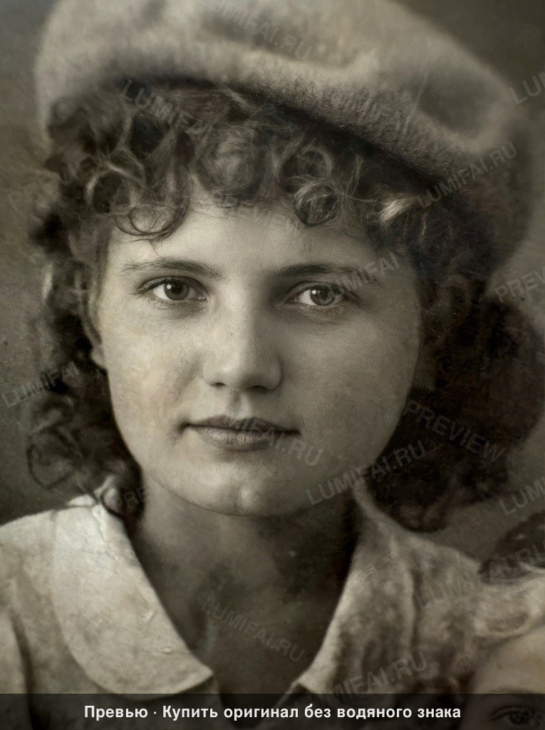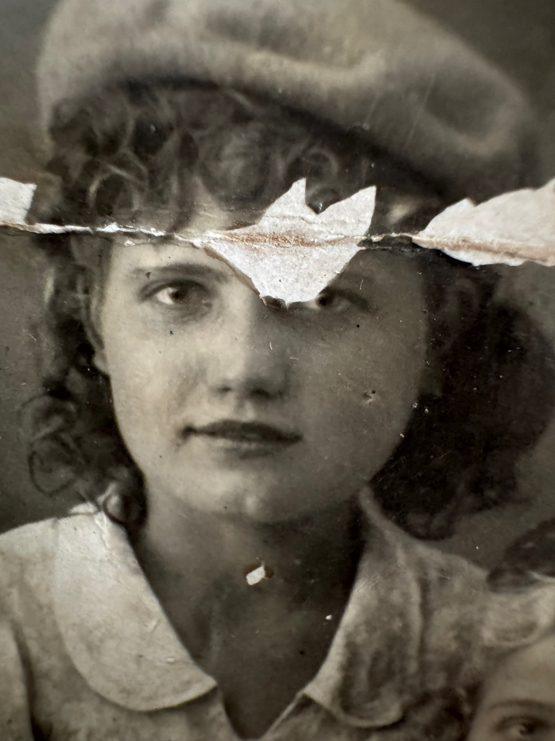 Perform a complete professional restoration and uniform high-definition enhancement of this vintage portrait while strictly preserving the original warm sepia monochrome tonal character. The image depicts one young woman prominently in the frame, wearing a textured wool beret and a collared blouse with a delicate pattern. Her hair is styled in distinct tight curls typical of the 1930s-1940s era. A second person's forehead and eye are visible in the very bottom right corner; this secondary figure must be restored with the same level of detail as the primary subject. RESTORE PHYSICAL DAMAGE: - Repair the severe horizontal tear and paper loss spanning across the center of the image, specifically reconstructing the woman’s forehead, the bridge of her nose, the upper portion of her right eye, and the transition into her curly hair and the beret. - Remove all white surface stains, pockmarks on the chin and neck, fine scratches, and dust spots scattered across the entire frame. - Repair the ragged edges and fading at the periphery of the photo. UNIFORM HIGH-DEFINITION ENHANCEMENT: - Apply EQUAL sharpening and detail recovery to every square inch of the frame. Do not prioritize the face over other elements. - RECONSTRUCT TEXTURES: The coarse wool weave of the beret, the individual strands and structure of the curls, the fabric pattern and seams of the Peter Pan collar, and the skin pores must all be rendered with matching, high-fidelity sharpness. - BACKGROUND & EDGES: The dark, mottled studio background must be cleaned of mold and noise, rendered with smooth gradients and uniform focus. There must be NO background blur or bokeh; the entire depth of the image should be crisp. - TONAL QUALITY: Increase dynamic range by recovering lost detail in the shadows of the hair and the highlights of the blouse. Retain the authentic silver-gelatin sepia warmth without shifting to neutral grayscale. Crucially, ensure the final result looks like a pristine, high-resolution original film photograph where the clothing, hair, and background are just as sharp and well-defined as the facial features. ABSOLUTE RULES — NEVER VIOLATE: - DO NOT add, invent, or hallucinate any part of the image that is not in the original - DO NOT change the framing or composition — keep it exactly the same - DO NOT add any new damage, folds, creases, tears, dark borders, vignettes, or artifacts - DO NOT change, replace, or alter any person's face, body, or identity - DO NOT add or remove any person or object - DO NOT modernize clothing, hairstyles, or any visual elements - Keep the exact same framing, crop, and aspect ratio as the original - UNIFORM QUALITY: Process the ENTIRE image with equal attention — foreground flowers/textures, background elements, and edges must have the SAME sharpness and detail as faces. Do NOT leave any area blurry, simplified, or less detailed than another - SKIN COLOR: Eastern European skin = pale/medium, cool-neutral tone. NEVER red, orange, or overly warm. NEVER airbrushed or plastic - COLOR SATURATION: Keep overall saturation LOW TO MODERATE — muted analog film look, NOT vivid digital colors` - Preserve original tonal character: sepia stays sepia, black and white stays black and white - Apply uniform sharpness to the ENTIRE image — background and foreground equally. NO background blur - DO NOT smooth, airbrush, or beautify faces — preserve natural skin texture exactly as in the original