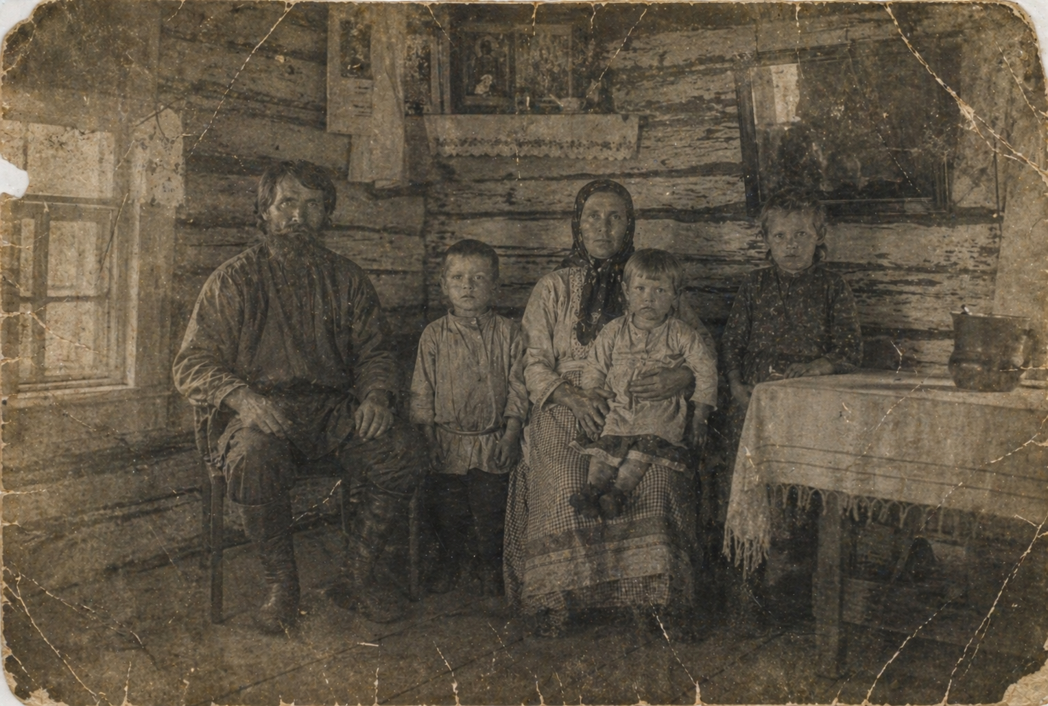 ARCHIVAL PHOTO STABILIZATION (NO COLORIZATION) Task: Clean and restore the photograph while preserving original tonal characteristics. HARD CONSTRAINTS: - IDENTITY LOCK: Do not alter faces or identity - NO GENERATION: Do NOT invent missing details RESTORATION: - Remove dust, stains, scratches, mold - Repair only physical damage - Preserve original grayscale or sepia exactly COLOR: - Do NOT add color - Do NOT tint the image TEXTURE: - Preserve film grain and micro-texture - Avoid smoothing OUTPUT: Clean, stable, authentic archival image CONSERVATIVE RECONSTRUCTION: - Reconstruct only clearly implied areas - Avoid facial detail generation - Prefer softness over sharpness - Do NOT guess identity ANTI-HALLUCINATION (ABSOLUTE): - Do NOT invent faces, people, or anatomy - Do NOT replace identity under any circumstance - If a region is missing or unreadable → leave it incomplete rather than guess - Do NOT extend the canvas or fill outside original photo edges REFERENCE CONTEXT (do not interpret, do not extend): - Subjects: 5 - Faces: partial - Face visibility: full - Damage level: high - Damage types: scratches, fading, tears, missing areas