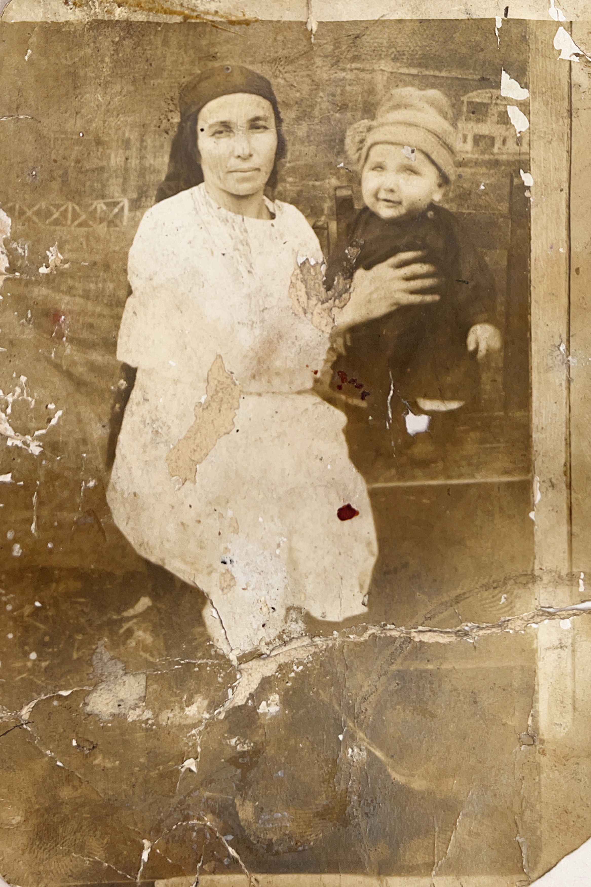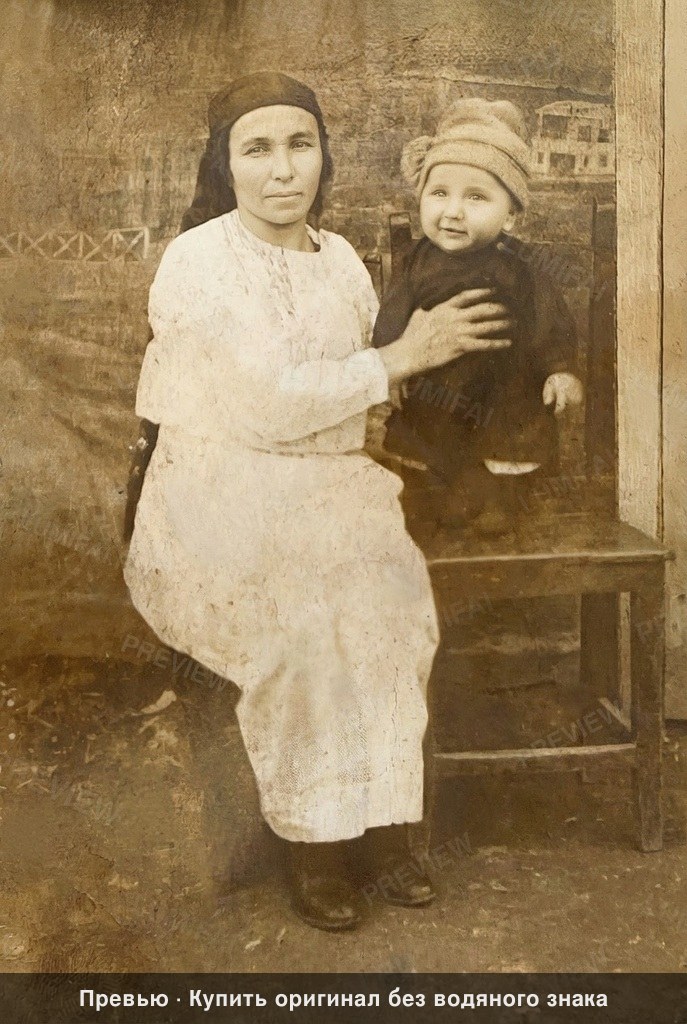 Restore and enhance this photograph to its maximum possible technical quality. The result must look like a sharp modern high-quality scan of a perfectly preserved original — crisp, noise-free, full of detail — while every person, object, and composition remains completely unchanged. Heavily sharpen and denoise the entire background, including the wooden chair, the textured wall, and the latticed fence structure in the distance; every architectural detail must be rendered with modern clarity. Remove the massive white paper losses, severe surface peeling, and deep horizontal creases spanning the bottom third and center of the image. Inpaint the missing sections of the woman’s white dress and the child’s dark coat by matching the surrounding fabric patterns. Sharpen every fiber of the child’s knit hat and the woman’s head covering, recovering the distinct weave and texture of the materials. Apply high-definition sharpening to the woman's hands and the edges of the furniture. Repair all white spots, chemical stains, and edge tears throughout the frame while maintaining the original sepia tonal character. Enhance face sharpness and remove noise like everywhere else. Remove any scratches. But DO NOT alter facial structure, expression, identity, or proportions. Preserve skin texture — pores, fine lines, natural imperfections. Do NOT smooth to plastic. The person must look identical — just sharper and cleaner. Apply IDENTICAL sharpness to background, clothing, AND faces. Background must be as sharp and detailed as any face. Blurry background = critical failure. Every area must be equally sharp. Background sharpness = face sharpness. No exceptions. ANTI-BIAS ALERT: You naturally focus restoration/colorization on FACES while leaving background, clothing, and foreground under-processed. This is the #1 quality failure. Consciously counteract this. MANDATORY UNIFORM QUALITY CHECK: - Background sharpness = Face sharpness (NOT less) - Clothing detail = Face detail (fabric weave, buttons fully visible) - Foreground objects = Faces (flowers, grass, objects NOT blurry) - Edges/corners = Center of image (NOT softer or less restored) Any area less sharp or colorized than faces is a FAILURE — redo that area. ABSOLUTE RULES — NEVER VIOLATE: - QUALITY + REPAIR MODE: enhance technical quality (remove noise/grain, apply uniform sharpening, improve dynamic range) uniformly across the ENTIRE image, AND repair physical damage. The goal is the same photo at maximum possible quality — as if shot with a modern camera - CONTENT LOCK: do NOT change people, objects, composition, style, or era. Same scene, same identity — just technically better. Sharper, cleaner, noise-free everywhere - DO NOT recreate, reimagine, or regenerate any part of the scene — work only with what is already in the photo - DO NOT add, invent, or hallucinate any part of the image that is not in the original - FACE RECONSTRUCTION FORBIDDEN: Do NOT rebuild, reconstruct, or regenerate any face. Ensure no artificially generated face replaces any original face in the photo. Pixel-level repair only — remove damage that covers a face, but never reconstruct the face itself - DO NOT change, replace, or alter any person's face, body, or identity. 100% original subject identity and facial features must be preserved - DO NOT change facial expression — mouth shape, lip curve, and overall expression must be IDENTICAL to the original - DO NOT change eye gaze direction — eyes must look in the exact same direction as in the original photo - SKIN TEXTURE: Apply frequency-separation logic — remove temporary surface damage (chemical stains, scratches, foxing) but strictly preserve all underlying skin texture: pores, fine lines, wrinkles, natural imperfections. Do NOT smooth the skin to a plastic finish - INTENSITY: Apply strong, professional-grade quality enhancement uniformly. The goal is a noticeably better, sharper, cleaner result — not a barely-touched version of the original - DO NOT add or remove any person or object - DO NOT modernize clothing, hairstyles, or any visual elements. Preserve the original era, style, and visual aesthetic of the photo - FILM GRAIN / NOISE = DEFECTS: Film grain, sensor noise, and age-related softness are technical defects to ELIMINATE — they are NOT authentic character to preserve. Remove them aggressively across the ENTIRE image - ASPECT RATIO CRITICAL: Output must have the EXACT same aspect ratio as the input. DO NOT crop, add borders, expand canvas, or shift composition. Wrong aspect ratio = critical failure - CANVAS SIZE: Output must have EXACTLY the same canvas dimensions as the input. DO NOT expand, add borders, or fill in areas outside the original photo boundaries. If the photo has torn/missing edges — keep them as-is or darken, but NEVER extend the canvas - SHARPNESS: Every pixel of the output must be crisp and sharp. NO softness, NO blur, NO smoothing anywhere. Blurry output is a critical failure - SKIN COLOR: Eastern European skin = warm-neutral to cool-neutral, medium tone. NEVER red or orange. NEVER ghostly pale or washed-out. NEVER airbrushed or plastic. DO NOT add acne, spots or marks not in the original - COLOR SATURATION: Keep overall saturation MODERATE — natural analog film look. NOT vivid digital. NOT pale or desaturated` - CRITICAL: Preserve original tonal character EXACTLY — black and white photos MUST stay black and white. Sepia photos MUST stay sepia. DO NOT add ANY color whatsoever. - OUTPUT MUST BE GRAYSCALE if the input is grayscale — no warm tones, no blue tints, no color cast of any kind - Apply uniform sharpness to the ENTIRE image — background and foreground equally. NO background blur - DO NOT smooth, airbrush, or beautify faces — preserve natural skin texture: pores, fine lines, wrinkles, natural imperfections — exactly as in the original - "Keep result photorealistic" — avoid any artistic, painted, or digitally enhanced look