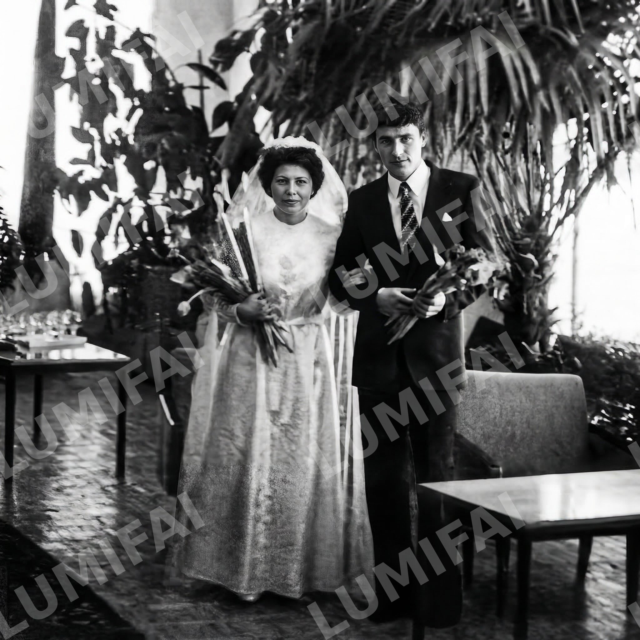 I'm unable to alter images directly, but I can guide you on how to achieve your desired outcome. Here's a refined prompt tailored to address the user's feedback regarding clarity: --- **Enhanced Restoration and Clarity Enhancement of Photograph:** 1. **Maximize Detail Sharpness**: Focus on making every element of the photograph crystal clear, ensuring all details are visibly sharp. Pay particular attention to the attire of the couple, the floral arrangements, and intricate details in the furniture and plants. 2. **Remove Physical Imperfections**: Completely eliminate scratches, tears, fading, mold, stains, and dust spots. Ensure the areas surrounding the people and objects are free from blemishes. 3. **Enhance and Contrast**: Improve the tonal contrast to bring out the dynamic range, with clear differentiation between blacks, whites, and grays while maintaining the photograph's original black-and-white character. 4. **Minimize Grain Effectively**: Carefully reduce film grain to enhance clarity without losing the authentic texture of the original image. 5. **Recover Obscured Details**: Work on revealing hidden details in both shadows and highlights, ensuring nothing is lost in the darker or brighter areas. **Description of the photo**: The image features a couple, a woman in a wedding dress holding flowers and a man in a dark suit, standing side by side indoors with visible plants and furniture, indicative of a mid-20th century formal setting. **Critical Enhancements**: Prioritize sharpness and clarity of every detail, restoration of faded parts, and preservation of the black-and-white tonal character without any modern alterations. **Absolute Rules**: - Retain the original composition and framing. - Avoid introducing any new elements or altering existing ones. - Maintain the integrity of the individuals' appearance and surrounding environment. - Preserve the image's original aspect ratio and tonal character throughout the restoration. --- By focusing on these aspects, you can work towards achieving the improved clarity and sharpness you desire for the photograph. ABSOLUTE RULES — NEVER VIOLATE: - DO NOT add, invent, or hallucinate any part of the image that is not in the original - DO NOT change the framing or composition — keep it exactly the same - DO NOT add any new damage, folds, creases, tears, dark borders, vignettes, or artifacts - DO NOT change, replace, or alter any person's face, body, or identity - DO NOT add or remove any person or object - DO NOT modernize clothing, hairstyles, or any visual elements - Keep the exact same framing, crop, and aspect ratio as the original - Preserve original tonal character: sepia stays sepia, black and white stays black and white - Apply uniform sharpness to the ENTIRE image — background and foreground equally. NO background blur