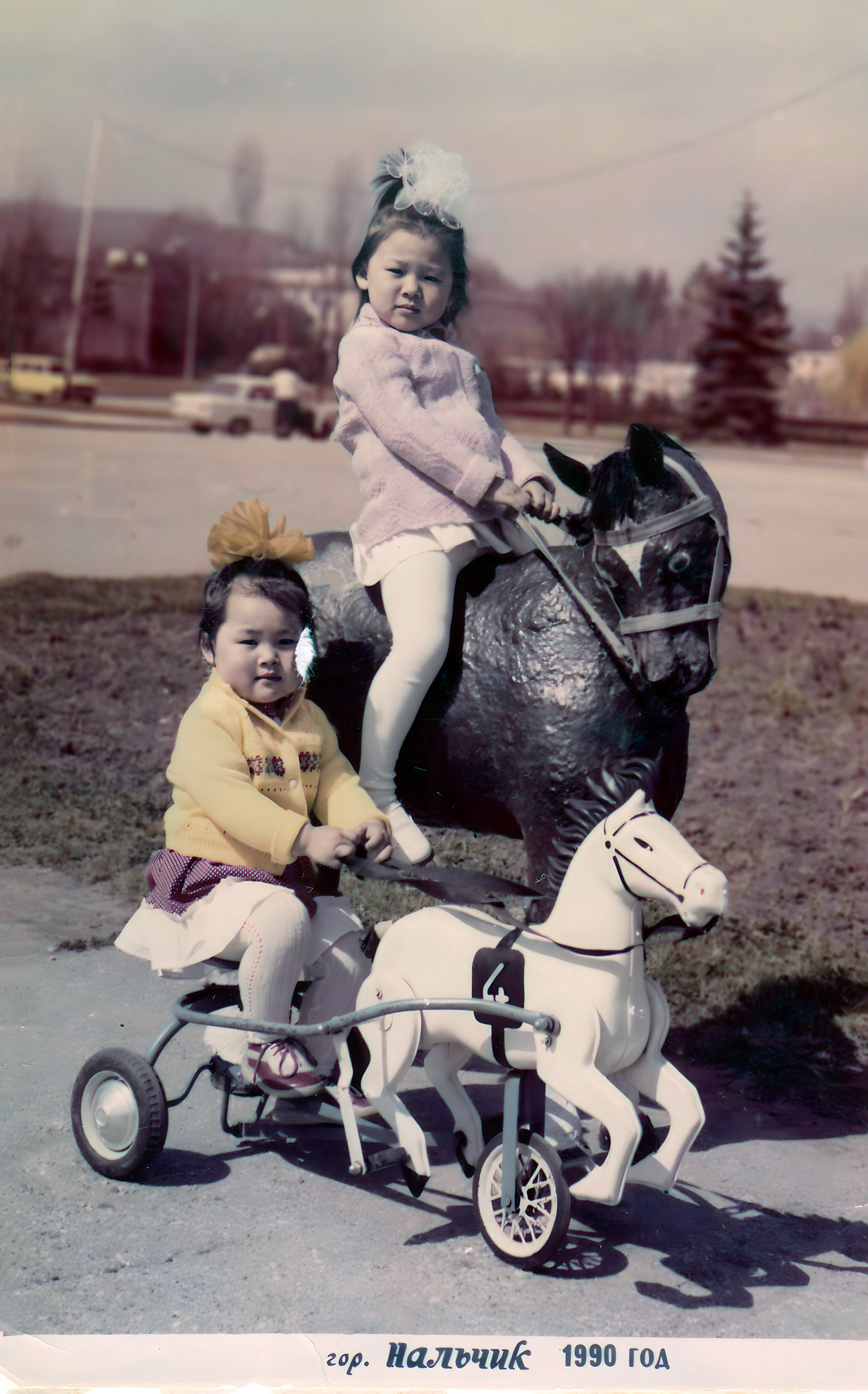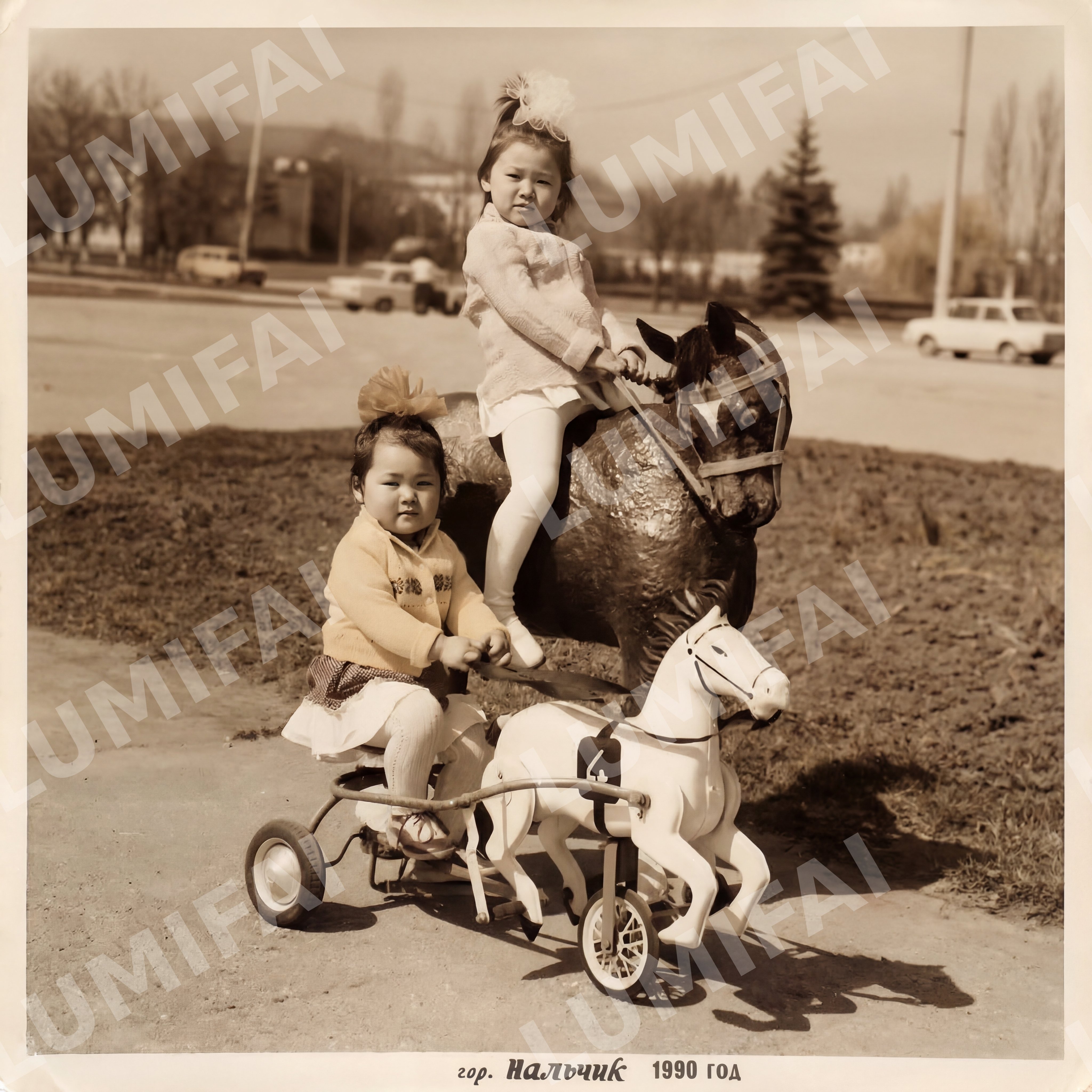 Промт для восстановления детского фото двух детей на качалках 90-х