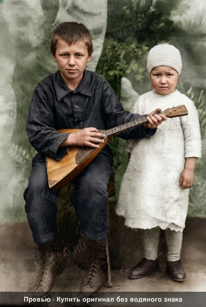 Colorize the EXISTING photograph using the SVEMA 32/64 color palette: a naturalistic Soviet-era film look with warm-neutral skin tones, slightly cool midtones, and moderate contrast. The colors must be grounded and realistic with moderate analog-film saturation, avoiding any neon or bleached effects. DAMAGE MAP: Heavily concentrated in the lower third, edges, and right side. Significant chemical fogging, fading, and white surface abrasions obscure the legs, feet, and the child's dress. BACKGROUND / ENVIRONMENT: Identify the setting as a 1950s Soviet outdoor or studio backdrop. Restore the heavy silver-nitrate fogging and chemical fading in the upper left and center-right areas. Colorize the background greenery and textured backdrop with muted olive and moss greens. Ensure the background is as sharp, detailed, and richly colorized as the subjects to counteract face-bias. FOREGROUND OBJECTS: Restore the balalaika, lifting it out of the haze; colorize it with natural wood grain in warm oak or birch tones. Restore the dusty ground and lower leg area, removing chemical stains and scratches to reveal the texture of the soil or floor. CLOTHING: Apply aggressive restoration to the boy's dark jacket and trousers, revealing the heavy cotton weave and buttons. Colorize the jacket in a muted navy or charcoal. For the child on the right, fully reconstruct the textures of the white wool dress, hat, and knit leggings which are currently washed out by light leaks. Restore the leather boots and shoes, showing the stitching and creases in dark brown or black leather. EDGES / CORNERS: Restore the severe fading and abrasion along the left edge and the bottom-right corner. Bring the same level of clarity and saturation to these periphery areas as the center. FACES: Restore the faces by removing fine scratches while strictly preserving existing skin texture—pores, lines, and natural eye details must remain visible. Skin must be warm-neutral and lifelike—STRICTLY FORBIDDEN are orange, pink, or ghostly white tones. Preserve the individual hair strands on both children. Natural analog-film palette—moderate saturation, warm-neutral tones. ALL areas processed with EQUAL quality. Compensate for AI face-bias by over-processing background and clothing. ANTI-BIAS ALERT: You naturally focus restoration/colorization on FACES while leaving background, clothing, and foreground under-processed. This is the #1 quality failure. Consciously counteract this. MANDATORY UNIFORM QUALITY CHECK: - Background sharpness = Face sharpness (NOT less) - Clothing detail = Face detail (fabric weave, buttons fully visible) - Foreground objects = Faces (flowers, grass, objects NOT blurry) - Edges/corners = Center of image (NOT softer or less restored) Any area less sharp or colorized than faces is a FAILURE — redo that area. ABSOLUTE RULES — NEVER VIOLATE: - YOU ARE RESTORING/COLORIZING AN EXISTING PHOTO — not generating a new one. Every pixel must correspond to the original image. - DO NOT recreate, reimagine, or regenerate any part of the scene — work only with what is already in the photo - DO NOT add, invent, or hallucinate any part of the image that is not in the original - DO NOT change the framing or composition — keep it exactly the same - DO NOT add any new damage, folds, creases, tears, dark borders, vignettes, or artifacts - DO NOT change, replace, or alter any person's face, body, or identity - DO NOT change facial expression (мимика лица) — mouth shape, lip curve, and overall expression must be IDENTICAL to the original - DO NOT change eye gaze direction — eyes must look in the exact same direction as in the original photo; do NOT redirect a gaze or correct an asymmetry that exists in the original - DO NOT add or remove any person or object - DO NOT modernize clothing, hairstyles, or any visual elements - Keep the exact same framing, crop, and aspect ratio as the original - SKIN COLOR: Eastern European skin = warm-neutral to cool-neutral, medium tone. NEVER red or orange. NEVER ghostly pale or washed-out. NEVER airbrushed or plastic. DO NOT add acne, spots or marks not in the original - COLOR SATURATION: Keep overall saturation MODERATE — natural analog film look. NOT vivid digital. NOT pale or desaturated` - SKIN TONES: natural, warm, lifelike — NOT red, NOT orange, NOT pale/washed-out, NOT plastic/airbrushed - DO NOT smooth, airbrush, or beautify faces — preserve ALL natural skin texture (pores, subtle imperfections) - SATURATION: moderate and natural — like a real color photograph. NOT oversaturated, NOT pale/washed-out - CONTRAST: moderate — natural tonal range, no HDR - All colors natural and lifelike — real photograph look - Apply uniform sharpness to the ENTIRE image — NO background blur