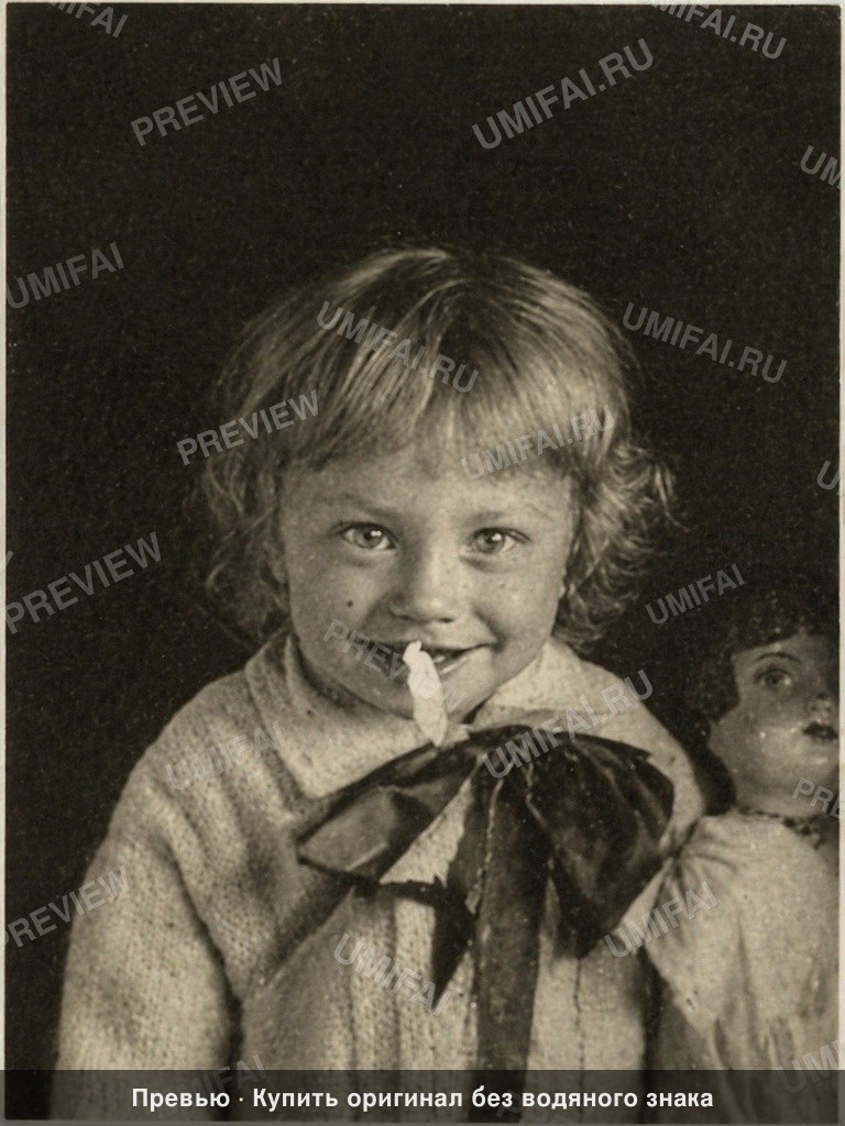 Archival photograph restoration: repair physical damage on this historical image while preserving all original visual content exactly — apply uniform technical enhancement to every region equally, treating all areas identically regardless of content. Sharpen, denoise, recover full detail in the dark, plain background. This area must be as crisp as any face, showing deep, clean, smooth tones free from grain, noise, or artifacts. Sharpen, denoise, and recover full detail in the light-colored object held near the child's mouth and in the partially visible doll or plush toy on the far right, ensuring their textures and forms are crisp and well-defined, recovering micro-details. Sharpen the fabric weave, folds, and all textures of the child's light-colored knit long-sleeved top, recovering micro-details like individual threads and knit patterns across its entire surface. Repair and sharpen all edges and corners of the photograph, removing any frays, tears, or unevenness, creating clean, sharp borders. Remove the large, jagged cracks and tears across the entire right side of the image, including those impacting the child's right side, hair, clothing, and the doll. Remove the significant CRITICAL RULES: - IDENTITY LOCK: Preserve the exact same subject, composition, and all visual elements from the source image. Any alteration to depicted subjects = critical failure. - Apply pixel-level damage repair only. Do NOT regenerate or reconstruct any subject or region from scratch. - DO NOT add or remove any element from the scene. DO NOT invent extra hands, limbs, or people not clearly visible in the original. - If the input shows a surface around the photo (bed sheet, sofa, table, wood, fabric, hands holding the photo), IGNORE that surface. Output ONLY the photograph content with its original edges — do NOT extend or merge the surrounding surface into the result. - DO NOT modernize clothing, hairstyles, or era details. - DO NOT change composition, framing, or aspect ratio. - DO NOT alter proportions, natural features, or expressions. DO NOT whiten teeth. DO NOT enlarge eyes. - Handwriting, stamps, captions on the image = HISTORICAL IDENTITY, preserve exactly. - TONAL LOCK: B&W stays grayscale. Sepia stays sepia. No color added. - TEXTURE: Preserve all surface detail — pores, lines, natural marks. DO NOT smooth.