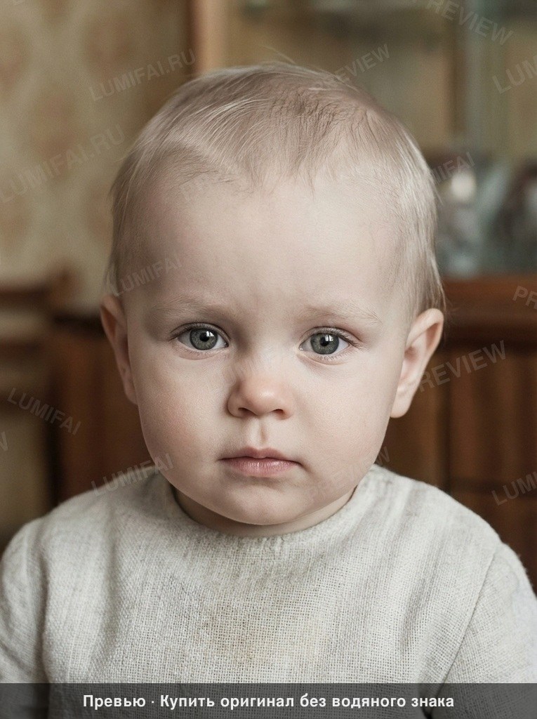 Restore, enhance, and colorize this photograph of a young Soviet-era child (approximately 1 to 2 years old) whose face is visible through heavy damage. 1. RESTORATION: Complete a total reconstruction of the image. The original is a circular-cut fragment with severe "alligatoring" (cracked emulsion), deep vertical and horizontal creases, missing paper sections at the edges, and chemical staining. Remove all cracks, scratches, and mold spots. Seamlessly reconstruct the missing portions of the child's head, the top of the hair, the ears, and the shoulders to create a standard rectangular portrait. 2. SKIN & FACE: The child has a pale Eastern European complexion with cool-neutral undertones. Strictly avoid any orange, red, or warm-golden tan. Ensure the skin is photorealistic with visible micro-texture, including fine pores and natural soft highlights; do not airbrush or smooth the skin into a plastic texture. Recover the fine detail in the eyes (irises and pupils) and the softness of the small nose and lips. 3. HAIR & CLOTHING: Sharpen individual strands of fine, light-colored hair. Reconstruct the clothing (a Soviet-era baby tunic or undershirt) with a visible fabric weave in muted tones like off-white or light grey. 4. ENVIRONMENT: Replace the white/blue background with a soft-focus, historically accurate Soviet-era interior or a neutral studio backdrop. Ensure uniform restoration and colorization quality from the center of the face to the very edges of the frame. 5. FINAL LOOK: The result must look like a high-quality 1980s Soviet ORWO or Kodak color film photograph. Apply a muted analog-film color palette—slightly desaturated, cool-neutral, realistic 1980s Soviet color photo look. ABSOLUTE RULES — NEVER VIOLATE: - DO NOT add, invent, or hallucinate any part of the image that is not in the original - DO NOT change the framing or composition — keep it exactly the same - DO NOT add any new damage, folds, creases, tears, dark borders, vignettes, or artifacts - DO NOT change, replace, or alter any person's face, body, or identity - DO NOT add or remove any person or object - DO NOT modernize clothing, hairstyles, or any visual elements - Keep the exact same framing, crop, and aspect ratio as the original - UNIFORM QUALITY: Process the ENTIRE image with equal attention — foreground flowers/textures, background elements, and edges must have the SAME sharpness and detail as faces. Do NOT leave any area blurry, simplified, or less detailed than another - SKIN COLOR: Eastern European skin = pale/medium, cool-neutral tone. NEVER red, orange, or overly warm. NEVER airbrushed or plastic - COLOR SATURATION: Keep overall saturation LOW TO MODERATE — muted analog film look, NOT vivid digital colors` - SKIN TONES: natural, warm, lifelike — NOT red, NOT orange, NOT pale/washed-out, NOT plastic/airbrushed - DO NOT smooth, airbrush, or beautify faces — preserve ALL natural skin texture (pores, subtle imperfections) - SATURATION: moderate and natural — like a real color photograph. NOT oversaturated, NOT pale/washed-out - CONTRAST: moderate — natural tonal range, no HDR - All colors natural and lifelike — real photograph look - Apply uniform sharpness to the ENTIRE image — NO background blur