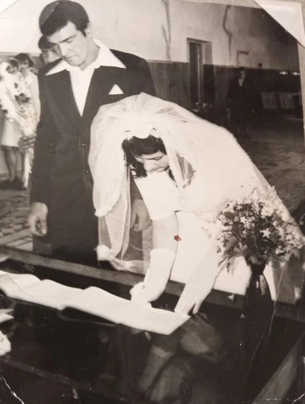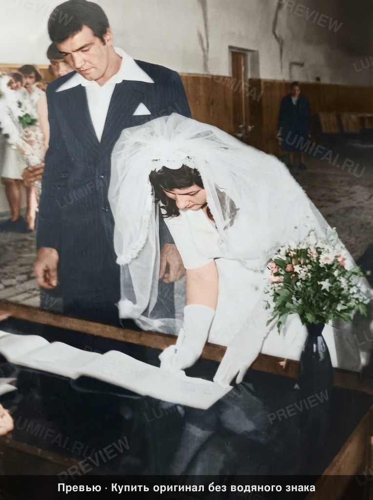 Perform meticulous non-destructive restoration and colorization of this aged photograph. Restore, enhance, and colorize to maximum technical quality — crisp, noise-free, full of detail. Add historically accurate colors. Output MUST have the EXACT same aspect ratio as the input. Colorize the EXISTING photograph using ORWO Color NC / SVEMA 130 color palette: this 1970s-1980s Eastern European film stock features moderate saturation with slightly cool midtones and shadows, providing a natural warm-neutral skin tone bias that feels grounded and muted rather than vivid. DAMAGE MAP: Prioritize the removal of heavy creases and chemical stains in the top right corner, the prominent vertical fold and surface crack running through the bottom right across the table and flowers, and the white corner peeling in the top left. Remove all dust, micro-scratches, and silver mirroring throughout the frame. BACKGROUND AND ENVIRONMENT: This is a 1970s Soviet-era indoor setting. Restore the wooden wall paneling in the background, recovering accurate wood grain textures and coloring it in a muted, warm oak or walnut tone. Repair the wall above the paneling, removing dark water stains and cracks. Ensure the distant figures on the left and right are sharpened and colorized with the same intensity as the foreground. The stone or tiled flooring must be crisp, showing individual grout lines and neutral grey-brown tones. FOREGROUND OBJECTS: Aggressively restore the foreground table/surface; remove the heavy scratches and surface noise. Colorize the bouquet with realistic greens and soft floral whites/pinks, ensuring every leaf and petal is sharp. Restore the document registry book, showing paper texture and ink contrast without over-exposure. CLOTHING: Restore the groom’s dark wool suit, bringing out the fine fabric weave and pinstripe details; colorize it in a deep charcoal or navy blue with neutral highlights. Restore the bride's white dress and translucent veil, removing all yellowing and fading. The veil must retain its delicate mesh transparency and lace-edge detail. Restore the bride's gloves and the groom's white shirt with high dynamic range to avoid "blown out" whites. EDGES AND CORNERS: Apply identical restoration quality to all four corners. Repair the physical peeling and white tape marks on the top corners to match the surrounding wall and ceiling textures perfectly. FACES AND SKIN: Restore facial features with zero airbrushing. Preserve the groom's bone structure, hair texture, and the bride's focused expression. Apply a warm-neutral Eastern European skin tone—avoiding all orange, pink, or ghostly white tints. Skin must look alive with natural micro-texture, pores, and subtle depth. Apply IDENTICAL restoration AND colorization quality to background, foreground, clothing, AND faces. Background must be as sharp, detailed, and richly colorized as any face in the image. WARNING: You have a natural bias toward faces. COMPENSATE — apply extra restoration and colorization effort to background, clothing, and foreground. Natural analog-film palette — moderate saturation, warm-neutral tones. ALL areas processed with EQUAL quality. Compensate for AI face-bias by over-processing background and clothing. ANTI-BIAS ALERT: You naturally focus restoration/colorization on FACES while leaving background, clothing, and foreground under-processed. This is the #1 quality failure. Consciously counteract this. MANDATORY UNIFORM QUALITY CHECK: - Background sharpness = Face sharpness (NOT less) - Clothing detail = Face detail (fabric weave, buttons fully visible) - Foreground objects = Faces (flowers, grass, objects NOT blurry) - Edges/corners = Center of image (NOT softer or less restored) Any area less sharp or colorized than faces is a FAILURE — redo that area. ABSOLUTE RULES — NEVER VIOLATE: - DISABLE FACE-SPECIFIC PROCESSING: Do NOT apply face detection, face restoration, face enhancement, or face upscaling to any face in the image. Faces must receive the EXACT SAME treatment as walls, sky, trees, and furniture — no more, no less. Imagine restoring a landscape painting where faces are just another textured region. - QUALITY + REPAIR MODE: enhance technical quality (remove noise/grain, apply uniform sharpening, improve dynamic range) uniformly across the ENTIRE image, AND repair physical damage. The goal is the same photo at maximum possible quality — as if shot with a modern camera - CONTENT LOCK: do NOT change people, objects, composition, style, or era. Same scene, same identity — just technically better. Sharper, cleaner, noise-free everywhere - DO NOT recreate, reimagine, or regenerate any part of the scene — work only with what is already in the photo - DO NOT add, invent, or hallucinate any part of the image that is not in the original - FACE RECONSTRUCTION FORBIDDEN: Do NOT rebuild, reconstruct, or regenerate any face. Ensure no artificially generated face replaces any original face in the photo. Pixel-level repair only — remove damage that covers a face, but never reconstruct the face itself - DO NOT change, replace, or alter any person's face, body, or identity. 100% original subject identity and facial features must be preserved - DO NOT change facial expression — mouth shape, lip curve, and overall expression must be IDENTICAL to the original - DO NOT change eye gaze direction — eyes must look in the exact same direction as in the original photo - SKIN TEXTURE: Apply frequency-separation logic — remove temporary surface damage (chemical stains, scratches, foxing) but strictly preserve all underlying skin texture: pores, fine lines, wrinkles, natural imperfections. Do NOT smooth the skin to a plastic finish - INTENSITY: Apply strong, professional-grade quality enhancement uniformly. The goal is a noticeably better, sharper, cleaner result — not a barely-touched version of the original - DO NOT add or remove any person or object - DO NOT modernize clothing, hairstyles, or any visual