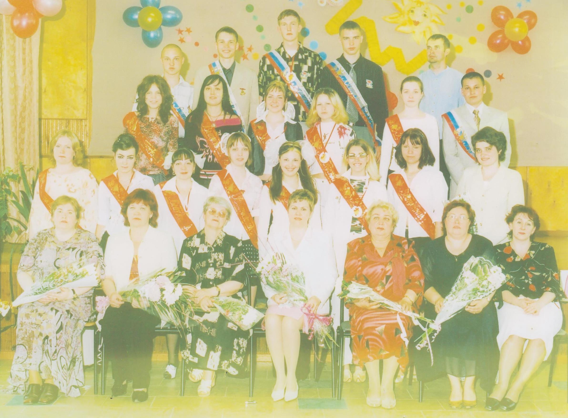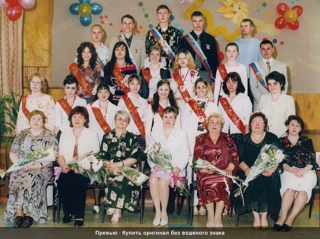 Professionally restore, enhance, and colorize this 1990s-era graduation group photo from the CIS/Eastern European region. There are approximately 25 people arranged in four rows (adolescent students in the back three rows, adult teachers seated in the front). 1. RESTORATION: Remove the heavy yellow-green chemical cast and severe light fogging/fading affecting the entire image. Repair vertical scratches, light leaks, and emulsion damage on the edges and bottom. Sharpen the facial features of every individual, particularly those in the back row who are currently blurred. 2. SKIN TONE & TEXTURE: Apply a strictly realistic Eastern European complexion to all subjects: pale to fair skin with cool-neutral undertones. STRONGLY AVOID orange, red, or warm-golden tones. DO NOT airbrush; preserve and enhance realistic skin texture, including visible pores, fine lines, and natural variations. The skin must look sharp and detailed, not plastic. 3. CLOTHING & UNIFORMS: Restore the specific details of the graduation sashes (typically red or blue with gold lettering). The students are wearing a mix of white blouses, dark jackets, and patterns typical of the 1990s post-Soviet era. The seated teachers wear floral and patterned dresses. Colorize using a muted, historically accurate palette (navy, maroon, forest green, charcoal, and beige). 4. ENVIRONMENT: Restore the background stage decorations, including the balloons (red, blue, yellow) and the wall art. Sharpen the flower bouquets held by the seated women, ensuring individual petals and leaves are distinct. Ensure uniform restoration quality across the entire frame, from the faces in the center to the floor and corners. 5. FINAL AESTHETIC: The final result must look like a high-quality scan of a 1990s analog photograph. Use a muted analog-film color palette — slightly desaturated, cool-neutral, realistic late-Soviet/CIS color photo look. ABSOLUTE RULES — NEVER VIOLATE: - DO NOT add, invent, or hallucinate any part of the image that is not in the original - DO NOT change the framing or composition — keep it exactly the same - DO NOT add any new damage, folds, creases, tears, dark borders, vignettes, or artifacts - DO NOT change, replace, or alter any person's face, body, or identity - DO NOT add or remove any person or object - DO NOT modernize clothing, hairstyles, or any visual elements - Keep the exact same framing, crop, and aspect ratio as the original - UNIFORM QUALITY: Process the ENTIRE image with equal attention — foreground flowers/textures, background elements, and edges must have the SAME sharpness and detail as faces. Do NOT leave any area blurry, simplified, or less detailed than another - SKIN COLOR: Eastern European skin = pale/medium, cool-neutral tone. NEVER red, orange, or overly warm. NEVER airbrushed or plastic - COLOR SATURATION: Keep overall saturation LOW TO MODERATE — muted analog film look, NOT vivid digital colors` - SKIN TONES: natural, warm, lifelike — NOT red, NOT orange, NOT pale/washed-out, NOT plastic/airbrushed - DO NOT smooth, airbrush, or beautify faces — preserve ALL natural skin texture (pores, subtle imperfections) - SATURATION: moderate and natural — like a real color photograph. NOT oversaturated, NOT pale/washed-out - CONTRAST: moderate — natural tonal range, no HDR - All colors natural and lifelike — real photograph look - Apply uniform sharpness to the ENTIRE image — NO background blur