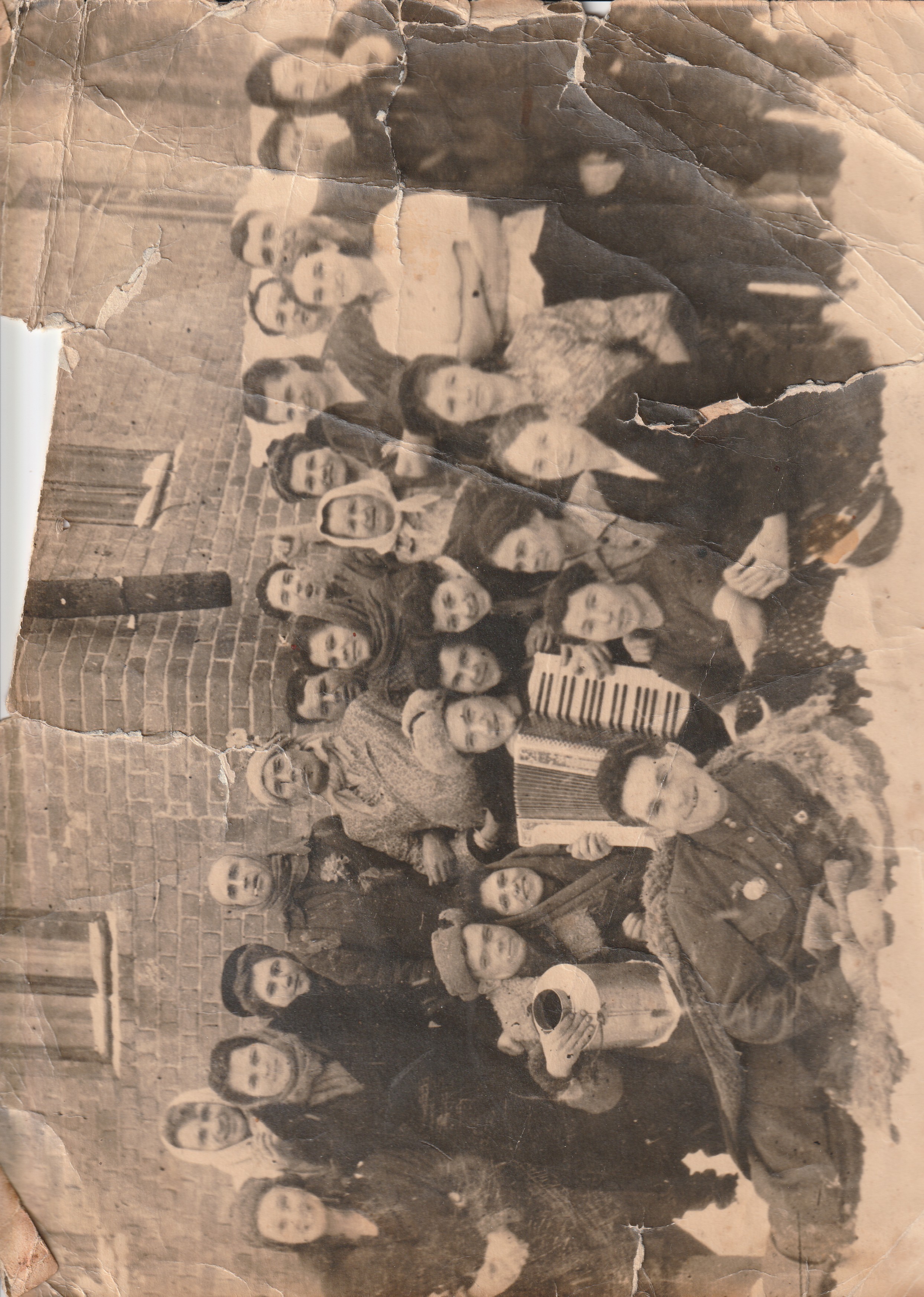 Restore the vintage photograph by correcting all physical damage such as creases and tears, especially around the edges and center. Add realistic colors to transform it into a modern color photograph. Include the following details: - There are 26 people in the photograph. Ensure all are maintained in their exact positions. - The photo is set in a winter scene outside a brick building, likely from the mid-20th century in Eastern Europe. - On the left, a cluster of people in winter coats and headscarves stands, with one man lying at the front in a military coat. - Center group includes a man holding an accordion, surrounded by others in winter attire, some in caps and scarves, and one person holding a metal container. - Right side features people standing close together, some with printed tops and one wearing a white shirt, arms crossed. - Maintain an accurate color palette with earthy tones for the brick wall and colorful yet period-accurate clothing for all individuals.