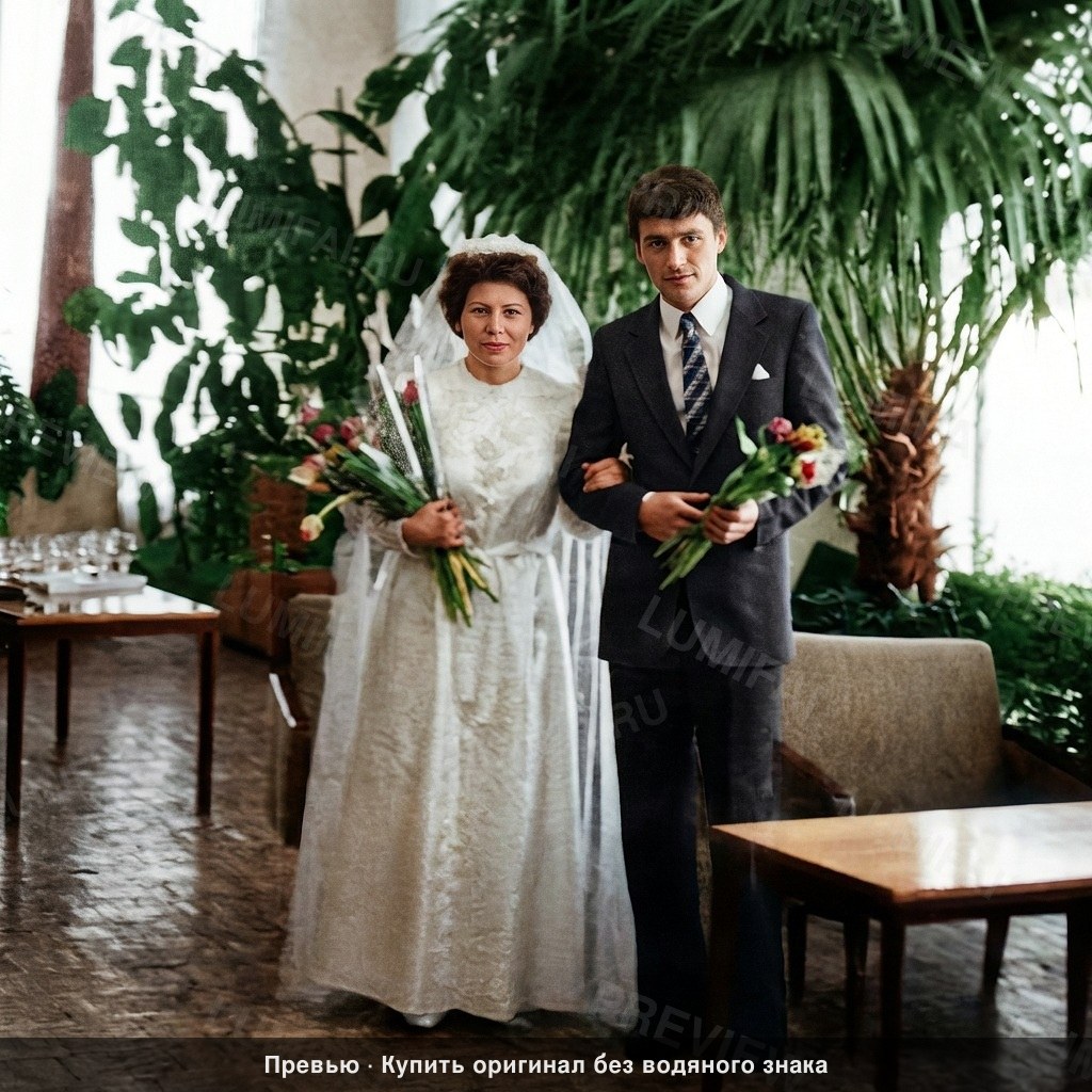 Perform meticulous non-destructive restoration and colorization of this aged photograph. Preserve its authentic archival character. Only repair visibly damaged pixels — leave intact areas exactly as-is. Add subtle, historically accurate colors that respect the original era. Colorize the EXISTING photograph using the 1980s ORWO Color NC / SVEMA 130 color palette: featuring moderate saturation, slightly cool midtones, and natural warm-neutral skin tones while avoiding a bleached or desaturated look. Damage is concentrated in the top-left background light blooms and throughout the shadows in the foreground and edges. Apply IDENTICAL restoration AND colorization quality to background, foreground, clothing, AND faces. Background must be as sharp, detailed, and richly colorized as any face in the image; restore and colorize the tropical indoor plants (palms, large-leaf monstera) with deep, natural greens. In the foreground, restore the tiled floor texture, the glassware on the left table, and the fabric of the seating with full micro-detail, ensuring no blurriness. Clothing—restore and colorize with extreme care: the bride's white wedding gown must show intricate fabric weave, embroidery, and veil textures without blowing out highlights; the groom's dark suit must retain visible lapel stitching, button detail, and the specific pattern of his necktie. Edges and corners must be restored with the same precision as the center to remove vignette fading and chemical spots. Faces: Preserve existing skin texture, pores, and natural facial lines without any smoothing or waxy effects. For these Eastern European subjects, use a warm-neutral skin tone—avoiding orange, red, or ghostly white—ensuring eyes retain natural iris detail. WARNING: You have a natural bias toward faces. COMPENSATE—apply extra restoration and colorization effort to the complex background foliage, the tables, and the detailed clothing fabrics. Natural analog-film palette—moderate saturation, warm-neutral tones. ALL areas processed with EQUAL quality. Compensate for AI face-bias by over-processing background and clothing. ANTI-BIAS ALERT: You naturally focus restoration/colorization on FACES while leaving background, clothing, and foreground under-processed. This is the #1 quality failure. Consciously counteract this. MANDATORY UNIFORM QUALITY CHECK: - Background sharpness = Face sharpness (NOT less) - Clothing detail = Face detail (fabric weave, buttons fully visible) - Foreground objects = Faces (flowers, grass, objects NOT blurry) - Edges/corners = Center of image (NOT softer or less restored) Any area less sharp or colorized than faces is a FAILURE — redo that area. ABSOLUTE RULES — NEVER VIOLATE: - YOU ARE PERFORMING NON-DESTRUCTIVE RESTORATION — only fix pixels that are visibly damaged. Leave all intact areas exactly as-is. This is pixel-level repair, NOT image generation. - DO NOT recreate, reimagine, or regenerate any part of the scene — work only with what is already in the photo - DO NOT add, invent, or hallucinate any part of the image that is not in the original - FACE RECONSTRUCTION FORBIDDEN: Do NOT rebuild, reconstruct, or regenerate any face. Ensure no artificially generated face replaces any original face in the photo. Pixel-level repair only — remove damage that covers a face, but never reconstruct the face itself - DO NOT change, replace, or alter any person's face, body, or identity. 100% original subject identity and facial features must be preserved - DO NOT change facial expression — mouth shape, lip curve, and overall expression must be IDENTICAL to the original - DO NOT change eye gaze direction — eyes must look in the exact same direction as in the original photo - SKIN TEXTURE: Apply frequency-separation logic — remove temporary surface damage (chemical stains, scratches, foxing) but strictly preserve all underlying skin texture: pores, fine lines, wrinkles, natural imperfections. Do NOT smooth the skin to a plastic finish - INTENSITY: Apply subtle, targeted corrections. Do NOT apply maximum processing to any area — natural and authentic result is the goal, not a "perfect" artificial image - DO NOT add or remove any person or object - DO NOT modernize clothing, hairstyles, or any visual elements. Preserve the authentic archival character of the photo - Keep the exact same framing, crop, and aspect ratio as the original - CANVAS SIZE: Output must have EXACTLY the same canvas dimensions as the input. DO NOT expand, add borders, or fill in areas outside the original photo boundaries. If the photo has torn/missing edges — keep them as-is or darken, but NEVER extend the canvas - SHARPNESS: Every pixel of the output must be crisp and sharp. NO softness, NO blur, NO smoothing anywhere. Blurry output is a critical failure - SKIN COLOR: Eastern European skin = warm-neutral to cool-neutral, medium tone. NEVER red or orange. NEVER ghostly pale or washed-out. NEVER airbrushed or plastic. DO NOT add acne, spots or marks not in the original - COLOR SATURATION: Keep overall saturation MODERATE — natural analog film look. NOT vivid digital. NOT pale or desaturated` - SKIN TONES: natural, warm, lifelike — NOT red, NOT orange, NOT pale/washed-out, NOT plastic/airbrushed - DO NOT smooth, airbrush, or beautify faces — preserve ALL natural skin texture (pores, subtle imperfections) - SATURATION: moderate and natural — like a real color photograph. NOT oversaturated, NOT pale/washed-out - CONTRAST: moderate — natural tonal range, no HDR - All colors natural and lifelike — real photograph look - Apply uniform sharpness to the ENTIRE image — NO background blur