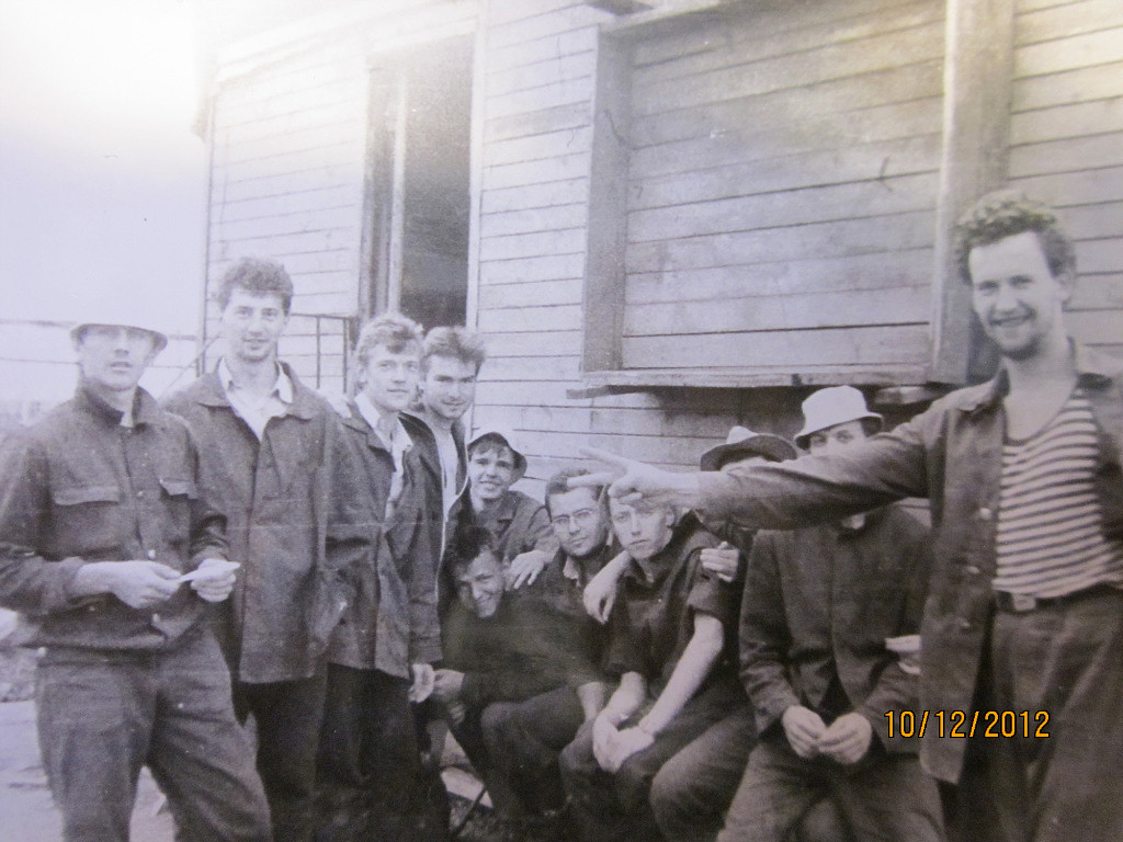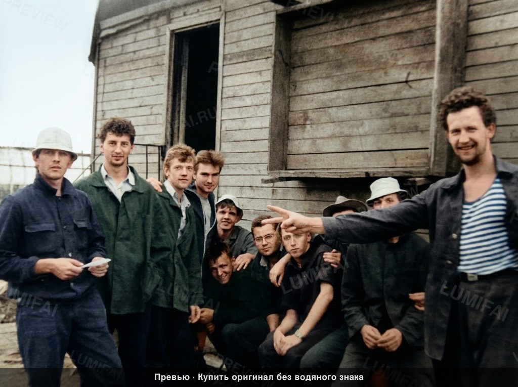Colorize the EXISTING photograph using SVEMA 130 color palette: featuring moderate saturation, natural warm-neutral skin tones, and slightly cool midtones typical of 1980s Soviet analog film. Shadows should remain deep and grounded, while highlights exhibit a gentle, natural warmth without bleaching details. Damage Map and Restoration: Remove the heavy white light flare and overexposure from the upper left corner and top edge. Eliminate all surface scratches, white dust spots, and the digital orange date stamp in the bottom right. Restore the faded, low-contrast areas on the left side of the frame to match the density of the right side. Background and Environment: Apply total restoration and colorization to the wooden building siding. Sharpen the grain, gaps, and texture of the horizontal wooden planks. Colorize the wood in natural weathered timber tones (muted greys and browns). Ensure the dark doorway and the wooden hatch/window structure are rendered with high contrast and sharp edges, matching the level of detail found on the subjects. Clothing: Restore and colorize with extreme focus on fabric texture. For the man on the far right, sharpen the specific horizontal lines of the telnyashka striped undershirt and the heavy canvas weave of his dark jacket. Colorize the various work jackets in muted Soviet-era tones: deep navy, forest green, and charcoal grey. Every button, pocket seam, and fold in the heavy trousers must be as sharp and saturated as the facial features. Edges and Foreground: Restore the blurry foreground dirt and debris, adding realistic texture and muted earthy colors. Ensure the very edges of the frame—left, right, and bottom—are fully sharp, removing the peripheral haze and chromatic aberration. Faces and Skin: Restore facial features by recovering micro-details in the eyes, hair strands (especially the curly hair of the man on the right), and skin texture. Apply a natural late-Soviet warm-neutral skin tone—avoiding any orange, pink, or ghostly white tints. Skin must look alive and textured, not smooth or plastic. WARNING: You have a natural bias toward faces. COMPENSATE by applying extra restoration and colorization effort to the background structure and clothing textures. Apply IDENTICAL quality to the entire frame. Natural analog-film palette—moderate saturation, warm-neutral tones. ALL areas processed with EQUAL quality. ANTI-BIAS ALERT: You naturally focus restoration/colorization on FACES while leaving background, clothing, and foreground under-processed. This is the #1 quality failure. Consciously counteract this. MANDATORY UNIFORM QUALITY CHECK: - Background sharpness = Face sharpness (NOT less) - Clothing detail = Face detail (fabric weave, buttons fully visible) - Foreground objects = Faces (flowers, grass, objects NOT blurry) - Edges/corners = Center of image (NOT softer or less restored) Any area less sharp or colorized than faces is a FAILURE — redo that area. ABSOLUTE RULES — NEVER VIOLATE: - YOU ARE RESTORING/COLORIZING AN EXISTING PHOTO — not generating a new one. Every pixel must correspond to the original image. - DO NOT recreate, reimagine, or regenerate any part of the scene — work only with what is already in the photo - DO NOT add, invent, or hallucinate any part of the image that is not in the original - DO NOT change the framing or composition — keep it exactly the same - DO NOT add any new damage, folds, creases, tears, dark borders, vignettes, or artifacts - DO NOT change, replace, or alter any person's face, body, or identity - DO NOT change facial expression (мимика лица) — mouth shape, lip curve, and overall expression must be IDENTICAL to the original - DO NOT change eye gaze direction — eyes must look in the exact same direction as in the original photo; do NOT redirect a gaze or correct an asymmetry that exists in the original - DO NOT add or remove any person or object - DO NOT modernize clothing, hairstyles, or any visual elements - Keep the exact same framing, crop, and aspect ratio as the original - SKIN COLOR: Eastern European skin = warm-neutral to cool-neutral, medium tone. NEVER red or orange. NEVER ghostly pale or washed-out. NEVER airbrushed or plastic. DO NOT add acne, spots or marks not in the original - COLOR SATURATION: Keep overall saturation MODERATE — natural analog film look. NOT vivid digital. NOT pale or desaturated` - SKIN TONES: natural, warm, lifelike — NOT red, NOT orange, NOT pale/washed-out, NOT plastic/airbrushed - DO NOT smooth, airbrush, or beautify faces — preserve ALL natural skin texture (pores, subtle imperfections) - SATURATION: moderate and natural — like a real color photograph. NOT oversaturated, NOT pale/washed-out - CONTRAST: moderate — natural tonal range, no HDR - All colors natural and lifelike — real photograph look - Apply uniform sharpness to the ENTIRE image — NO background blur