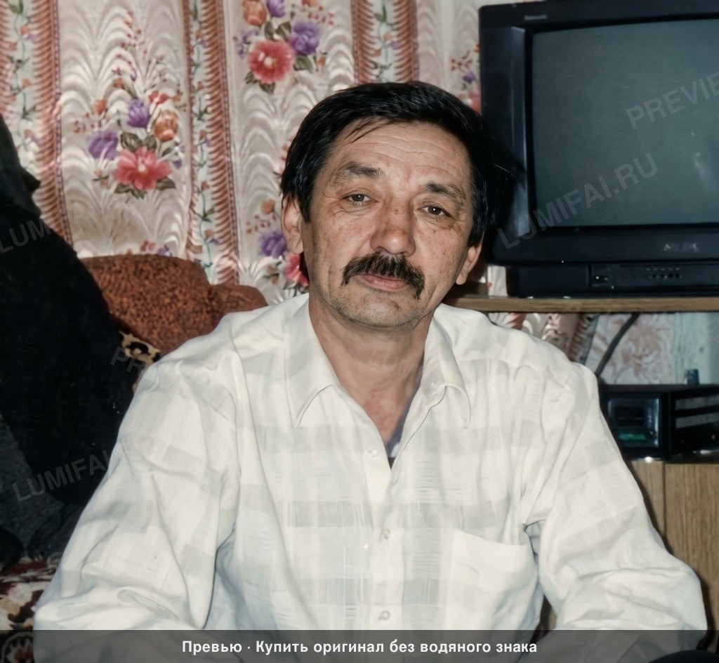 Colorize the EXISTING photograph using SVEMA 130 color palette: featuring moderate saturation, slightly cool midtones, and natural warm-neutral skin tones typical of 1980s Soviet film. Highlights should remain clean while shadows maintain a soft, muted depth characteristic of analog chemical processing. 1. DAMAGE MAP: Focus heavy restoration on the high-grain areas throughout the background and the white shirt. Remove the digital noise and color artifacts visible in the dark areas on the left and the television screen on the right. Fix the blurring/fading along the bottom edge and corners. 2. BACKGROUND/ENVIRONMENT: Apply IDENTICAL restoration and colorization quality to the background as to the central figure. Identify the setting as a 1980s-1990s Soviet interior. Restore the floral pattern curtains with distinct vertical stripes and pink/red flower motifs; the colors must be grounded and moderate, not neon. Restore the cathode-ray tube (CRT) television on the right, ensuring the black plastic housing has realistic secular highlights and the screen a deep, dark glass texture. Restore the wooden furniture shelf and VCR/stereo unit below the TV with sharp, wood-grain detail and realistic metallic/plastic textures. 3. FOREGROUND AND EDGES: Restore the patterned sofa/armrest on the left, bringing out the texture of the fabric weave. Ensure the edges and corners of the image are as sharp and color-corrected as the center. 4. CLOTHING: Focus intensely on the white button-down shirt. Restore the faint checkered or striped texture of the fabric; do not let it remain a flat white mass. Sharpen the collar edges, the chest pocket, and the wrist cuffs. The color should be a natural, slightly off-white light cream, showing realistic shadows in the folds. 5. FACES AND FEATURES: Restore the man’s face by preserving all existing skin texture, including the lines around the eyes and forehead. Strictly follow the warm-neutral Eastern European skin tone—absolutely no orange, terracotta, or ghostly white tones. Ensure the skin looks alive and textured, not waxy or airbrushed. Enhance the mustache to show individual hair detail. Restore the eyes with natural iris depth and sharp pupils without artificial brightening. WARNING: You have a natural bias toward faces. COMPENSATE—apply extra restoration and colorization effort to the background, curtains, tech equipment, and clothing. Natural analog-film palette—moderate saturation, warm-neutral tones. ALL areas processed with EQUAL quality. ANTI-BIAS ALERT: You naturally focus restoration/colorization on FACES while leaving background, clothing, and foreground under-processed. This is the #1 quality failure. Consciously counteract this. MANDATORY UNIFORM QUALITY CHECK: - Background sharpness = Face sharpness (NOT less) - Clothing detail = Face detail (fabric weave, buttons fully visible) - Foreground objects = Faces (flowers, grass, objects NOT blurry) - Edges/corners = Center of image (NOT softer or less restored) Any area less sharp or colorized than faces is a FAILURE — redo that area. ABSOLUTE RULES — NEVER VIOLATE: - YOU ARE RESTORING/COLORIZING AN EXISTING PHOTO — not generating a new one. Every pixel must correspond to the original image. - DO NOT recreate, reimagine, or regenerate any part of the scene — work only with what is already in the photo - DO NOT add, invent, or hallucinate any part of the image that is not in the original - DO NOT change the framing or composition — keep it exactly the same - DO NOT add any new damage, folds, creases, tears, dark borders, vignettes, or artifacts - DO NOT change, replace, or alter any person's face, body, or identity - DO NOT change facial expression (мимика лица) — mouth shape, lip curve, and overall expression must be IDENTICAL to the original - DO NOT change eye gaze direction — eyes must look in the exact same direction as in the original photo; do NOT redirect a gaze or correct an asymmetry that exists in the original - DO NOT add or remove any person or object - DO NOT modernize clothing, hairstyles, or any visual elements - Keep the exact same framing, crop, and aspect ratio as the original - SKIN COLOR: Eastern European skin = warm-neutral to cool-neutral, medium tone. NEVER red or orange. NEVER ghostly pale or washed-out. NEVER airbrushed or plastic. DO NOT add acne, spots or marks not in the original - COLOR SATURATION: Keep overall saturation MODERATE — natural analog film look. NOT vivid digital. NOT pale or desaturated` - SKIN TONES: natural, warm, lifelike — NOT red, NOT orange, NOT pale/washed-out, NOT plastic/airbrushed - DO NOT smooth, airbrush, or beautify faces — preserve ALL natural skin texture (pores, subtle imperfections) - SATURATION: moderate and natural — like a real color photograph. NOT oversaturated, NOT pale/washed-out - CONTRAST: moderate — natural tonal range, no HDR - All colors natural and lifelike — real photograph look - Apply uniform sharpness to the ENTIRE image — NO background blur