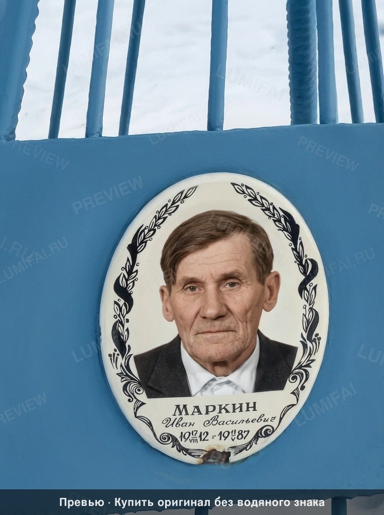 Colorize the EXISTING photograph using the SVEMA 130 color palette: featuring moderate saturation, slightly cool midtones, and natural warm-neutral skin tones typical of late 1980s Soviet film. The shadows should remain deep and grounded with a subtle cool bias, while highlights stay clean and ivory-white. **DAMAGE MAP & RESTORATION:** - **Background/Outer Frame:** Remove all heavy cracking, peeling, and chipping from the blue metal surface. Eliminate the rust stains and oxidation bleeding from the screws and the edges of the porcelain medallion. Smooth the uneven texture of the blue paint while maintaining its matte metallic feel. - **Oval Medallion Surface:** Remove the white chemical spotting and pitting located on the man’s hair (left side) and shoulder (left/bottom). Repair the yellow-orange vertical stain on the lower left of his jacket. Fix the micro-scratches and fading within the laurel wreath border. - **Edges:** Restore the rusted, corroded gaps at the bottom of the oval frame where it meets the blue metal. **EQUALLY WEIGHTED COLORIZATION & ENHANCEMENT:** 1. **Background Environment:** Colorize the blue metal frame with a weathered but solid "Soviet Blue" industrial paint tone. The fence rods at the top must be sharp and distinct against the white, snowy background behind them. Restore the snow to a crisp, natural white with subtle blue-cold shadows. 2. **Medallion Border & Text:** The porcelain base should be a natural off-white/ivory. Colorize the laurel wreaths in a deep, sharp black ink. The Cyrillic text "МАРКИН Иван Васильевич" and the dates must be ultra-sharp and legible, without any blurring or bleeding into the ivory background. 3. **Clothing:** Colorize the suit jacket in a deep charcoal or navy wool texture. Enhance the fabric weave to show micro-detail. The dress shirt and bowtie area must be a clean, distinct white, showing the folds and shadows of the fabric without over-exposure. 4. **Faces & Skin (LAST):** Apply a warm-neutral, medium Eastern European skin tone. It must NOT be orange, terracotta, or ghostly white. Preserve the natural aged skin texture—gentle wrinkles and facial lines—without airbrushing or smoothing. Maintain the natural iris detail in the eyes and the individual hair strands on the head. **UNIFORM PROCESSING:** Apply IDENTICAL restoration and colorization quality to the background metal, the porcelain texture, the clothing, and the face. The background and metal textures must be as sharp and detailed as the facial features. WARNING: You have a natural bias toward faces. COMPENSATE—apply extra restoration and colorization effort to the blue metal frame, the typography, and the laurel motifs. Natural analog-film palette—moderate saturation, warm-neutral tones. ALL areas processed with EQUAL quality. Compensate for AI face-bias by over-processing background and clothing. ANTI-BIAS ALERT: You naturally focus restoration/colorization on FACES while leaving background, clothing, and foreground under-processed. This is the #1 quality failure. Consciously counteract this. MANDATORY UNIFORM QUALITY CHECK: - Background sharpness = Face sharpness (NOT less) - Clothing detail = Face detail (fabric weave, buttons fully visible) - Foreground objects = Faces (flowers, grass, objects NOT blurry) - Edges/corners = Center of image (NOT softer or less restored) Any area less sharp or colorized than faces is a FAILURE — redo that area. ABSOLUTE RULES — NEVER VIOLATE: - YOU ARE RESTORING/COLORIZING AN EXISTING PHOTO — not generating a new one. Every pixel must correspond to the original image. - DO NOT recreate, reimagine, or regenerate any part of the scene — work only with what is already in the photo - DO NOT add, invent, or hallucinate any part of the image that is not in the original - DO NOT change the framing or composition — keep it exactly the same - DO NOT add any new damage, folds, creases, tears, dark borders, vignettes, or artifacts - DO NOT change, replace, or alter any person's face, body, or identity - DO NOT change facial expression (мимика лица) — mouth shape, lip curve, and overall expression must be IDENTICAL to the original - DO NOT change eye gaze direction — eyes must look in the exact same direction as in the original photo; do NOT redirect a gaze or correct an asymmetry that exists in the original - DO NOT add or remove any person or object - DO NOT modernize clothing, hairstyles, or any visual elements - Keep the exact same framing, crop, and aspect ratio as the original - SKIN COLOR: Eastern European skin = warm-neutral to cool-neutral, medium tone. NEVER red or orange. NEVER ghostly pale or washed-out. NEVER airbrushed or plastic. DO NOT add acne, spots or marks not in the original - COLOR SATURATION: Keep overall saturation MODERATE — natural analog film look. NOT vivid digital. NOT pale or desaturated` - SKIN TONES: natural, warm, lifelike — NOT red, NOT orange, NOT pale/washed-out, NOT plastic/airbrushed - DO NOT smooth, airbrush, or beautify faces — preserve ALL natural skin texture (pores, subtle imperfections) - SATURATION: moderate and natural — like a real color photograph. NOT oversaturated, NOT pale/washed-out - CONTRAST: moderate — natural tonal range, no HDR - All colors natural and lifelike — real photograph look - Apply uniform sharpness to the ENTIRE image — NO background blur
