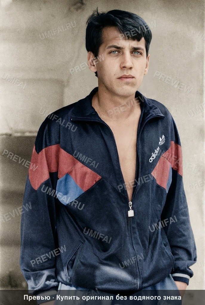 Perform meticulous non-destructive restoration and colorization of this aged photograph. Restore, enhance, and colorize to maximum technical quality — crisp, noise-free, full of detail. Add historically accurate colors. Output MUST have the EXACT same aspect ratio as the input. Colorize this existing photo using the SVEMA 130 / ORWO Color NC color palette: this film features moderate saturation with natural warm-neutral skin tones, slightly cool midtones, and a muted, grounded analog aesthetic typical of 1980s Eastern Europe. Restore all physical damage including the white chemical spots scattered across the lower left and right, the faint vertical scratches in the left background, and the grain throughout. Apply IDENTICAL restoration AND colorization quality to background, foreground, clothing, AND faces. Background: Restore the architectural wall and stairs behind the subject; remove all fading and dust spots, applying a neutral concrete-grey or muted beige tone with realistic texture. Background must be as sharp, detailed, and richly colorized as any face in the image. Foreground: Enhance the lower portion of the image, ensuring the trousers and the lower edge of the frame are free of grain and artifacts. Clothing: Restore and colorize the 1980s Adidas track jacket with high precision; define the dark navy or black primary fabric against the contrasting chevron panels which should be a muted blue or red. Preserve the fabric weave, the fine stitching of the Adidas logo on the chest, the metallic texture of the zipper pull, and the elastic ribbing on the cuffs. Edges and corners: Clean the vignette-like fading at the top and the white spots near the left edge with the same care as the center. Face and Skin: Restore the subject’s face by preserving the existing skin texture, pores, and fine hair strands without any waxy or airbrushed smoothing. Skin tone must be WARM-NEUTRAL to COOL-NEUTRAL, medium tone—strictly avoid orange, terracotta, or ghostly white hues. Ensure the eyes have natural iris detail and the hair retains sharp, individual strand definition. WARNING: You have a natural bias toward faces. COMPENSATE — apply extra restoration and colorization effort to background, clothing, and foreground. Natural analog-film palette — moderate saturation, warm-neutral tones. ALL areas processed with EQUAL quality. Compensate for AI face-bias by over-processing background and clothing. ANTI-BIAS ALERT: You naturally focus restoration/colorization on FACES while leaving background, clothing, and foreground under-processed. This is the #1 quality failure. Consciously counteract this. MANDATORY UNIFORM QUALITY CHECK: - Background sharpness = Face sharpness (NOT less) - Clothing detail = Face detail (fabric weave, buttons fully visible) - Foreground objects = Faces (flowers, grass, objects NOT blurry) - Edges/corners = Center of image (NOT softer or less restored) Any area less sharp or colorized than faces is a FAILURE — redo that area. ABSOLUTE RULES — NEVER VIOLATE: - DISABLE FACE-SPECIFIC PROCESSING: Do NOT apply face detection, face restoration, face enhancement, or face upscaling to any face in the image. Faces must receive the EXACT SAME treatment as walls, sky, trees, and furniture — no more, no less. Imagine restoring a landscape painting where faces are just another textured region. - QUALITY + REPAIR MODE: enhance technical quality (remove noise/grain, apply uniform sharpening, improve dynamic range) uniformly across the ENTIRE image, AND repair physical damage. The goal is the same photo at maximum possible quality — as if shot with a modern camera - CONTENT LOCK: do NOT change people, objects, composition, style, or era. Same scene, same identity — just technically better. Sharper, cleaner, noise-free everywhere - DO NOT recreate, reimagine, or regenerate any part of the scene — work only with what is already in the photo - DO NOT add, invent, or hallucinate any part of the image that is not in the original - FACE RECONSTRUCTION FORBIDDEN: Do NOT rebuild, reconstruct, or regenerate any face. Ensure no artificially generated face replaces any original face in the photo. Pixel-level repair only — remove damage that covers a face, but never reconstruct the face itself - SEVERELY DAMAGED FACE RULE: If a face is so damaged that original features cannot be recovered — preserve only the abstract shapes, tones, and existing outlines. DO NOT generate, imagine, or invent what the face might look like. It is better to show a blurry or partially damaged face than to show a different person's face. - WRONG IDENTITY = CRITICAL FAILURE: If the output shows a different person than the input, or a face that was generated/invented by AI, the result is completely unacceptable. A partially damaged original face is always better than a perfect AI-generated replacement face. - DO NOT change, replace, or alter any person's face, body, or identity. 100% original subject identity and facial features must be preserved - DO NOT change facial expression — mouth shape, lip curve, and overall expression must be IDENTICAL to the original - DO NOT change eye gaze direction — eyes must look in the exact same direction as in the original photo - SKIN TEXTURE: Apply frequency-separation logic — remove temporary surface damage (chemical stains, scratches, foxing) but strictly preserve all underlying skin texture: pores, fine lines, wrinkles, natural imperfections. Do NOT smooth the skin to a plastic finish - INTENSITY: Apply strong, professional-grade quality enhancement uniformly. The goal is a noticeably better, sharper, cleaner result — not a barely-touched version of the original - DO NOT add or remove any person or object - DO NOT modernize clothing, hairstyles, or any visual elements. Preserve the original era, style, and visual aesthetic of the photo - FILM GRAIN / NOISE = DEFECTS: Film grain, sensor noise, and age-related softness are technical defects to ELIMINATE — they a