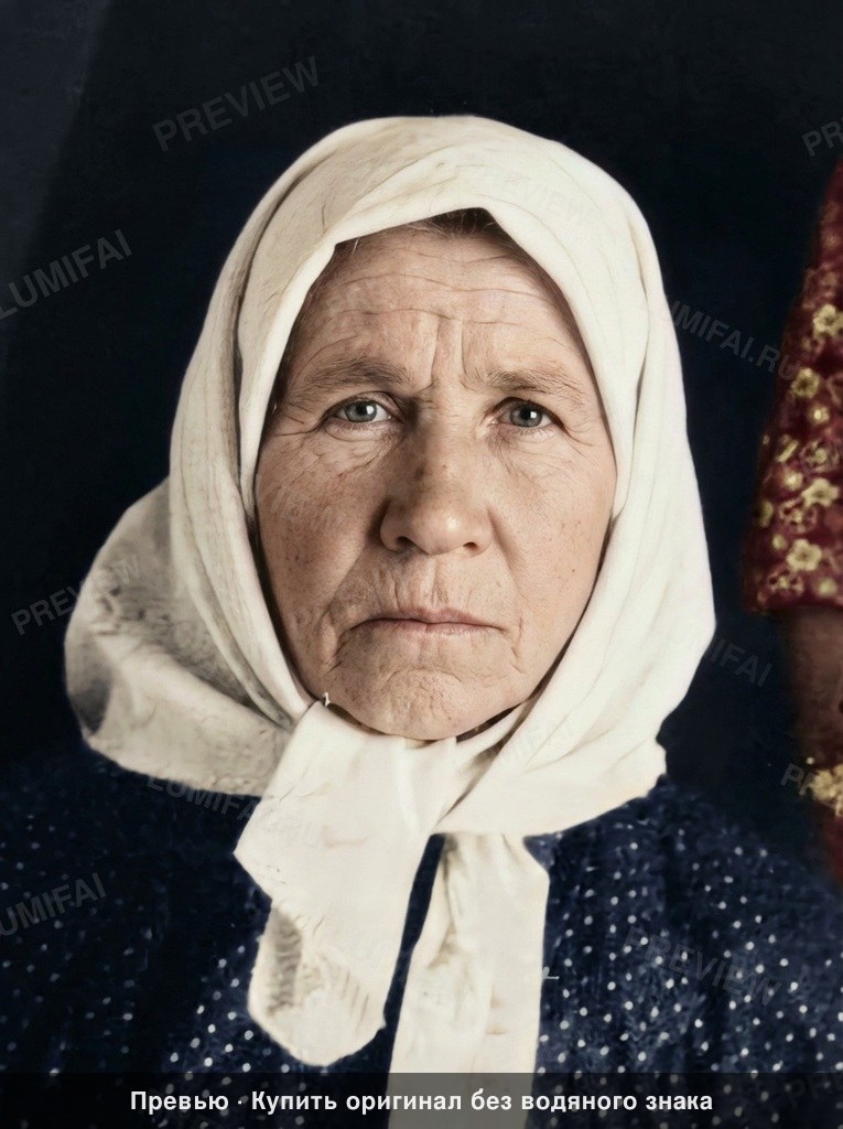 Colorize the EXISTING photograph using SVEMA 32/64 color palette: this palette features slightly cool shadows with natural, accurate midtones and a moderate contrast ratio typical of mid-century Eastern European film. It prioritizes realistic skin tones and a grounded, life-like color depth without excessive digital vibrance. 1. Damage map: Remove the circular white chemical spot at the top center, eliminate the fine vertical scratches running through the right side of the subject, and resolve the fading and grain clusters in the upper-left black void. 2. Background: Restore the deep black background to a clean, light-absorbent texture with deep charcoal and midnight-blue undertones; ensure the colorization is uniform and free of mottling or digital noise. 3. Foreground and Accessories: Restore the light-colored headscarf (platok) by removing all dust and speckles; colorize it in a soft, natural cream or off-white. Ensure every fold, crease, and the subtle weave of the fabric is rendered with extreme sharpness and tactile detail. 4. Clothing: Restore and colorize the dark patterned blouse; the base fabric should be a deep navy or dark forest green with crisp, distinctly colorized white polka dots. Enhance the fabric texture to show the weight and grain of the material. Identify and colorize the floral-patterned fabric visible on the far right edge with muted organic tones (deep reds or dull golds) to match the mid-century Soviet aesthetic. 5. Edges and Corners: Apply identical restoration and colorization quality to the extreme edges; remove all silvering, fogging, and corner wear to ensure a high-fidelity frame. 6. Face: Restore the skin while preserving all authentic age lines, wrinkles, and natural textures. Colorize with a warm-neutral Eastern European skin tone—avoiding all orange, pink, or ghostly grey tones. Focus on the iris detail, restoring the subtle light reflection in the eyes to make them look alive and sharp. Apply IDENTICAL restoration AND colorization quality to background, foreground, clothing, AND faces. The background must be as sharp and richly colorized as the face. You have a natural bias toward faces; COMPENSATE by applying extra restoration and colorization effort to the headscarf and clothing textures. Natural analog-film palette—moderate saturation, warm-neutral tones. ALL areas processed with EQUAL quality. ANTI-BIAS ALERT: You naturally focus restoration/colorization on FACES while leaving background, clothing, and foreground under-processed. This is the #1 quality failure. Consciously counteract this. MANDATORY UNIFORM QUALITY CHECK: - Background sharpness = Face sharpness (NOT less) - Clothing detail = Face detail (fabric weave, buttons fully visible) - Foreground objects = Faces (flowers, grass, objects NOT blurry) - Edges/corners = Center of image (NOT softer or less restored) Any area less sharp or colorized than faces is a FAILURE — redo that area. ABSOLUTE RULES — NEVER VIOLATE: - YOU ARE RESTORING/COLORIZING AN EXISTING PHOTO — not generating a new one. Every pixel must correspond to the original image. - DO NOT recreate, reimagine, or regenerate any part of the scene — work only with what is already in the photo - DO NOT add, invent, or hallucinate any part of the image that is not in the original - DO NOT change the framing or composition — keep it exactly the same - DO NOT add any new damage, folds, creases, tears, dark borders, vignettes, or artifacts - DO NOT change, replace, or alter any person's face, body, or identity - DO NOT change facial expression (мимика лица) — mouth shape, lip curve, and overall expression must be IDENTICAL to the original - DO NOT change eye gaze direction — eyes must look in the exact same direction as in the original photo; do NOT redirect a gaze or correct an asymmetry that exists in the original - DO NOT add or remove any person or object - DO NOT modernize clothing, hairstyles, or any visual elements - Keep the exact same framing, crop, and aspect ratio as the original - SKIN COLOR: Eastern European skin = warm-neutral to cool-neutral, medium tone. NEVER red or orange. NEVER ghostly pale or washed-out. NEVER airbrushed or plastic. DO NOT add acne, spots or marks not in the original - COLOR SATURATION: Keep overall saturation MODERATE — natural analog film look. NOT vivid digital. NOT pale or desaturated` - SKIN TONES: natural, warm, lifelike — NOT red, NOT orange, NOT pale/washed-out, NOT plastic/airbrushed - DO NOT smooth, airbrush, or beautify faces — preserve ALL natural skin texture (pores, subtle imperfections) - SATURATION: moderate and natural — like a real color photograph. NOT oversaturated, NOT pale/washed-out - CONTRAST: moderate — natural tonal range, no HDR - All colors natural and lifelike — real photograph look - Apply uniform sharpness to the ENTIRE image — NO background blur