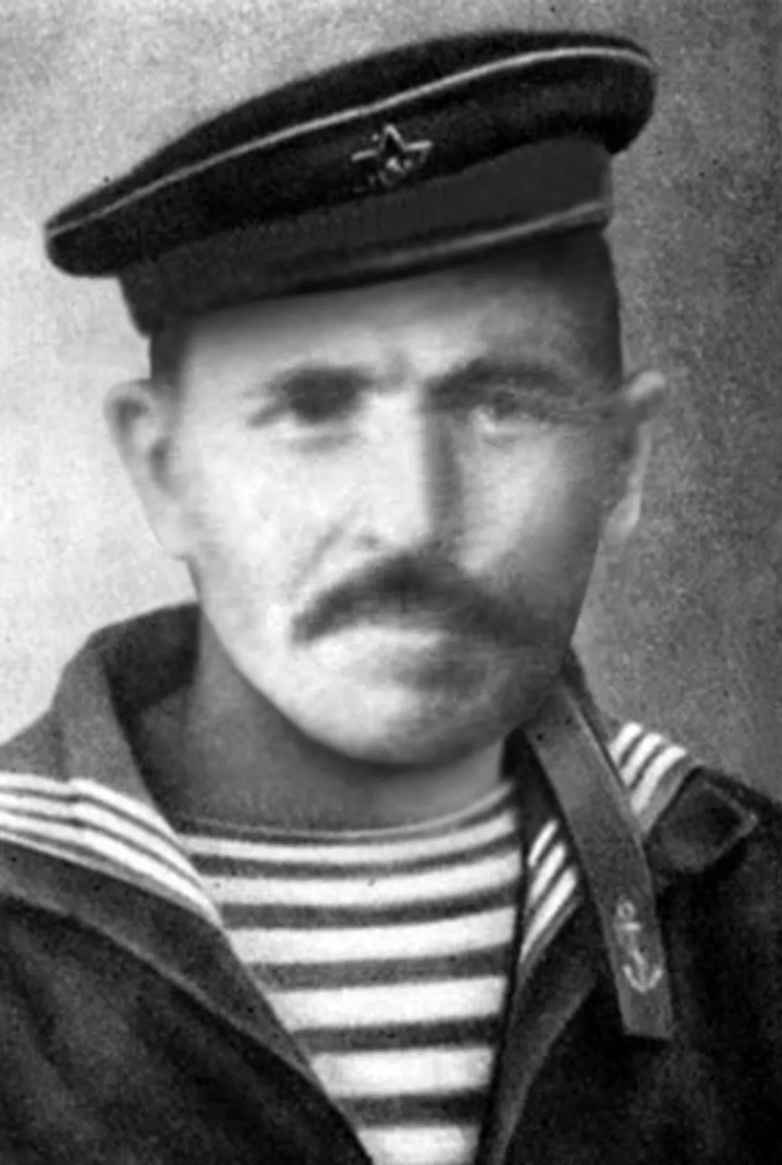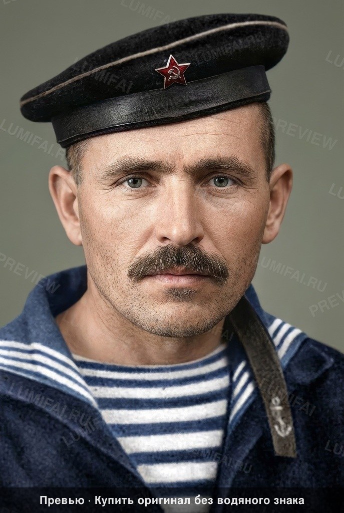 Perform meticulous non-destructive restoration and colorization of this aged photograph. Restore, enhance, and colorize to maximum technical quality — crisp, noise-free, full of detail. Add historically accurate colors. Output MUST have the EXACT same aspect ratio as the input. Colorize the EXISTING photograph using SVEMA 32/64 color palette: moderate saturation, natural warm-neutral skin tones, slightly cool midtones, and balanced contrast typical of mid-century Soviet film stocks. Damage map: Remove heavy grain, chemical speckling, and surface noise concentrated in the background and upper corners. Fix the slight blur and low-contrast haze affecting the edges and bottom portion of the image. Background/environment: Restore the studio backdrop to a clean, noise-free surface. Colorize with a neutral, slightly cool grey-blue or olive-grey palette, ensuring no color bleeding from the subject. Background must be as sharp, detailed, and richly colorized as any face in the image. Foreground objects: Deeply restore and sharpen the sailor's cap (beskozyrka), specifically the star insignia (red enamel detail with gold/brass trim) and the leather/cloth band texture. The black cap should have blue-black depth with no crushed blacks. Clothing: Restore the Soviet naval uniform (bushel) and the striped telnyashka. Colorize the outer jacket in deep navy blue, showing clear fabric weave and stitching. The telnyashka stripes must be crisp white and navy blue, free of yellowing or stains. The tally (hat ribbon) with the anchor icon must show clear leather-like texture and metallic silver/gold embroidery. Apply extra restoration and colorization effort to background and clothing to compensate for AI face-bias. Edges/corners: Remove all vignette fading and film grain from the peripheral areas, maintaining the same sharpness as the center. Face: Restore the skin with a natural warm-neutral to cool-neutral Soviet palette — NOT orange, red, or plastic. Recover real skin texture, including the coarse texture of the mustache, individual eyebrow hairs, and natural eye iris detail. Facial features must remain sharp but historically grounded, avoiding a waxy or over-smoothed appearance. Natural analog-film palette — moderate saturation, warm-neutral tones. ALL areas processed with EQUAL quality. Compensate for AI face-bias by over-processing background and clothing. ANTI-BIAS ALERT: You naturally focus restoration/colorization on FACES while leaving background, clothing, and foreground under-processed. This is the #1 quality failure. Consciously counteract this. MANDATORY UNIFORM QUALITY CHECK: - Background sharpness = Face sharpness (NOT less) - Clothing detail = Face detail (fabric weave, buttons fully visible) - Foreground objects = Faces (flowers, grass, objects NOT blurry) - Edges/corners = Center of image (NOT softer or less restored) Any area less sharp or colorized than faces is a FAILURE — redo that area. ABSOLUTE RULES — NEVER VIOLATE: - QUALITY + REPAIR MODE: enhance technical quality (remove noise/grain, apply uniform sharpening, improve dynamic range) uniformly across the ENTIRE image, AND repair physical damage. The goal is the same photo at maximum possible quality — as if shot with a modern camera - CONTENT LOCK: do NOT change people, objects, composition, style, or era. Same scene, same identity — just technically better. Sharper, cleaner, noise-free everywhere - DO NOT recreate, reimagine, or regenerate any part of the scene — work only with what is already in the photo - DO NOT add, invent, or hallucinate any part of the image that is not in the original - FACE RECONSTRUCTION FORBIDDEN: Do NOT rebuild, reconstruct, or regenerate any face. Ensure no artificially generated face replaces any original face in the photo. Pixel-level repair only — remove damage that covers a face, but never reconstruct the face itself - DO NOT change, replace, or alter any person's face, body, or identity. 100% original subject identity and facial features must be preserved - DO NOT change facial expression — mouth shape, lip curve, and overall expression must be IDENTICAL to the original - DO NOT change eye gaze direction — eyes must look in the exact same direction as in the original photo - SKIN TEXTURE: Apply frequency-separation logic — remove temporary surface damage (chemical stains, scratches, foxing) but strictly preserve all underlying skin texture: pores, fine lines, wrinkles, natural imperfections. Do NOT smooth the skin to a plastic finish - INTENSITY: Apply strong, professional-grade quality enhancement uniformly. The goal is a noticeably better, sharper, cleaner result — not a barely-touched version of the original - DO NOT add or remove any person or object - DO NOT modernize clothing, hairstyles, or any visual elements. Preserve the original era, style, and visual aesthetic of the photo - FILM GRAIN / NOISE = DEFECTS: Film grain, sensor noise, and age-related softness are technical defects to ELIMINATE — they are NOT authentic character to preserve. Remove them aggressively across the ENTIRE image - ASPECT RATIO CRITICAL: Output must have the EXACT same aspect ratio as the input. DO NOT crop, add borders, expand canvas, or shift composition. Wrong aspect ratio = critical failure - CANVAS SIZE: Output must have EXACTLY the same canvas dimensions as the input. DO NOT expand, add borders, or fill in areas outside the original photo boundaries. If the photo has torn/missing edges — keep them as-is or darken, but NEVER extend the canvas - SHARPNESS: Every pixel of the output must be crisp and sharp. NO softness, NO blur, NO smoothing anywhere. Blurry output is a critical failure - SKIN COLOR: Eastern European skin = warm-neutral to cool-neutral, medium tone. NEVER red or orange. NEVER ghostly pale or washed-out. NEVER airbrushed or plastic. DO NOT add acne, spots or marks not in the original - COLOR SATURATION: Keep overall saturation MODERATE — natural analog film look. NOT