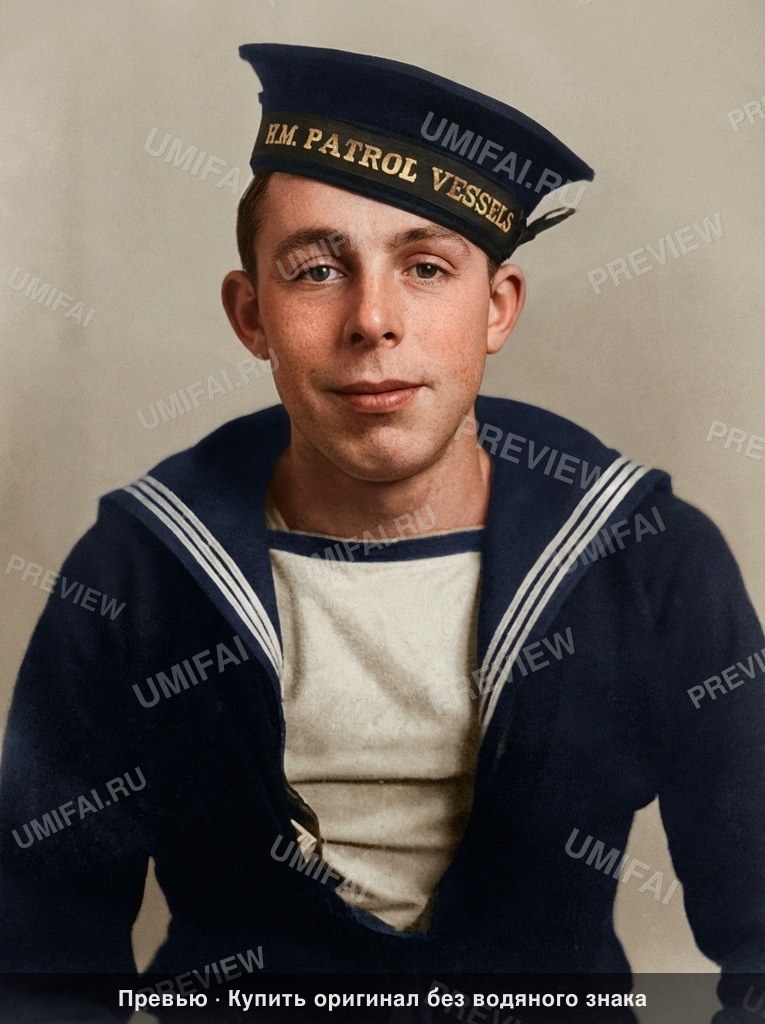 Perform meticulous non-destructive restoration and colorization of this aged photograph. Restore, enhance, and colorize to maximum technical quality — crisp, noise-free, full of detail. Add historically accurate colors. Output MUST have the EXACT same aspect ratio as the input. Colorize the EXISTING photograph using Kodachrome I color palette: rich but natural saturation with warm red-orange skin tones and slightly yellow highlights. Shadows should remain deep and neutral with a warm overall vintage cast characteristic of 1940s British naval portraiture. DAMAGE MAP: Target the heavy horizontal crackle and emulsion loss spanning the chest and shoulders. Remove the vertical hairline scratches running through the face, cap, and right arm. Eliminate the chemical spotting and foxing in the background and the significant surface ablation on the "H.M. PATROL VESSELS" tally and sailor's cap. BACKGROUND/ENVIRONMENT: Apply IDENTICAL restoration quality to the studio backdrop. Remove all grey mold spots, yellowing stains, and grain noise. Transition the faded taupe background into a clean, smooth, neutral-warm studio tone with subtle, natural depth. Background must be as sharp and noise-free as the subject. CLOTHING AND CAP: Restore the dark navy blue wool of the seaman's jumper and trousers, removing the massive network of white cracks to reveal the heavy fabric weave, stitching, and seams. Colorize the jumper in deep British Royal Navy blue. Restore the white flared collar stripes and under-frock to a clean, natural off-white. Meticulously repair the cap (HMS tally), ensuring the gold-thread lettering is sharp, legible, and metallic in tone. Clothing must show full texture, not a flat mass of color. EDGES AND CORNERS: Restore the severe corner fading and edge wear. Ensure the same high-resolution detail and consistent color saturation reaches the very perimeter of the frame. FACES AND SKIN: Restore skin by removing scratches across the nose, forehead, and chin while preserving all original texture, pores, and natural shadows. Apply a warm-neutral Mediterranean/British complexion—avoiding waxy, orange, or grey tones. Enhance the iris detail and eye clarity without artificial sharpening. WARNING: You have a natural bias toward faces. COMPENSATE—apply extra restoration and colorization effort to background, clothing, and the cap tally. Natural analog-film palette—moderate saturation, warm-neutral tones. ALL areas processed with EQUAL quality. Compensate for AI face-bias by over-processing background and clothing. ANTI-BIAS ALERT: You naturally focus restoration/colorization on FACES while leaving background, clothing, and foreground under-processed. This is the #1 quality failure. Consciously counteract this. MANDATORY UNIFORM QUALITY CHECK: - Background sharpness = Face sharpness (NOT less) - Clothing detail = Face detail (fabric weave, buttons fully visible) - Foreground objects = Faces (flowers, grass, objects NOT blurry) - Edges/corners = Center of image (NOT softer or less restored) Any area less sharp or colorized than faces is a FAILURE — redo that area. ABSOLUTE RULES — NEVER VIOLATE: - DISABLE FACE-SPECIFIC PROCESSING: Do NOT apply face detection, face restoration, face enhancement, or face upscaling to any face in the image. Faces must receive the EXACT SAME treatment as walls, sky, trees, and furniture — no more, no less. Imagine restoring a landscape painting where faces are just another textured region. - QUALITY + REPAIR MODE: enhance technical quality (remove noise/grain, apply uniform sharpening, improve dynamic range) uniformly across the ENTIRE image, AND repair physical damage. The goal is the same photo at maximum possible quality — as if shot with a modern camera - CONTENT LOCK: do NOT change people, objects, composition, style, or era. Same scene, same identity — just technically better. Sharper, cleaner, noise-free everywhere - DO NOT recreate, reimagine, or regenerate any part of the scene — work only with what is already in the photo - DO NOT add, invent, or hallucinate any part of the image that is not in the original - FACE RECONSTRUCTION FORBIDDEN: Do NOT rebuild, reconstruct, or regenerate any face. Ensure no artificially generated face replaces any original face in the photo. Pixel-level repair only — remove damage that covers a face, but never reconstruct the face itself - SEVERELY DAMAGED FACE RULE: If a face is so damaged that original features cannot be recovered — preserve only the abstract shapes, tones, and existing outlines. DO NOT generate, imagine, or invent what the face might look like. It is better to show a blurry or partially damaged face than to show a different person's face. - WRONG IDENTITY = CRITICAL FAILURE: If the output shows a different person than the input, or a face that was generated/invented by AI, the result is completely unacceptable. A partially damaged original face is always better than a perfect AI-generated replacement face. - DO NOT change, replace, or alter any person's face, body, or identity. 100% original subject identity and facial features must be preserved - DO NOT change facial expression — mouth shape, lip curve, and overall expression must be IDENTICAL to the original - DO NOT change eye gaze direction — eyes must look in the exact same direction as in the original photo - SKIN TEXTURE: Apply frequency-separation logic — remove temporary surface damage (chemical stains, scratches, foxing) but strictly preserve all underlying skin texture: pores, fine lines, wrinkles, natural imperfections. Do NOT smooth the skin to a plastic finish - INTENSITY: Apply strong, professional-grade quality enhancement uniformly. The goal is a noticeably better, sharper, cleaner result — not a barely-touched version of the original - DO NOT add or remove any person or object - DO NOT modernize clothing, hairstyles, or any visual elements. Preserve the original era, style, and visual aesthetic of the photo - FILM GR