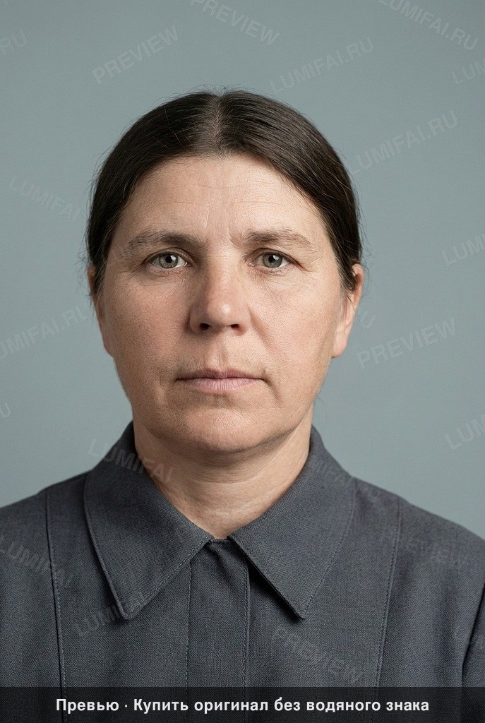 Perform meticulous non-destructive restoration and colorization of this aged photograph. Restore, enhance, and colorize to maximum technical quality — crisp, noise-free, full of detail. Add historically accurate colors. Output MUST have the EXACT same aspect ratio as the input. Colorize the EXISTING photograph using SVEMA 32/64 color palette: This palette features slightly cool midtones, natural warm-neutral skin tones, and moderate contrast characteristic of mid-century Eastern European photography. Shadows should be deep but retain detail, while highlights remain soft and natural without clipping. 1. Damage Map: Remove heavy grain, chemical spotting, and mottled texture across the entire image. Eliminate the circular stains in the upper left background and the horizontal white crease/tear blocking the lower chest area. 2. Background: Restore the uniform neutral studio background. Remove all spotting, uneven fading, and grain. Colorize with a soft, muted grey-blue or warm-grey tone consistent with mid-20th-century Soviet studio portraiture. The background must be as sharp, noise-free, and richly processed as the subject. 3. Foreground/Edges: Repair all fading and chemical degradation at the far edges and corners. Apply identical restoration quality to the bottom-most visible portion of the garment that has been heavily washed out. 4. Clothing: Restore the structural detail of the collared garment. Enhance the fabric weave, collar stitching, and shadow folds. Colorize the clothing in a historically accurate muted navy blue or charcoal grey, ensuring consistent saturation and sharpness from the center to the edges of the frame. 5. Face/Hair: Restore hair to show individual strands, especially at the hairline and part, using natural dark brown or black tones. Restore eyes to show clear iris detail and natural light reflection. 6. Skin Tones: Apply a natural Eastern European warm-neutral skin tone. STRICTLY FORBIDDEN: red, orange, terracotta, or ghostly white skin. Preserve and enhance existing skin texture, pores, and natural facial lines without airbrushing or smoothing. Skin must look alive and detailed, not waxy. Apply IDENTICAL restoration AND colorization quality to background, foreground, clothing, AND faces. WARNING: You have a natural bias toward faces. COMPENSATE — apply extra restoration and colorization effort to the background, clothing, and edges. Natural analog-film palette — moderate saturation, warm-neutral tones. ALL areas processed with EQUAL quality. Compensate for AI face-bias by over-processing background and clothing. ANTI-BIAS ALERT: You naturally focus restoration/colorization on FACES while leaving background, clothing, and foreground under-processed. This is the #1 quality failure. Consciously counteract this. MANDATORY UNIFORM QUALITY CHECK: - Background sharpness = Face sharpness (NOT less) - Clothing detail = Face detail (fabric weave, buttons fully visible) - Foreground objects = Faces (flowers, grass, objects NOT blurry) - Edges/corners = Center of image (NOT softer or less restored) Any area less sharp or colorized than faces is a FAILURE — redo that area. ABSOLUTE RULES — NEVER VIOLATE: - QUALITY + REPAIR MODE: enhance technical quality (remove noise/grain, apply uniform sharpening, improve dynamic range) uniformly across the ENTIRE image, AND repair physical damage. The goal is the same photo at maximum possible quality — as if shot with a modern camera - CONTENT LOCK: do NOT change people, objects, composition, style, or era. Same scene, same identity — just technically better. Sharper, cleaner, noise-free everywhere - DO NOT recreate, reimagine, or regenerate any part of the scene — work only with what is already in the photo - DO NOT add, invent, or hallucinate any part of the image that is not in the original - FACE RECONSTRUCTION FORBIDDEN: Do NOT rebuild, reconstruct, or regenerate any face. Ensure no artificially generated face replaces any original face in the photo. Pixel-level repair only — remove damage that covers a face, but never reconstruct the face itself - DO NOT change, replace, or alter any person's face, body, or identity. 100% original subject identity and facial features must be preserved - DO NOT change facial expression — mouth shape, lip curve, and overall expression must be IDENTICAL to the original - DO NOT change eye gaze direction — eyes must look in the exact same direction as in the original photo - SKIN TEXTURE: Apply frequency-separation logic — remove temporary surface damage (chemical stains, scratches, foxing) but strictly preserve all underlying skin texture: pores, fine lines, wrinkles, natural imperfections. Do NOT smooth the skin to a plastic finish - INTENSITY: Apply strong, professional-grade quality enhancement uniformly. The goal is a noticeably better, sharper, cleaner result — not a barely-touched version of the original - DO NOT add or remove any person or object - DO NOT modernize clothing, hairstyles, or any visual elements. Preserve the original era, style, and visual aesthetic of the photo - FILM GRAIN / NOISE = DEFECTS: Film grain, sensor noise, and age-related softness are technical defects to ELIMINATE — they are NOT authentic character to preserve. Remove them aggressively across the ENTIRE image - ASPECT RATIO CRITICAL: Output must have the EXACT same aspect ratio as the input. DO NOT crop, add borders, expand canvas, or shift composition. Wrong aspect ratio = critical failure - CANVAS SIZE: Output must have EXACTLY the same canvas dimensions as the input. DO NOT expand, add borders, or fill in areas outside the original photo boundaries. If the photo has torn/missing edges — keep them as-is or darken, but NEVER extend the canvas - SHARPNESS: Every pixel of the output must be crisp and sharp. NO softness, NO blur, NO smoothing anywhere. Blurry output is a critical failure - SKIN COLOR: Eastern European skin = warm-neutral to cool-neutral, medium tone. NEVER red or orange.