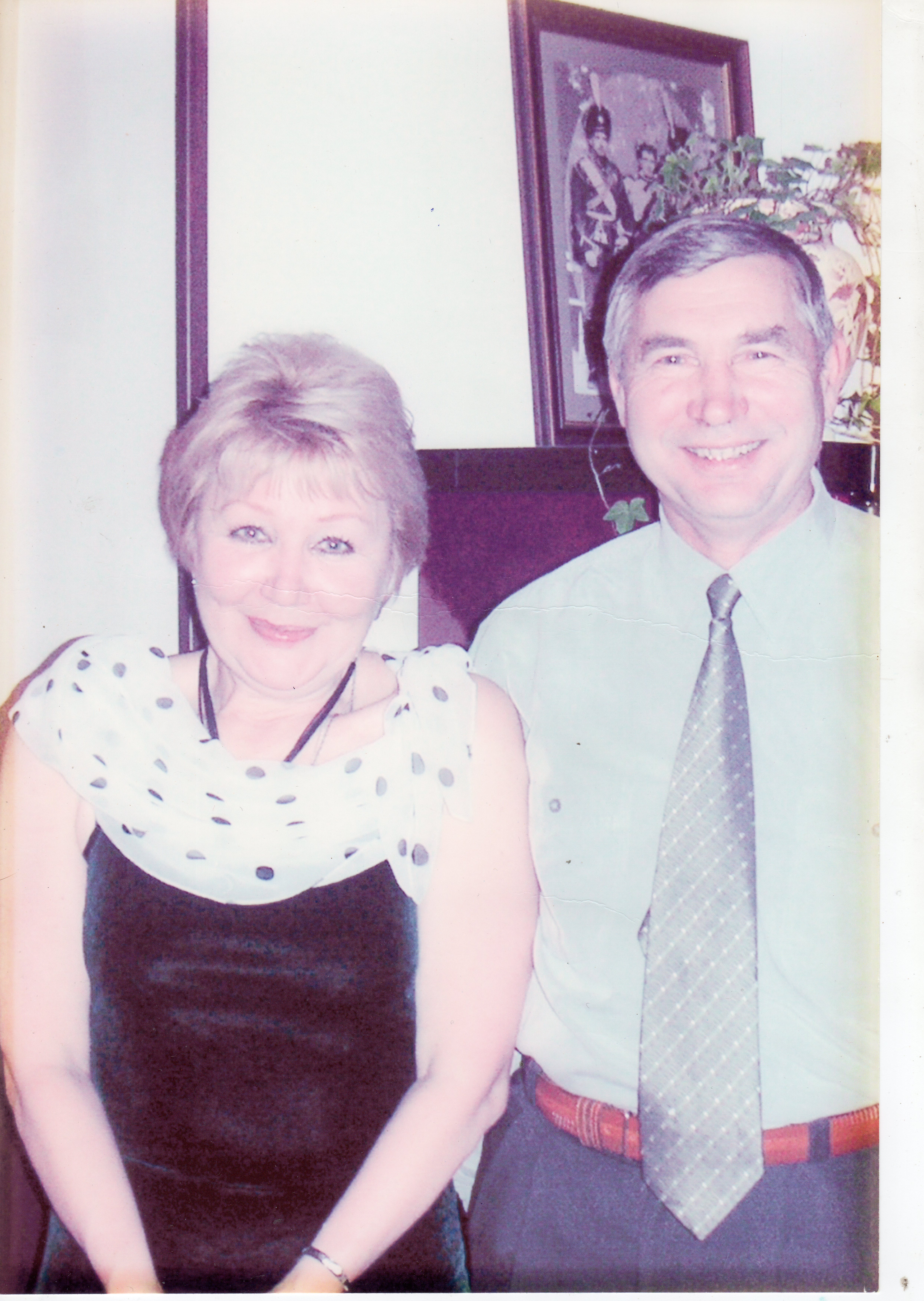 Colorize the EXISTING photograph using late 1980s-1990s TASMA / late SVEMA color palette: this palette features natural, warm-neutral skin tones with moderate saturation and realistic contrast. Midtones are grounded and earthy, while shadows remain deep and neutral without color cast. Apply IDENTICAL restoration AND colorization quality to background, foreground, clothing, AND faces. This image has significant fading and chemical "blooming" or overexposure in the highlights (woman’s shoulder and chest area) and dust specks scattered throughout the center and right side. BACKGROUND: Restore the cream-colored walls, eliminating the overexposed hazy glow. Colorize the wooden picture frame to a deep mahogany brown and the image within (a military or formal portrait) with muted, realistic tones. Restore the green plant leaves and the decorative ceramic pot on the right, ensuring sharp edges and natural, deep green hues. FOREGROUND & EDGES: Remove all dust spots and chemical staining from the lower edges and corners. The dark surface behind the subjects (likely a piano or lacquered furniture) must be restored to a high-gloss deep brown/black with realistic reflections, removing the purple-tinted fading. Restore the woman’s silver watch and the man’s leather belt with metallic and leather textures respectively. CLOTHING: Restore the woman’s black velvet dress to a rich, deep black with visible plush texture, and her white polka-dot scarf to a crisp, semi-translucent fabric with clearly defined dark dots, removing the highlight "bleeding" on her shoulder. Restore the man’s light-colored dress shirt to a subtle mint-green or light blue, showing clear fabric weave and button details. Colorize his tie with a subtle silk sheen and a distinct geometric pattern. FACES: Restore facial features by removing the grain and "blown out" white areas. Recover micro-detail in the hair (individual blonde and grey-brown strands) and iris detail in the eyes. SKIN TONE: Apply a natural WARM-NEUTRAL Eastern European skin tone. Do NOT use orange, pink, or ghostly white. Skin must looks alive and healthy but realistic, preserving all original lines and textures without airbrushing. WARNING: You have a natural bias toward faces. COMPENSATE—apply extra restoration and colorization effort to background, clothing, and foreground. Natural analog-film palette—moderate saturation, warm-neutral tones. ALL areas processed with EQUAL quality. ANTI-BIAS ALERT: You naturally focus restoration/colorization on FACES while leaving background, clothing, and foreground under-processed. This is the #1 quality failure. Consciously counteract this. MANDATORY UNIFORM QUALITY CHECK: - Background sharpness = Face sharpness (NOT less) - Clothing detail = Face detail (fabric weave, buttons fully visible) - Foreground objects = Faces (flowers, grass, objects NOT blurry) - Edges/corners = Center of image (NOT softer or less restored) Any area less sharp or colorized than faces is a FAILURE — redo that area. ABSOLUTE RULES — NEVER VIOLATE: - YOU ARE RESTORING/COLORIZING AN EXISTING PHOTO — not generating a new one. Every pixel must correspond to the original image. - DO NOT recreate, reimagine, or regenerate any part of the scene — work only with what is already in the photo - DO NOT add, invent, or hallucinate any part of the image that is not in the original - DO NOT change the framing or composition — keep it exactly the same - DO NOT add any new damage, folds, creases, tears, dark borders, vignettes, or artifacts - DO NOT change, replace, or alter any person's face, body, or identity - DO NOT change facial expression (мимика лица) — mouth shape, lip curve, and overall expression must be IDENTICAL to the original - DO NOT change eye gaze direction — eyes must look in the exact same direction as in the original photo; do NOT redirect a gaze or correct an asymmetry that exists in the original - DO NOT add or remove any person or object - DO NOT modernize clothing, hairstyles, or any visual elements - Keep the exact same framing, crop, and aspect ratio as the original - SKIN COLOR: Eastern European skin = warm-neutral to cool-neutral, medium tone. NEVER red or orange. NEVER ghostly pale or washed-out. NEVER airbrushed or plastic. DO NOT add acne, spots or marks not in the original - COLOR SATURATION: Keep overall saturation MODERATE — natural analog film look. NOT vivid digital. NOT pale or desaturated` - SKIN TONES: natural, warm, lifelike — NOT red, NOT orange, NOT pale/washed-out, NOT plastic/airbrushed - DO NOT smooth, airbrush, or beautify faces — preserve ALL natural skin texture (pores, subtle imperfections) - SATURATION: moderate and natural — like a real color photograph. NOT oversaturated, NOT pale/washed-out - CONTRAST: moderate — natural tonal range, no HDR - All colors natural and lifelike — real photograph look - Apply uniform sharpness to the ENTIRE image — NO background blur