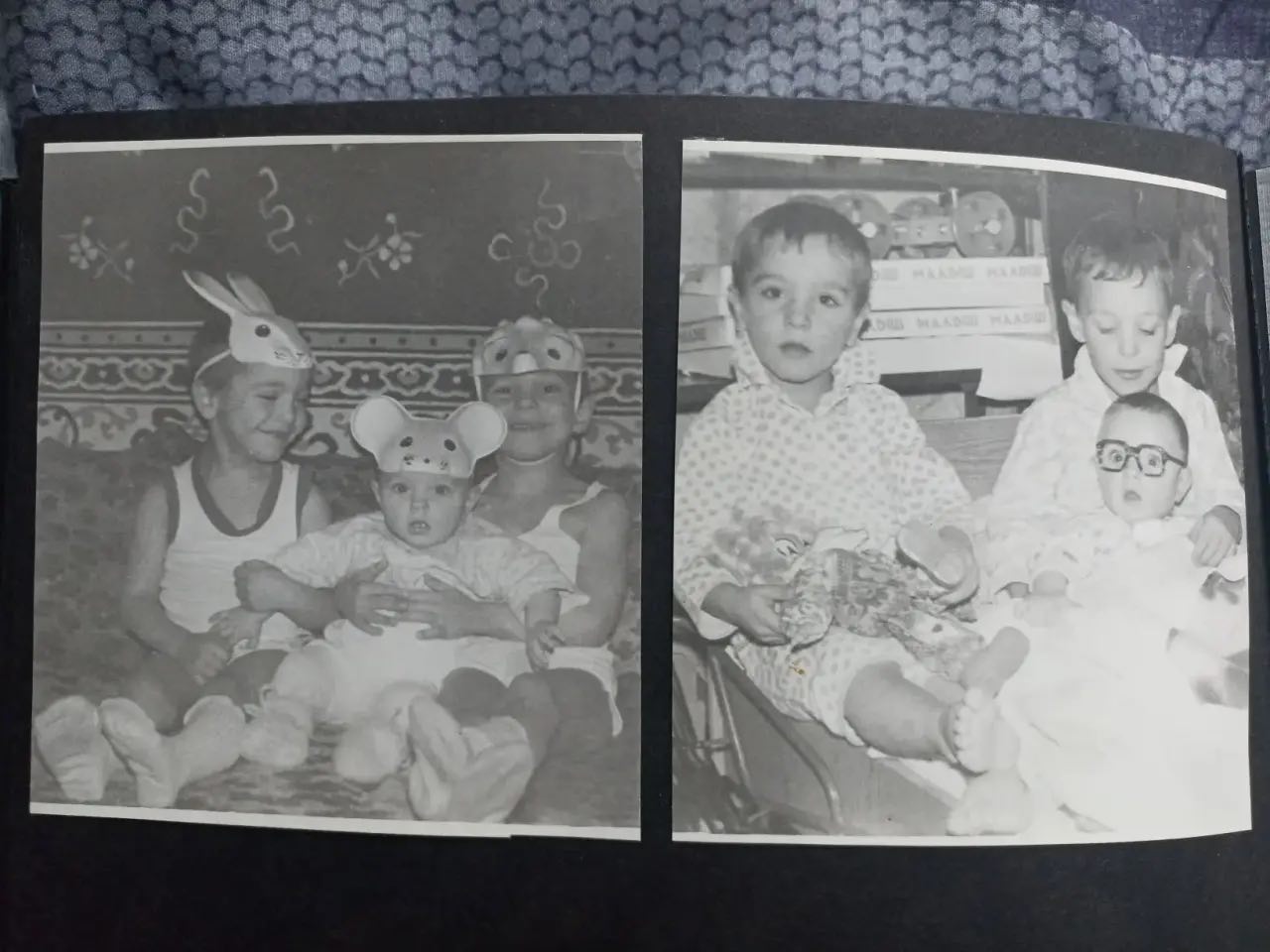 Restore and enhance the following black and white photograph featuring four children: 1. On the left, there are three children: - The first child on the left, wearing a bunny hat, has a round face and is sitting cross-legged. - The second child, in the middle, is wearing a mouse hat and is holding a toy, with a joyful expression. - The third child on the right has short hair and looks slightly older, also sitting cross-legged. 2. On the right, there are another two children: - The first child on the left is wearing glasses, white pajamas, and holding a stuffed toy. - The second child on the right is wearing a light-colored shirt and is sitting on a chair. Era: 1970s, in a cozy indoor setting with patterned wallpaper and children's toys in the background. Specific damage includes: - Scratches and visible folds across both images, especially prominent on the left side. - Stains are noticeable near the bottom of the left photo. - Fading across the whole image, with loss of contrast and detail. Quality enhancements needed: - Increase sharpness and micro-detail, particularly in hair and facial features. - Improve tonal contrast and dynamic range to bring life back to the photo. - Reduce any film grain while maintaining natural texture. - Recover lost detail in shadows and highlights, especially on the children's faces. - Ensure that the faces appear crisp and detailed, emphasizing eyes, lips, and skin texture. Please proceed with the restoration and enhancement as specified. ABSOLUTE RULES — NEVER VIOLATE: - DO NOT add, invent, or hallucinate any part of the image that is not in the original (do not extend cropped areas, do not fill missing parts with invented content) - DO NOT change the framing or composition — if the photo is cropped, keep it cropped exactly the same way - DO NOT add any new damage, folds, creases, tears, dark borders, vignettes, or artifacts - DO NOT colorize — if the photo is black and white, the output must be black and white - DO NOT change, replace, or alter any person's face, body, or identity - DO NOT add or remove any person or object - DO NOT modernize clothing, hairstyles, or any visual elements - ONLY fix what is already damaged — remove existing scratches, tears, stains, fading - Keep the exact same framing, crop, and aspect ratio as the original