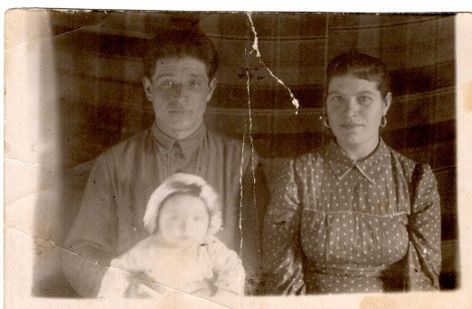1. Remove physical damage: Address scratches, tears, folds, and stains across the entire image, focusing on the prominent vertical tear between the two adults and any fading or mold spots.